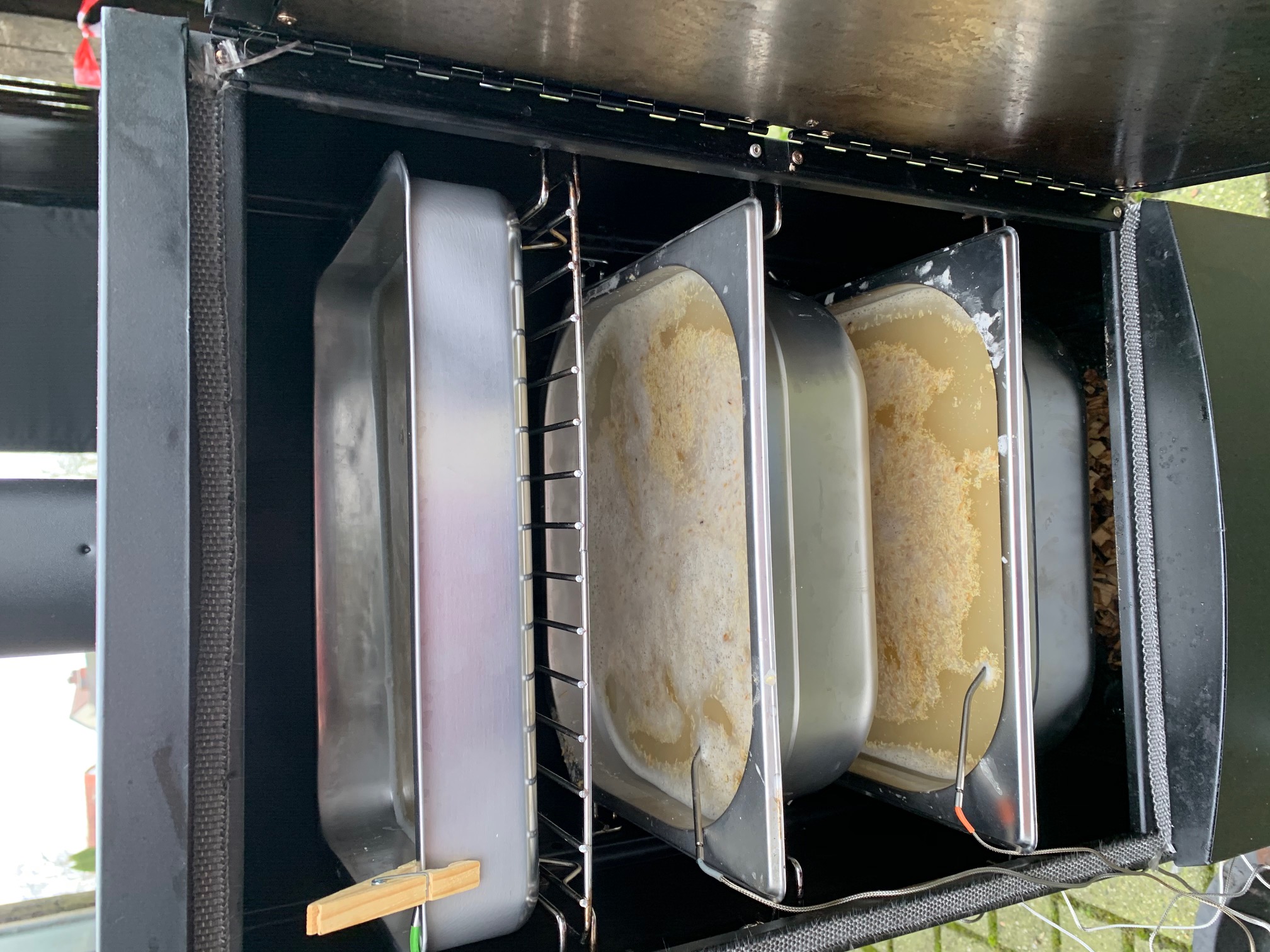 Von dem HG wurden 7,2 L auf 71° erhitzt, hier habe ich 2,4 Kg Malz eingemaischt, sodass eine Zieltemperatur von 60° erreicht wurde. Diese Maische wurde auf 2 GNs und einen Koncis aufgeteilt (BBQer kennen diese praktischen Schalen aus dem Schwedischen Brau- und Barbequebedarfshandel) und in den auf ca. 120-130° vorgeheizten Smoker geschoben. Alle drei haben ein Bratenthermometer erhalten. Anschließend wurden ordentlich Holzchunks (Buche und Kirsche zu je 50%) reingegeben. Die Chunks waren vorher für ca. 1h in Wasser eingelegt, damit sie schön langsam den Rauch abgeben.