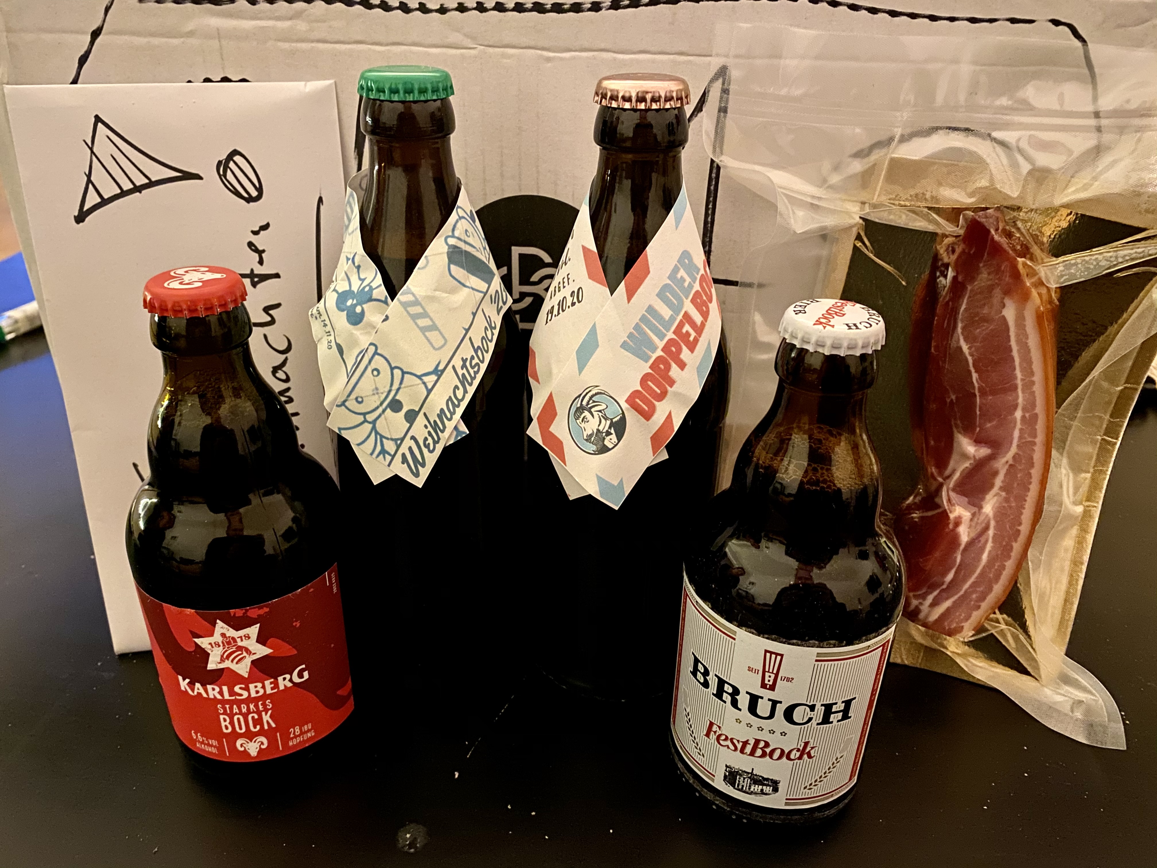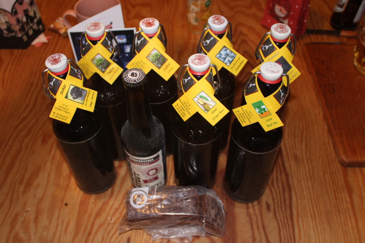 Ja, und zwar von Sylvie und Björn und es sind nicht irgendwelche Flaschen sondern fünf verschiedene selbstgebraute mit einem Kaufbier plus Kekse. Die Kekse sind sehr lecker! Und der Brief den ihr mir geschrieben habt wird mich veranlassen, genauso freundlich akkurat und ordentlich eine Rezession zu euren Kreationen abzugeben!!