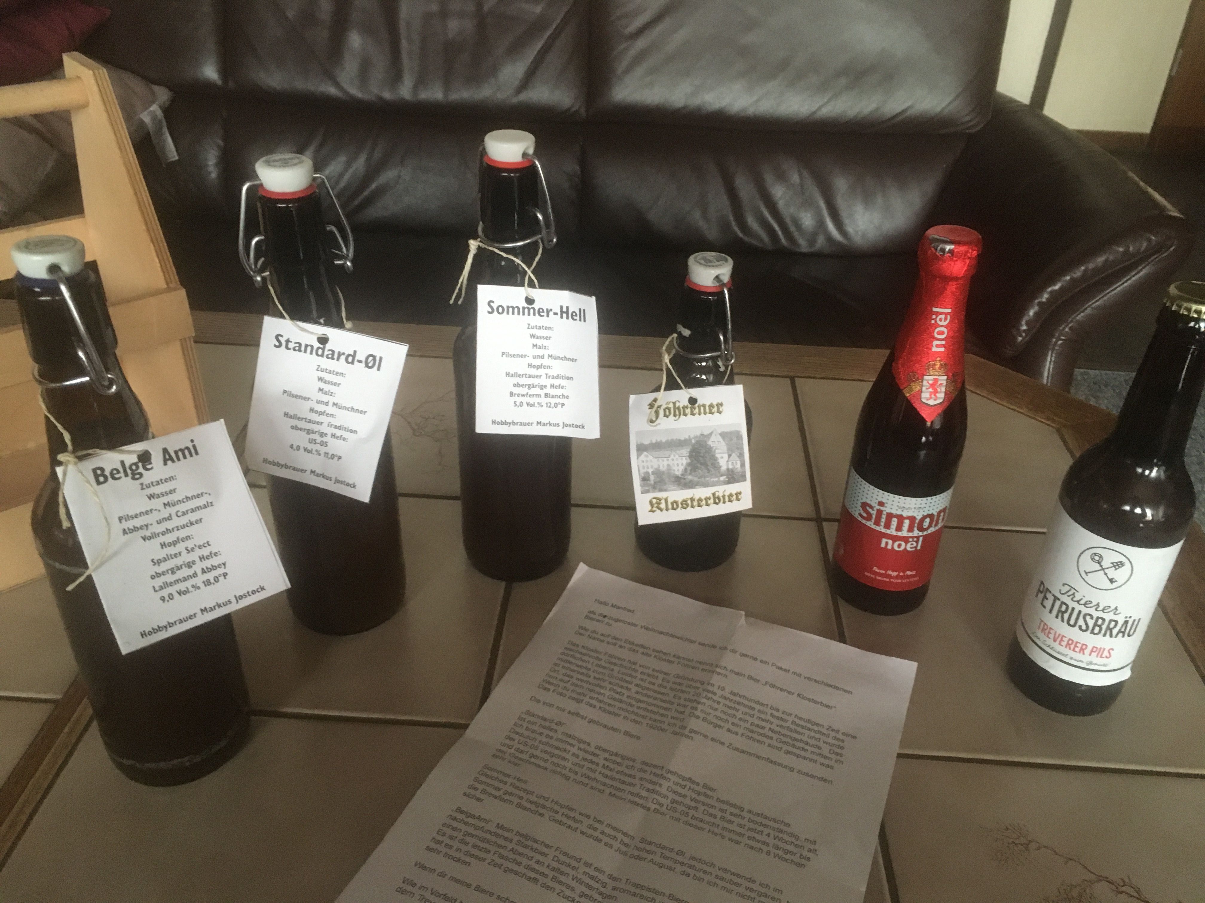 Ja, und zwar von Sylvie und Björn und es sind nicht irgendwelche Flaschen sondern fünf verschiedene selbstgebraute mit einem Kaufbier plus Kekse. Die Kekse sind sehr lecker! Und der Brief den ihr mir geschrieben habt wird mich veranlassen, genauso freundlich akkurat und ordentlich eine Rezession zu euren Kreationen abzugeben!!