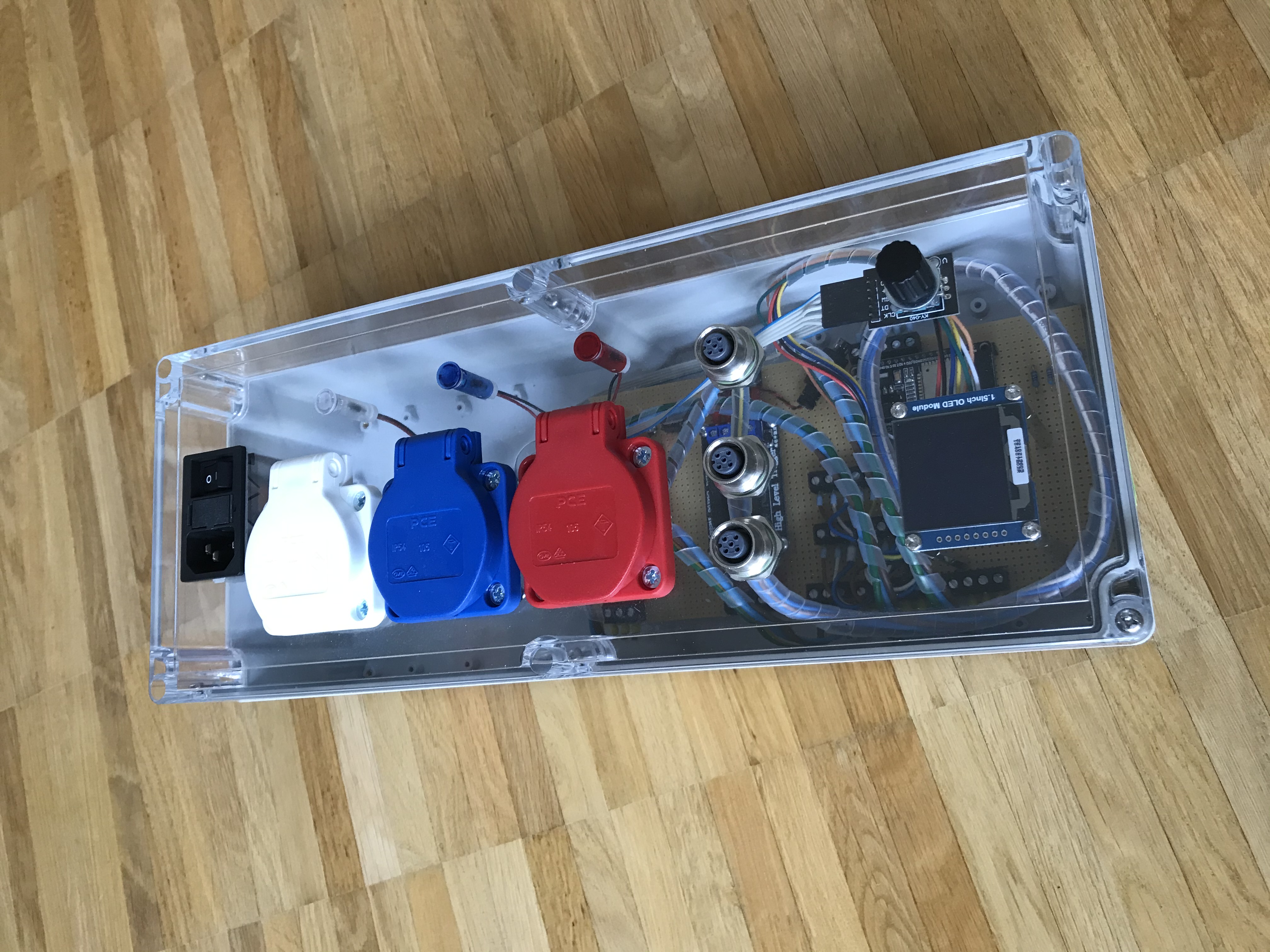 - Drei Schuko-Steckdosen mit Dauerstrom (weiß), Kühlung (blau) und Heizung (rot) für Begleitkühler, Kühlwasserpumpe und Heizkabel