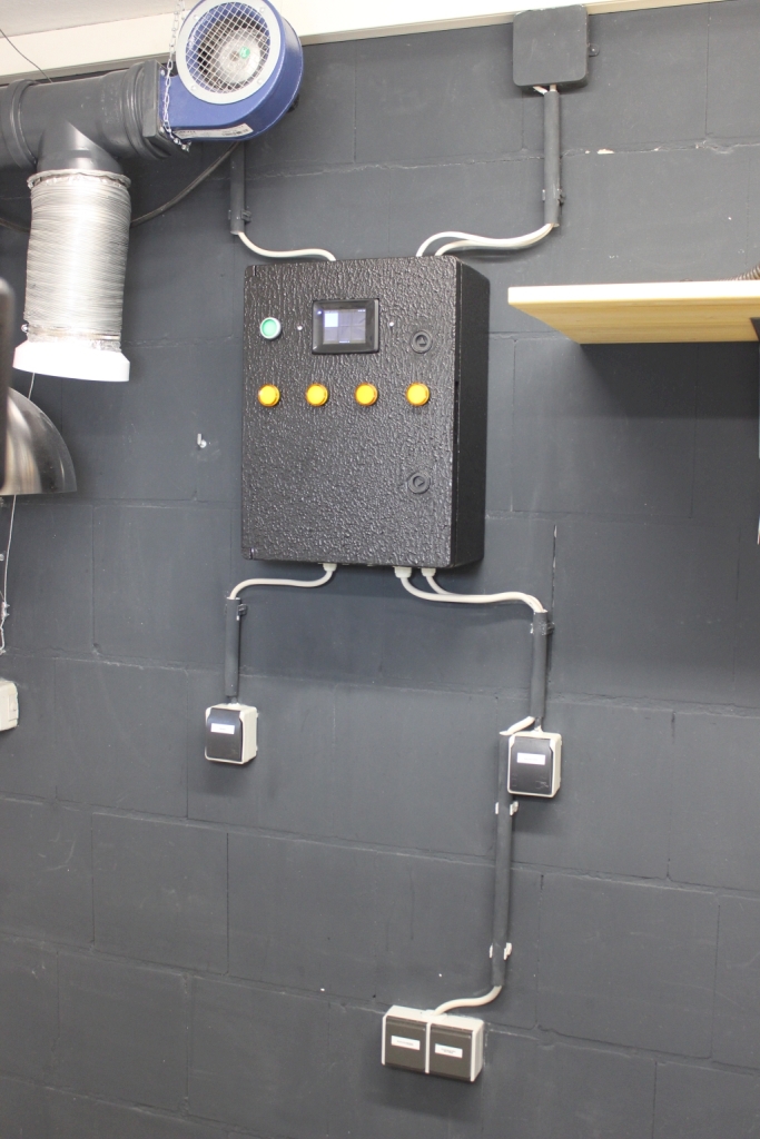 Der Kasten wurde auch schon in meinen Brauraum integriert. Wer meinen Blog ließt, der kennt bereits den Umbau der Anlage und weiß, dass ich 2 Stromkreise dort habe, einmal für die Hendi und einmal für den Nachguss. Ursprünglich kamen die beiden Stromleitungen von Oben runter zur Steckdose, in die ich dann meine Hendi und Einkocher eingesteckt hatte.