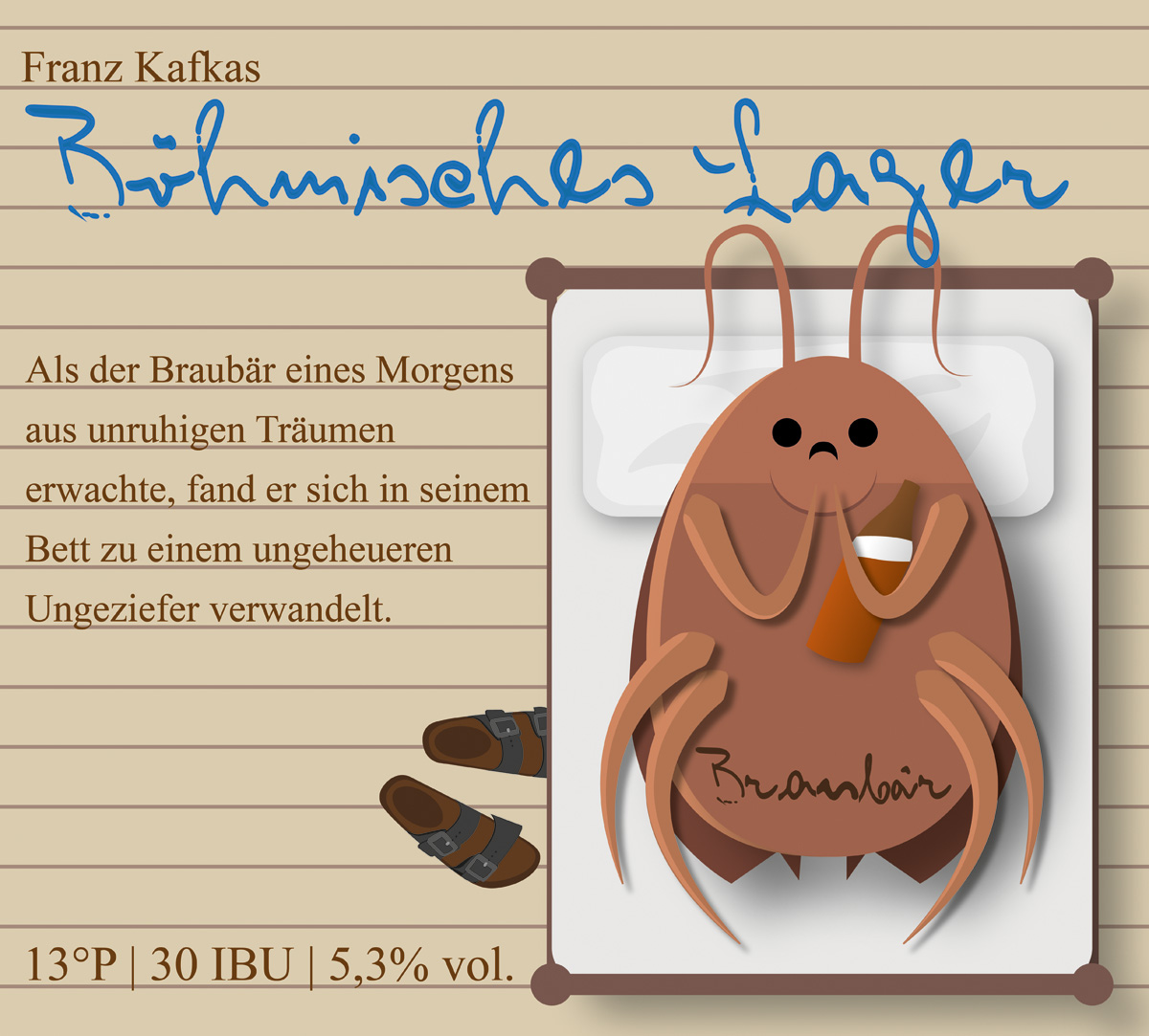 Und hier direkt das nächste Etikett. Hier musste ich wirklich lange nachdenken, bis ich etwas passendes für das böhmische Lager gefunden habe. Die Silhuette von Prag war mir nicht Prägnant genug. Aber als alter Kafka Fan habe ich dann schlussendlich doch noch eine für mich passende Lösung gefunden:
