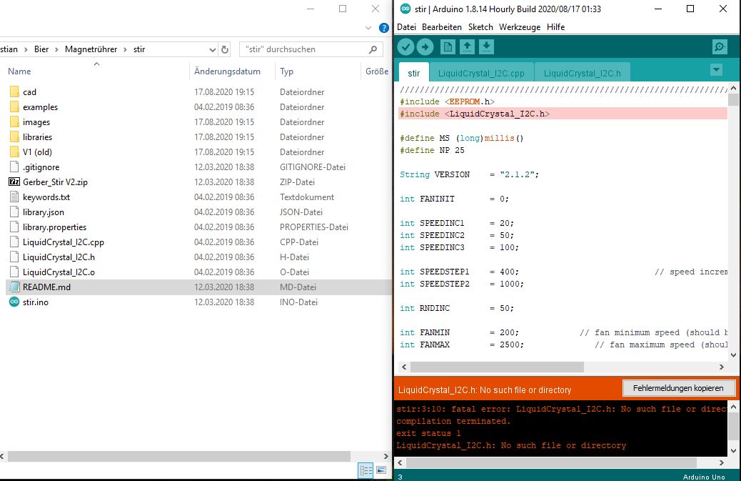 Kopiere die beiden in der Zip enthaltenen Files (LiquidCrystal_I2C.h, LiquidCrystal_I2C.cpp) direkt in den Projektordner (Ordner mit dem ino File) und ändere die #include Zeile in der stirr.ino so ab, dass das Headerfile in Anführungszeichen statt spitzen Klammern steht.
