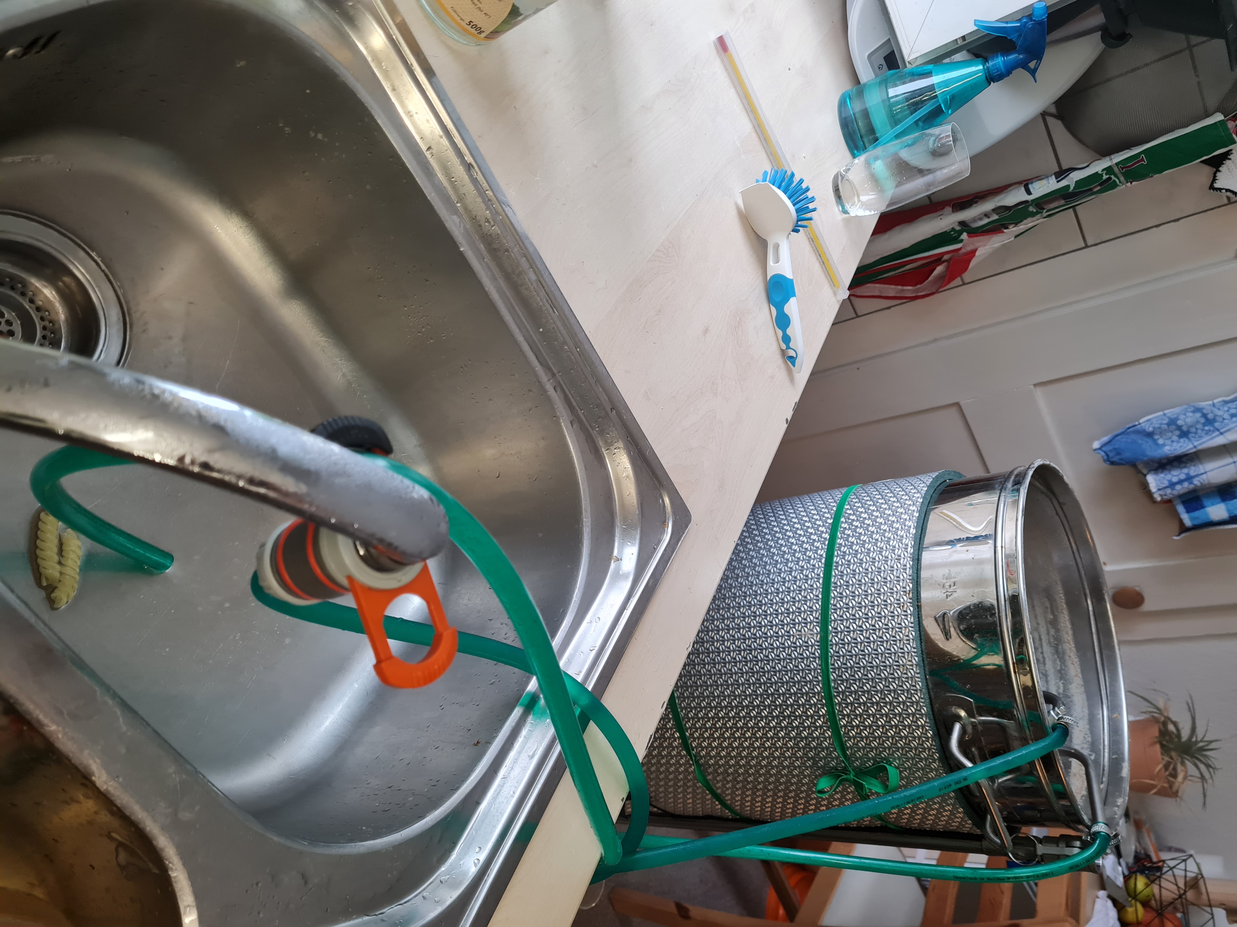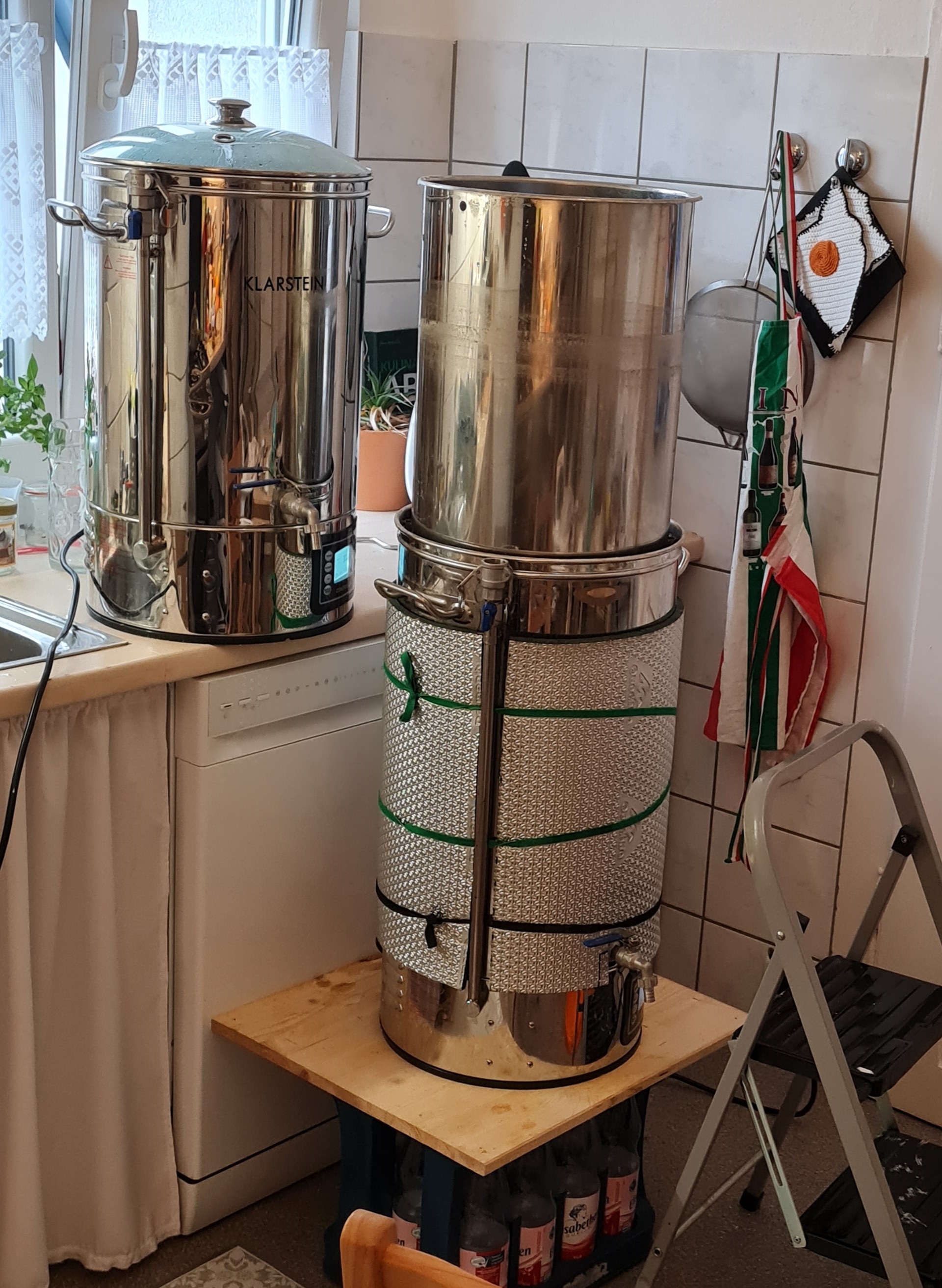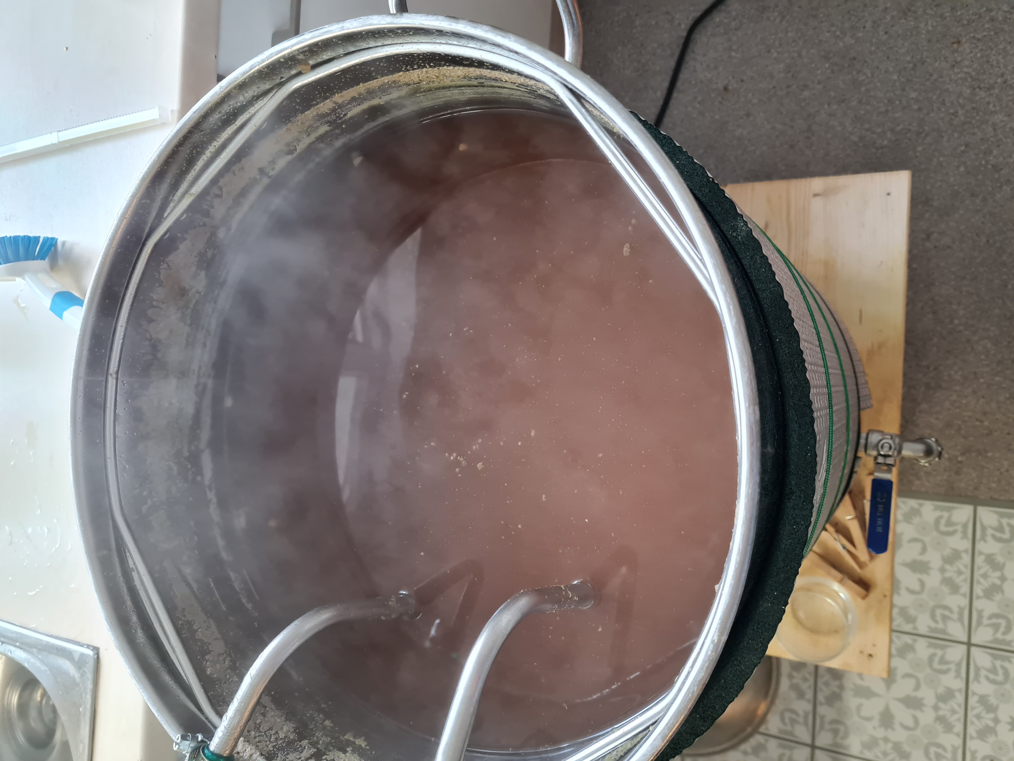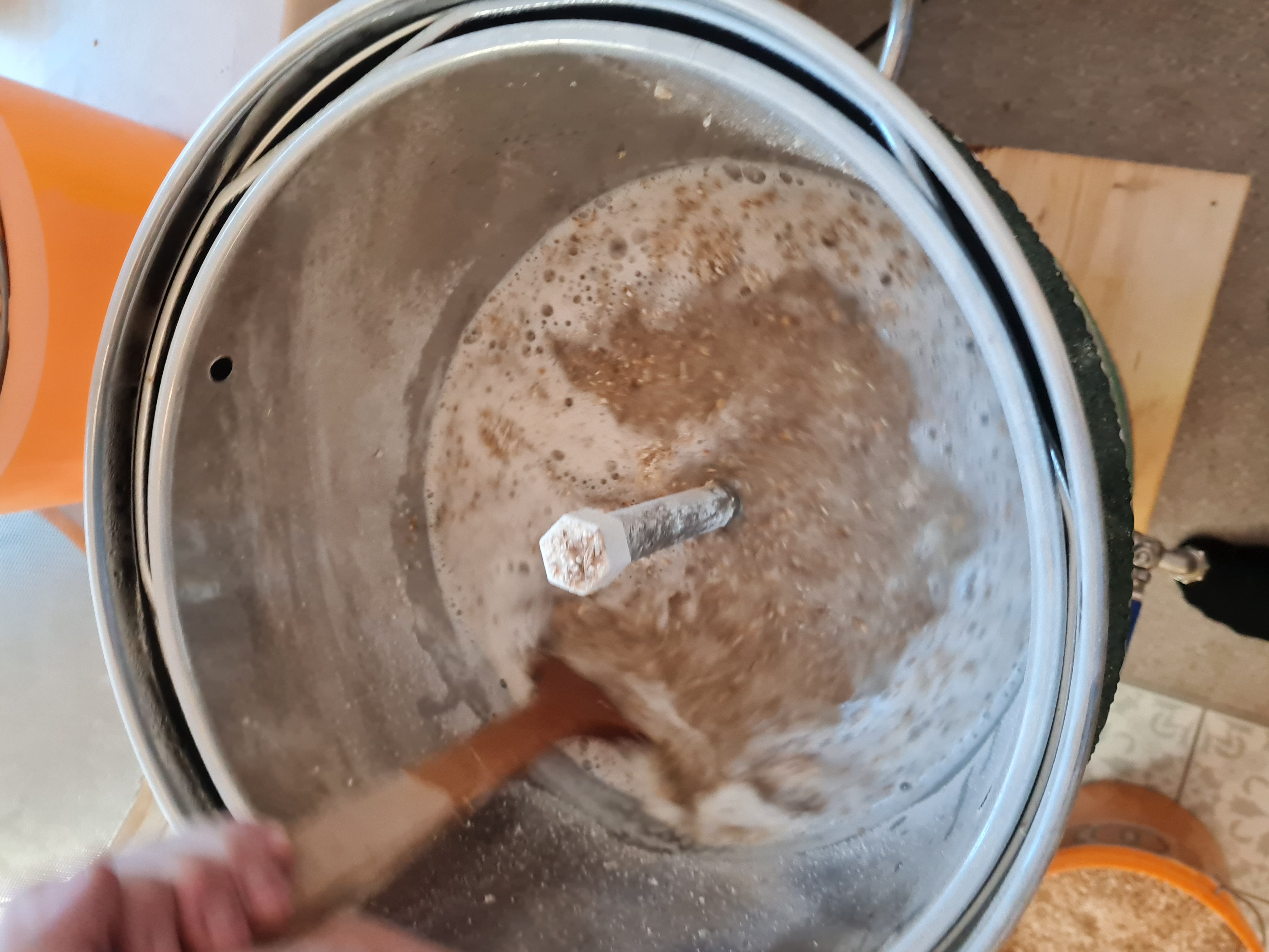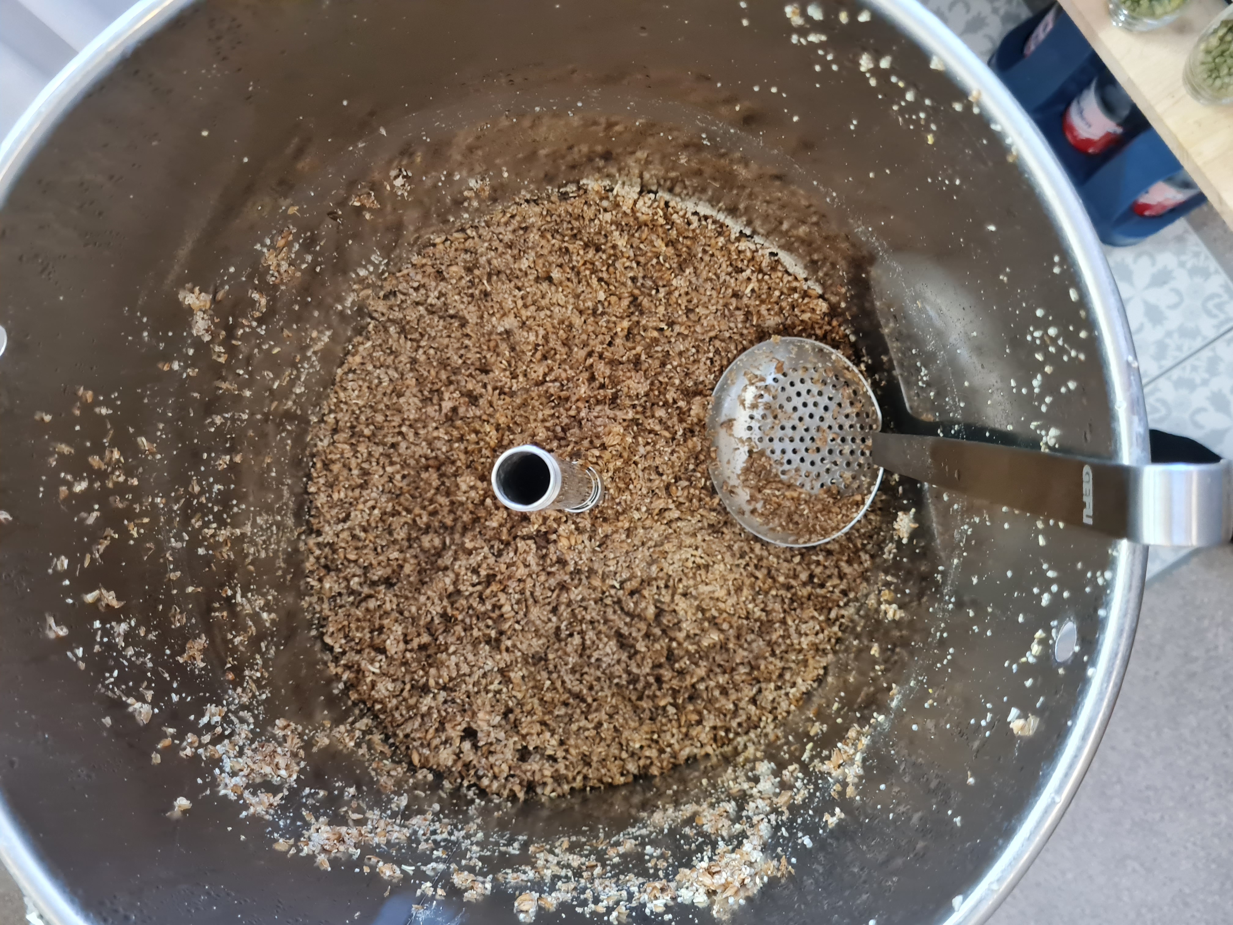 Geschrotet wurde mit der kolumbischen Corona. Der Mahltisch ist ein Ikeateil, in das ich ein Loch gesägt habe (Ich habe beim Basteln nicht schlecht gestaunt: das ist kein Holz sondern funierte Wellpappe! Mir ist die Lochsäge durch das obere „Brett“ gefallen und hat das untere „Brett“ fast vollständig durchschlagen). Praktischerweise passen die Allzweckeimer aus dem Baumarkt gut drunter und lassen sich nach dem Schroten direkt mit dem dazugehörigen Deckel dicht verschließen. Das Stück endlos wiederverwendbare Aluminiumfolie wird um den Mahlkörper gelegt und die Küchenrolle dient als „Absetzer“, damit das gesamte Schrot im Eimer landet. Die Trichterkapazität habe ich mit der PET Flasche vergrößert, damit ich länger durchkurbeln kann. Das Leitungswasser hier hat ganz passable Eigenschaften, deswegen kam es für dieses Bier ohne Aufbereitung direkt aus dem Hahn in den Mundschenk. Dieser stand erhöht, damit die Würze später per Schwerkraft in das Gärfass laufen konnte. Tipp: Direkt vor dem Einmaischen nochmal alle Luftblasen, die sich unter dem Malzkorb gesammelt haben durch einen Ruck am Korb entfernen. Sonst läuft die Flüssigkeit beim Maischen eventuell nicht gut durch das untere Gitter. Eingemaischt wurde direkt bei 67°C mit der Sauerkrautgabel. Ich lege bei diesem Schritt immer eine Filtermaske an und benutze einen Wasserzerstäuber zur Staubniederschlagung. Während des Maischens passte ich den Volumenstrom mehrmals an. Meistens steht der Hebel auf 8 Uhr. Ein Stück Schlauch hat die Würze in eine Drehbewegung versetzt und sollte so die Temperatur besser verteilen. Der Maische-pH lag nicht im Optimalbereich, aber zum Puffern hatte ich auch nichts da. „Wird schon nicht so schlimm sein…“. Zum Vergleich der pH des Leitungswassers. Nach ca. 30 Minuten war die Maische iodnormal. Der Nachguss wurde im kleinen Bruder aufgeheizt, der vom großen Mundschenk eigentlich ersetzt werden sollte. Ich konnte mich bis jetzt aber nicht von ihm trennen, weil zwei ja doch noch praktisch sind. Abgemaischt wurde bei knapp 78 °C und diese Temperatur für 5 Minuten gehalten. Auch wenn man im herkömmlichen Verfahren keine Rast an dieser Stelle braucht, mache ich trotzdem eine, da das System von unten heizt und oben heiß draufgibt. Systembeding braucht die heiße Würze von oben aber noch Zeit, um den ganzen Malzkorb durchdringen zu können. Ohne diese Kleine Rast vermute ich einen Temperaturgradienten im Malzkorb. Ich habe auch bereits mehrmals versucht, ohne abzumaischen direkt zu läutern, was auch gut funktioniert hat. Ich sehe allerdings keinen Nachteil darin, abzumaischen, da ja ohnehin alles bis zum Kochen weiter erhitzt werden muss.