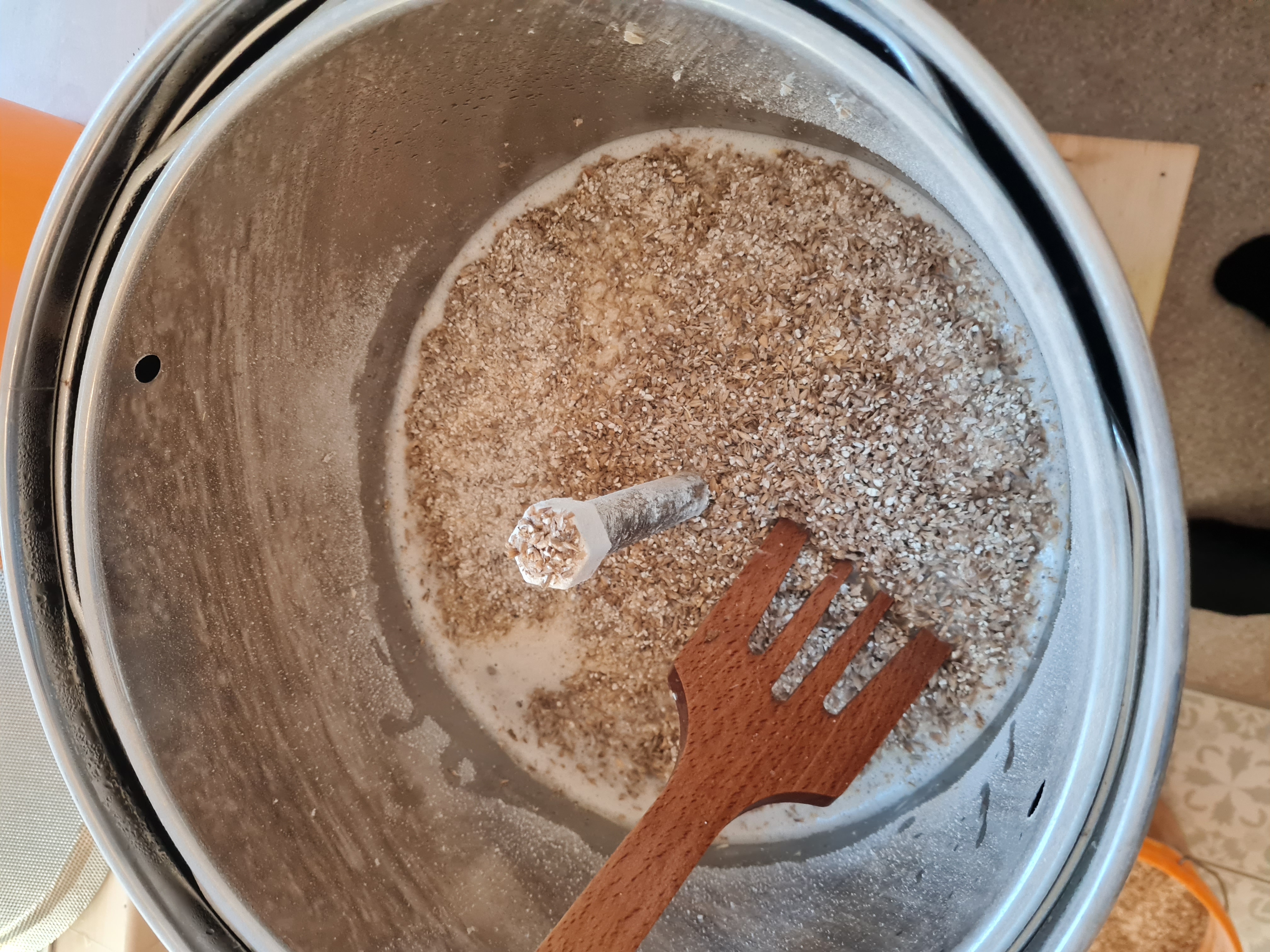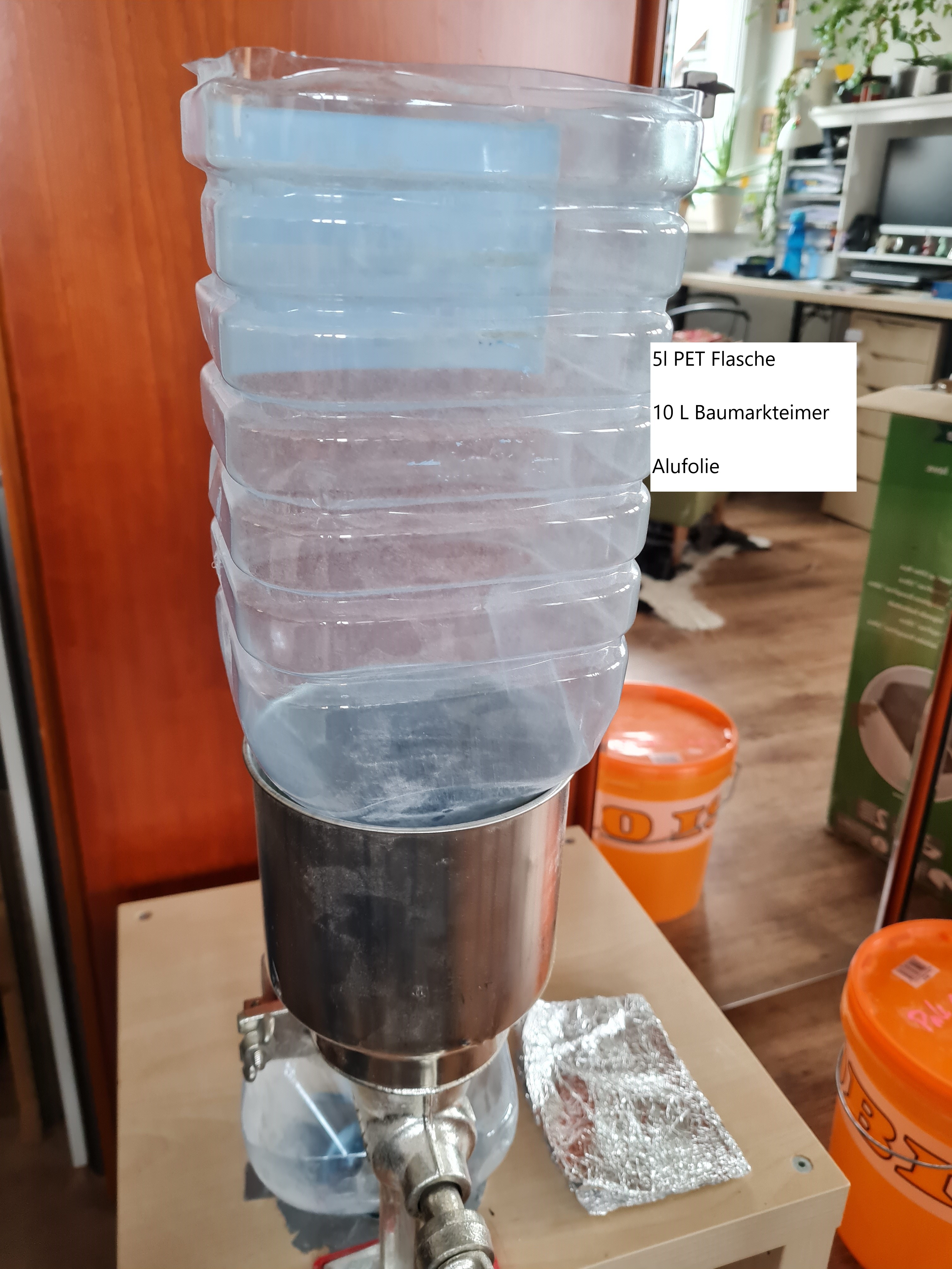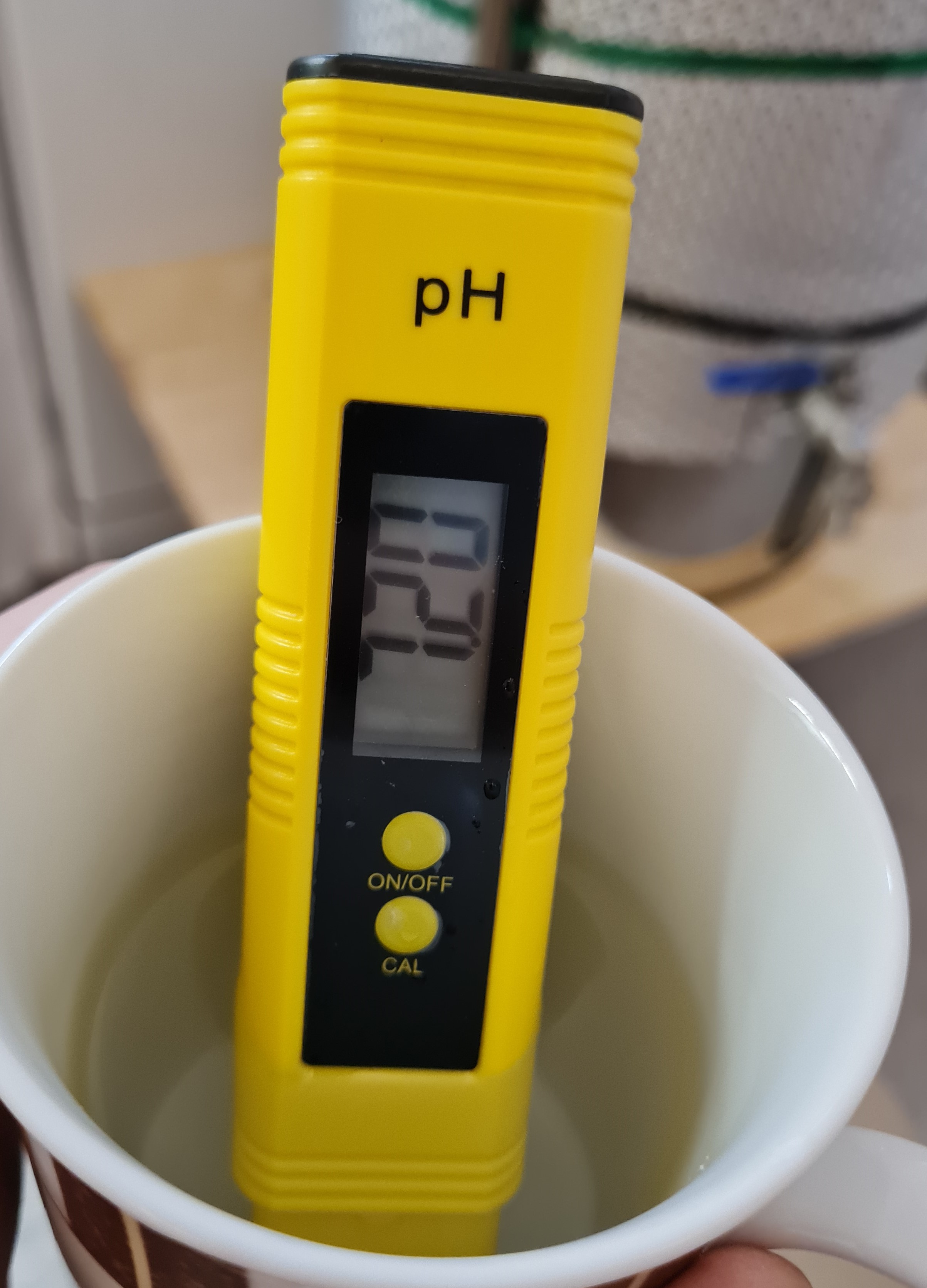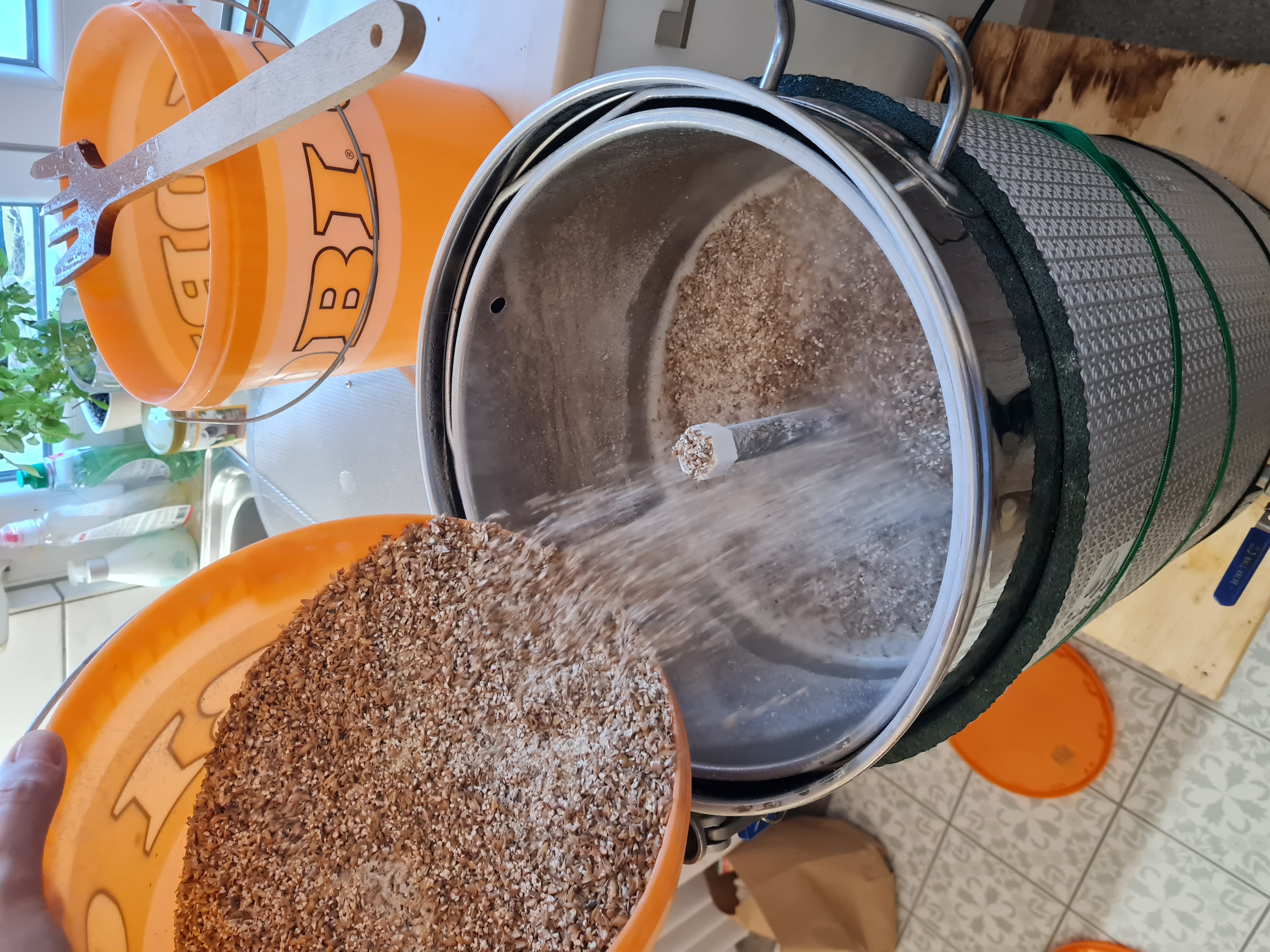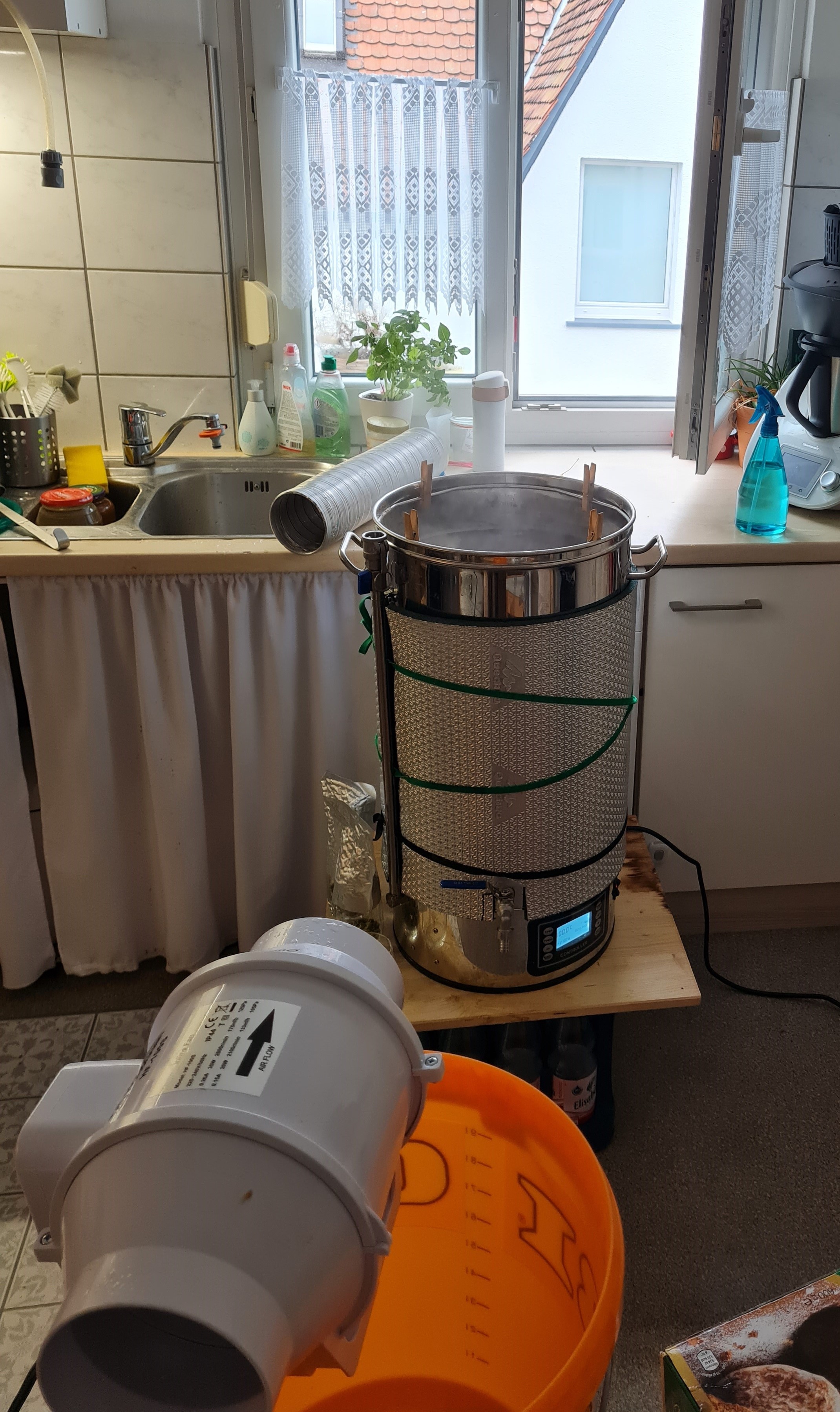 Geschrotet wurde mit der kolumbischen Corona. Der Mahltisch ist ein Ikeateil, in das ich ein Loch gesägt habe (Ich habe beim Basteln nicht schlecht gestaunt: das ist kein Holz sondern funierte Wellpappe! Mir ist die Lochsäge durch das obere „Brett“ gefallen und hat das untere „Brett“ fast vollständig durchschlagen). Praktischerweise passen die Allzweckeimer aus dem Baumarkt gut drunter und lassen sich nach dem Schroten direkt mit dem dazugehörigen Deckel dicht verschließen. Das Stück endlos wiederverwendbare Aluminiumfolie wird um den Mahlkörper gelegt und die Küchenrolle dient als „Absetzer“, damit das gesamte Schrot im Eimer landet. Die Trichterkapazität habe ich mit der PET Flasche vergrößert, damit ich länger durchkurbeln kann. Das Leitungswasser hier hat ganz passable Eigenschaften, deswegen kam es für dieses Bier ohne Aufbereitung direkt aus dem Hahn in den Mundschenk. Dieser stand erhöht, damit die Würze später per Schwerkraft in das Gärfass laufen konnte. Tipp: Direkt vor dem Einmaischen nochmal alle Luftblasen, die sich unter dem Malzkorb gesammelt haben durch einen Ruck am Korb entfernen. Sonst läuft die Flüssigkeit beim Maischen eventuell nicht gut durch das untere Gitter. Eingemaischt wurde direkt bei 67°C mit der Sauerkrautgabel. Ich lege bei diesem Schritt immer eine Filtermaske an und benutze einen Wasserzerstäuber zur Staubniederschlagung. Während des Maischens passte ich den Volumenstrom mehrmals an. Meistens steht der Hebel auf 8 Uhr. Ein Stück Schlauch hat die Würze in eine Drehbewegung versetzt und sollte so die Temperatur besser verteilen. Der Maische-pH lag nicht im Optimalbereich, aber zum Puffern hatte ich auch nichts da. „Wird schon nicht so schlimm sein…“. Zum Vergleich der pH des Leitungswassers. Nach ca. 30 Minuten war die Maische iodnormal. Der Nachguss wurde im kleinen Bruder aufgeheizt, der vom großen Mundschenk eigentlich ersetzt werden sollte. Ich konnte mich bis jetzt aber nicht von ihm trennen, weil zwei ja doch noch praktisch sind. Abgemaischt wurde bei knapp 78 °C und diese Temperatur für 5 Minuten gehalten. Auch wenn man im herkömmlichen Verfahren keine Rast an dieser Stelle braucht, mache ich trotzdem eine, da das System von unten heizt und oben heiß draufgibt. Systembeding braucht die heiße Würze von oben aber noch Zeit, um den ganzen Malzkorb durchdringen zu können. Ohne diese Kleine Rast vermute ich einen Temperaturgradienten im Malzkorb. Ich habe auch bereits mehrmals versucht, ohne abzumaischen direkt zu läutern, was auch gut funktioniert hat. Ich sehe allerdings keinen Nachteil darin, abzumaischen, da ja ohnehin alles bis zum Kochen weiter erhitzt werden muss.