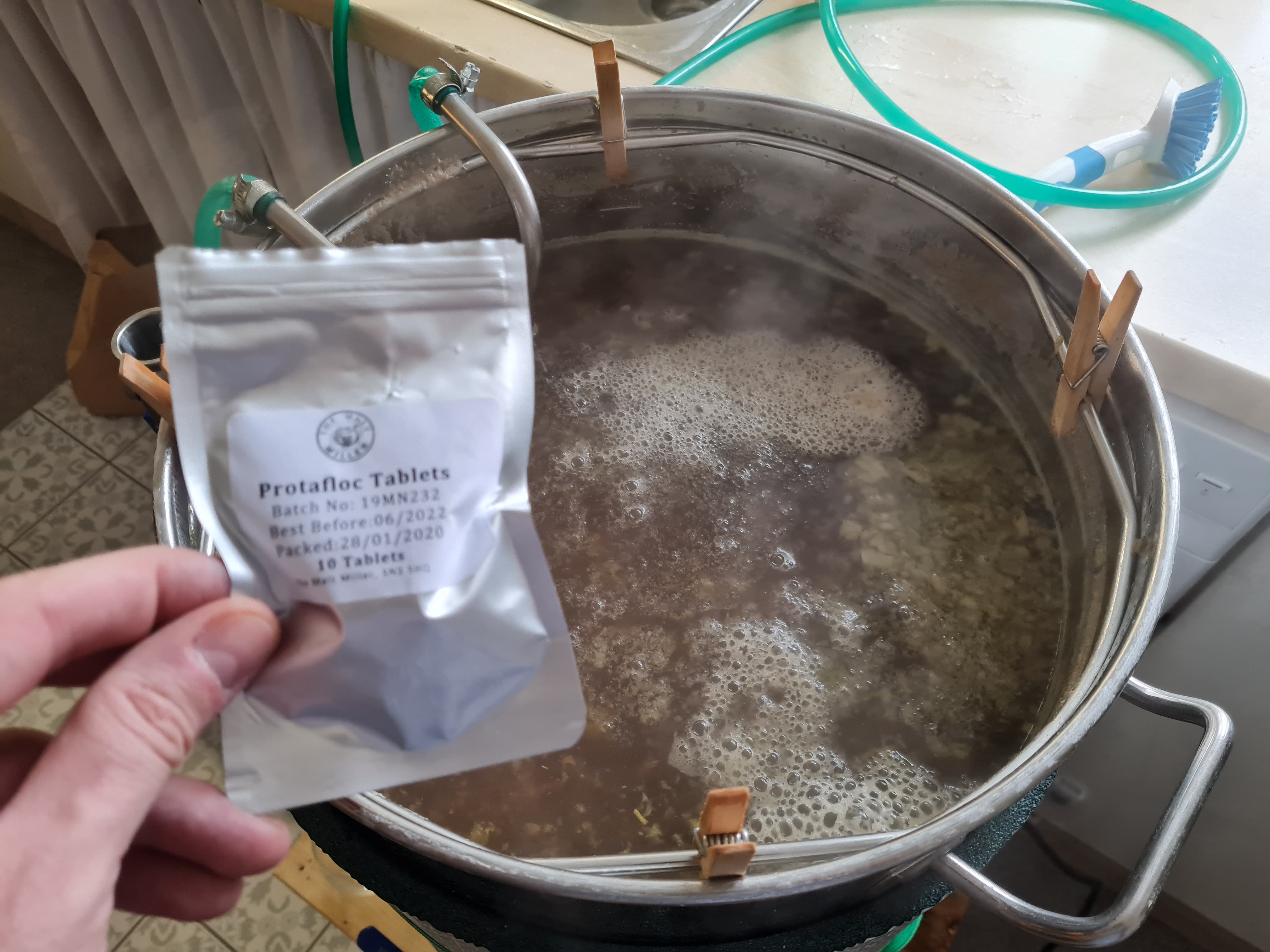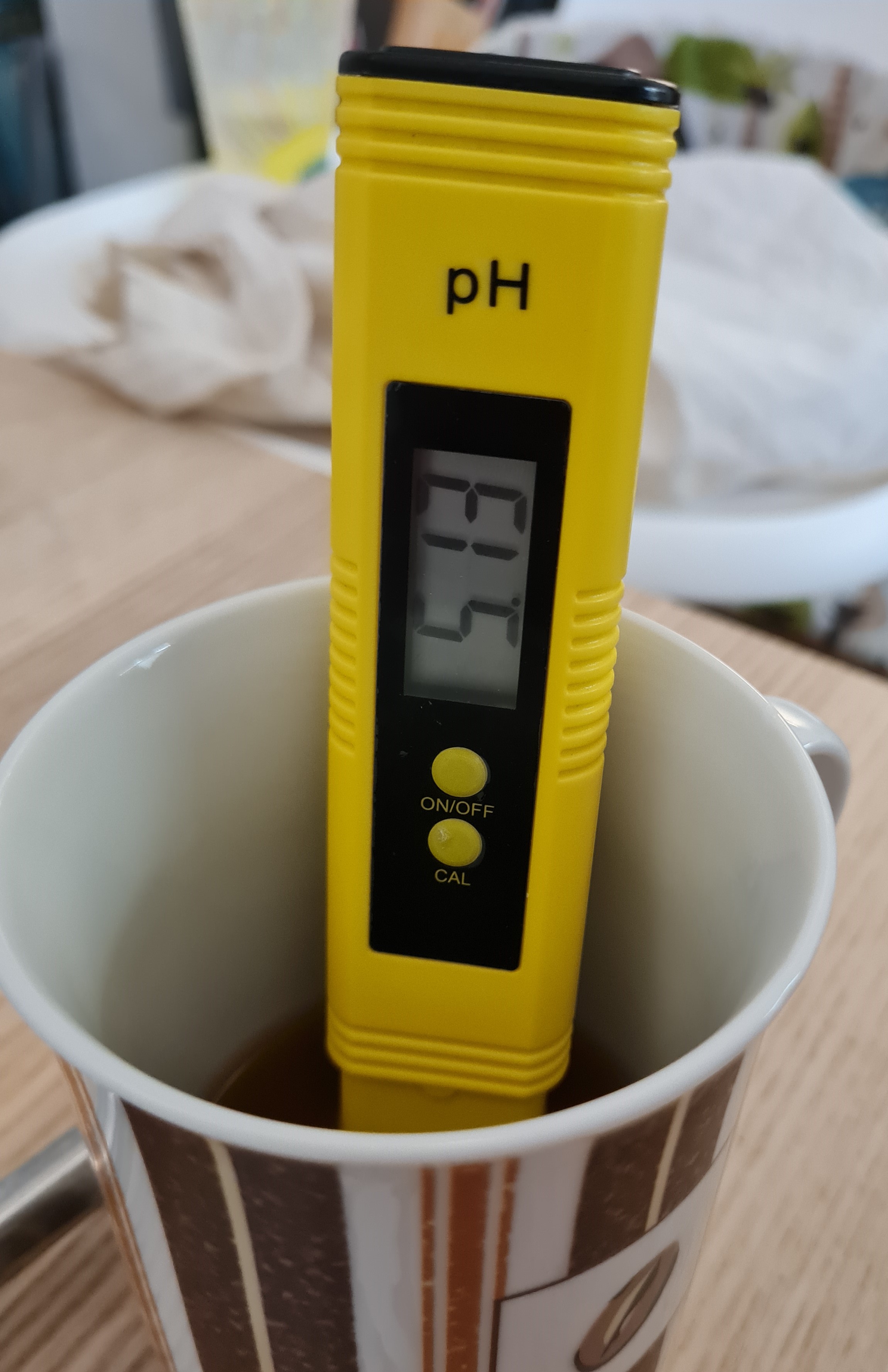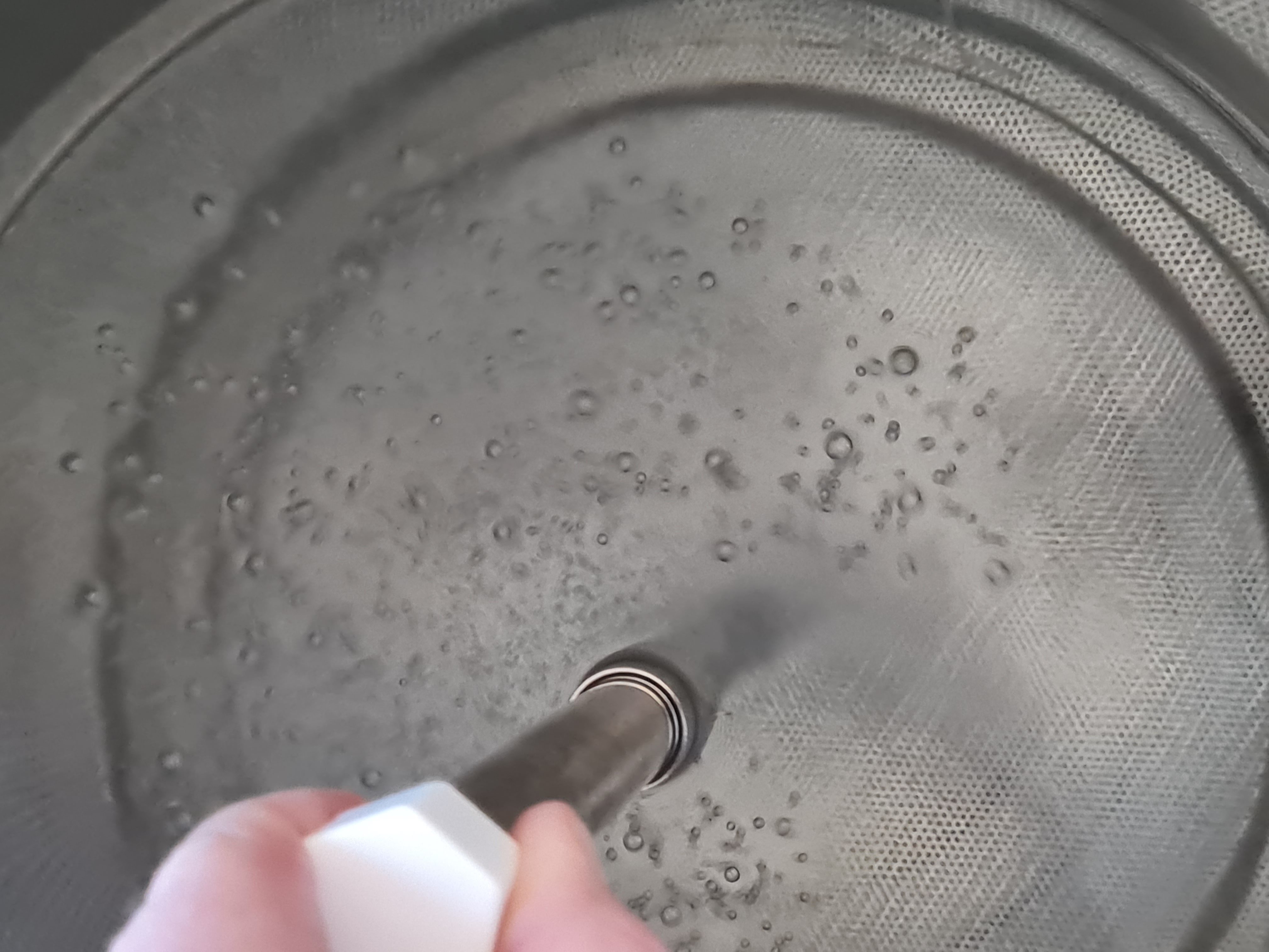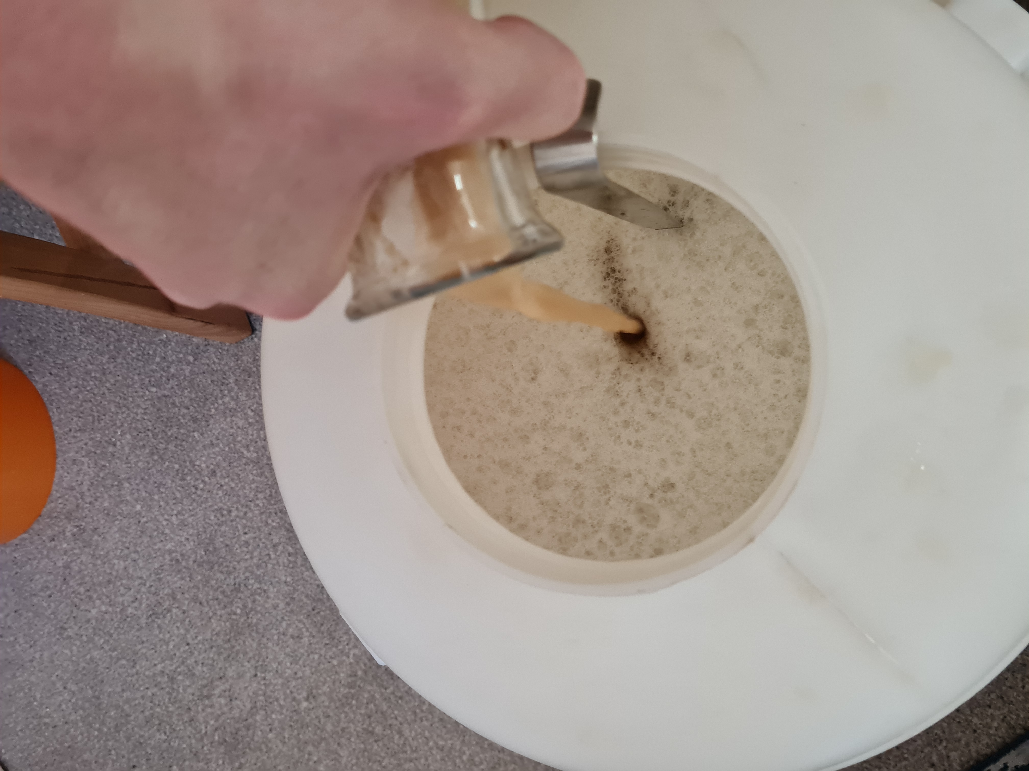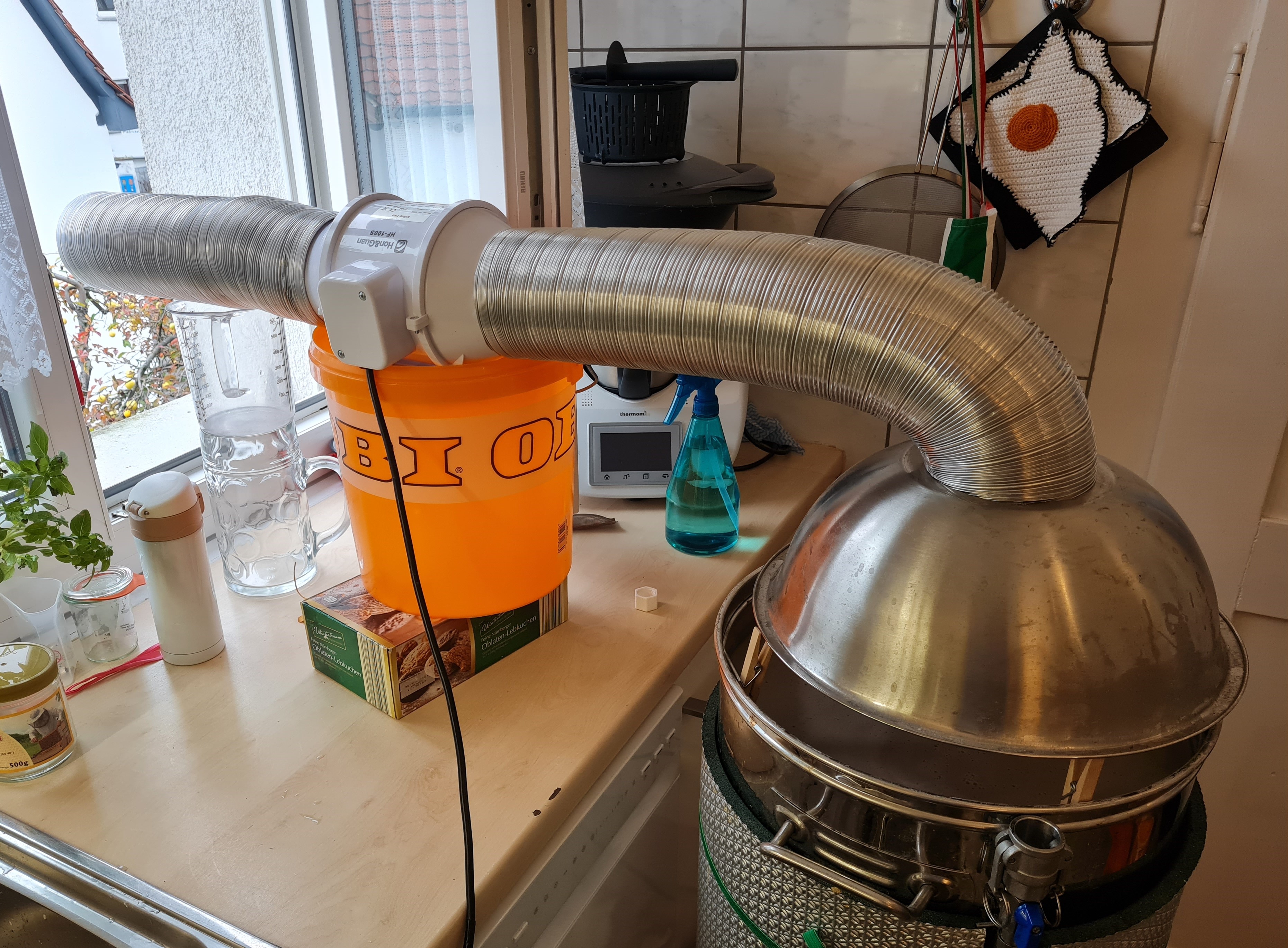 Geschrotet wurde mit der kolumbischen Corona. Der Mahltisch ist ein Ikeateil, in das ich ein Loch gesägt habe (Ich habe beim Basteln nicht schlecht gestaunt: das ist kein Holz sondern funierte Wellpappe! Mir ist die Lochsäge durch das obere „Brett“ gefallen und hat das untere „Brett“ fast vollständig durchschlagen). Praktischerweise passen die Allzweckeimer aus dem Baumarkt gut drunter und lassen sich nach dem Schroten direkt mit dem dazugehörigen Deckel dicht verschließen. Das Stück endlos wiederverwendbare Aluminiumfolie wird um den Mahlkörper gelegt und die Küchenrolle dient als „Absetzer“, damit das gesamte Schrot im Eimer landet. Die Trichterkapazität habe ich mit der PET Flasche vergrößert, damit ich länger durchkurbeln kann. Das Leitungswasser hier hat ganz passable Eigenschaften, deswegen kam es für dieses Bier ohne Aufbereitung direkt aus dem Hahn in den Mundschenk. Dieser stand erhöht, damit die Würze später per Schwerkraft in das Gärfass laufen konnte. Tipp: Direkt vor dem Einmaischen nochmal alle Luftblasen, die sich unter dem Malzkorb gesammelt haben durch einen Ruck am Korb entfernen. Sonst läuft die Flüssigkeit beim Maischen eventuell nicht gut durch das untere Gitter. Eingemaischt wurde direkt bei 67°C mit der Sauerkrautgabel. Ich lege bei diesem Schritt immer eine Filtermaske an und benutze einen Wasserzerstäuber zur Staubniederschlagung. Während des Maischens passte ich den Volumenstrom mehrmals an. Meistens steht der Hebel auf 8 Uhr. Ein Stück Schlauch hat die Würze in eine Drehbewegung versetzt und sollte so die Temperatur besser verteilen. Der Maische-pH lag nicht im Optimalbereich, aber zum Puffern hatte ich auch nichts da. „Wird schon nicht so schlimm sein…“. Zum Vergleich der pH des Leitungswassers. Nach ca. 30 Minuten war die Maische iodnormal. Der Nachguss wurde im kleinen Bruder aufgeheizt, der vom großen Mundschenk eigentlich ersetzt werden sollte. Ich konnte mich bis jetzt aber nicht von ihm trennen, weil zwei ja doch noch praktisch sind. Abgemaischt wurde bei knapp 78 °C und diese Temperatur für 5 Minuten gehalten. Auch wenn man im herkömmlichen Verfahren keine Rast an dieser Stelle braucht, mache ich trotzdem eine, da das System von unten heizt und oben heiß draufgibt. Systembeding braucht die heiße Würze von oben aber noch Zeit, um den ganzen Malzkorb durchdringen zu können. Ohne diese Kleine Rast vermute ich einen Temperaturgradienten im Malzkorb. Ich habe auch bereits mehrmals versucht, ohne abzumaischen direkt zu läutern, was auch gut funktioniert hat. Ich sehe allerdings keinen Nachteil darin, abzumaischen, da ja ohnehin alles bis zum Kochen weiter erhitzt werden muss.