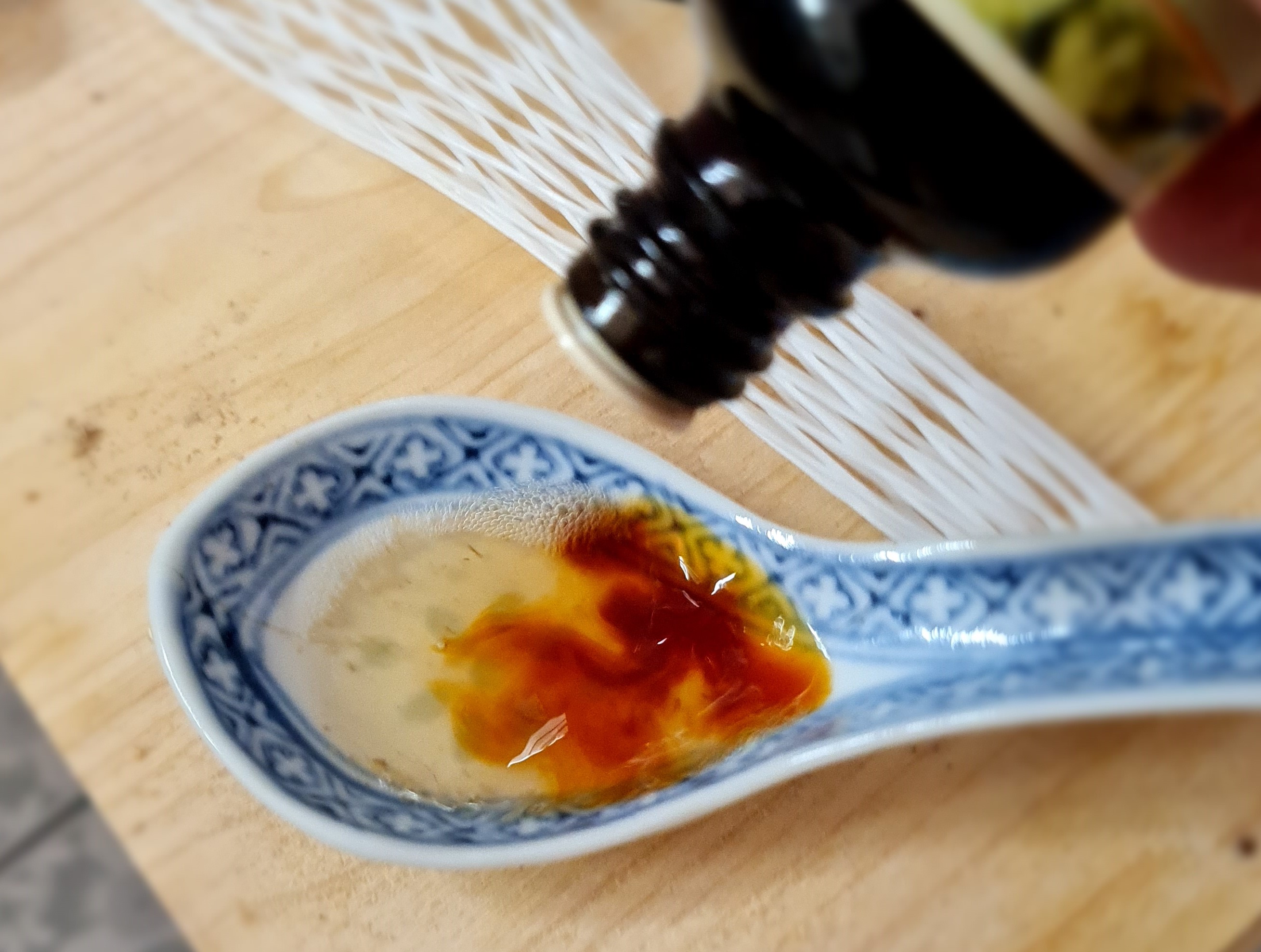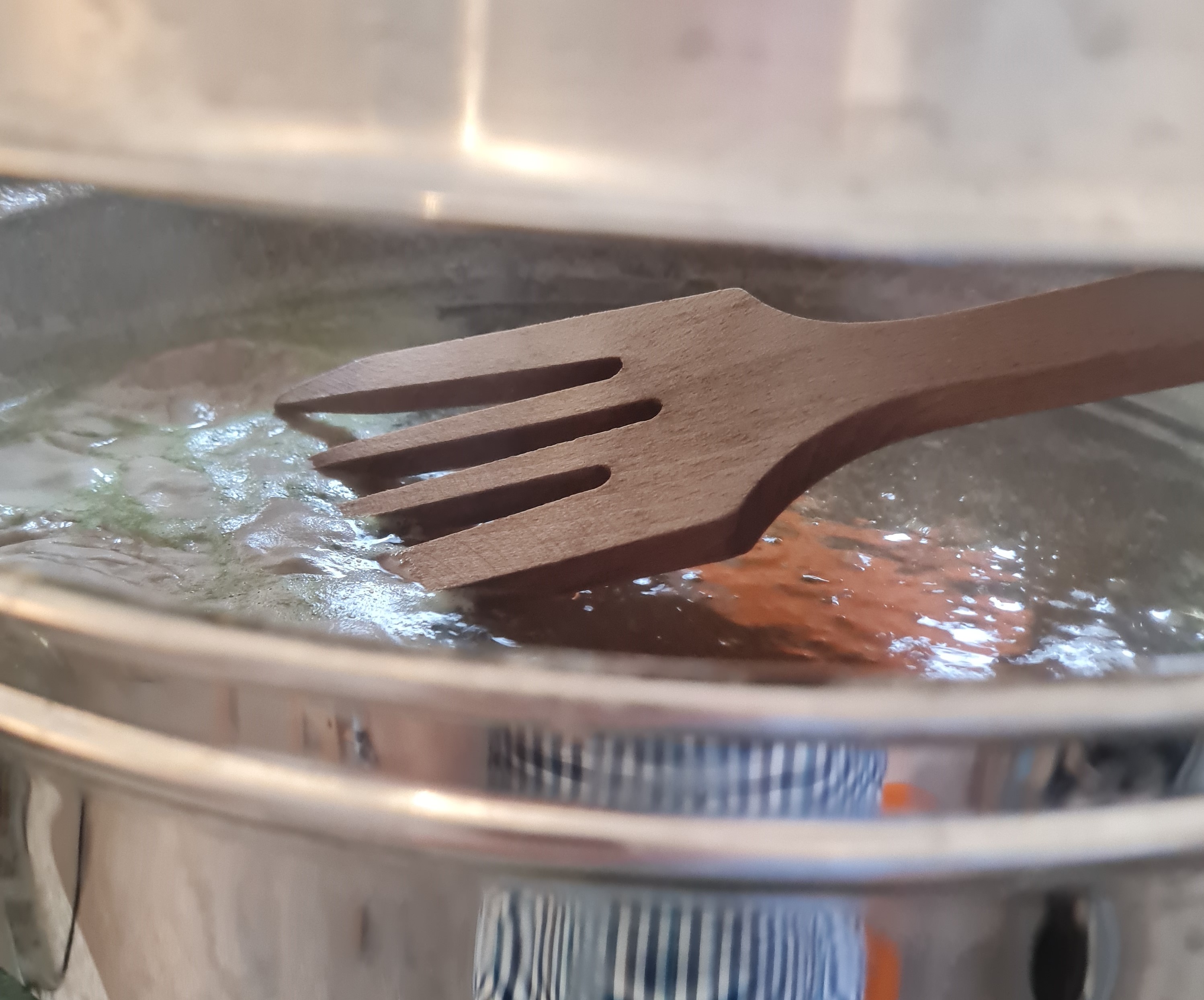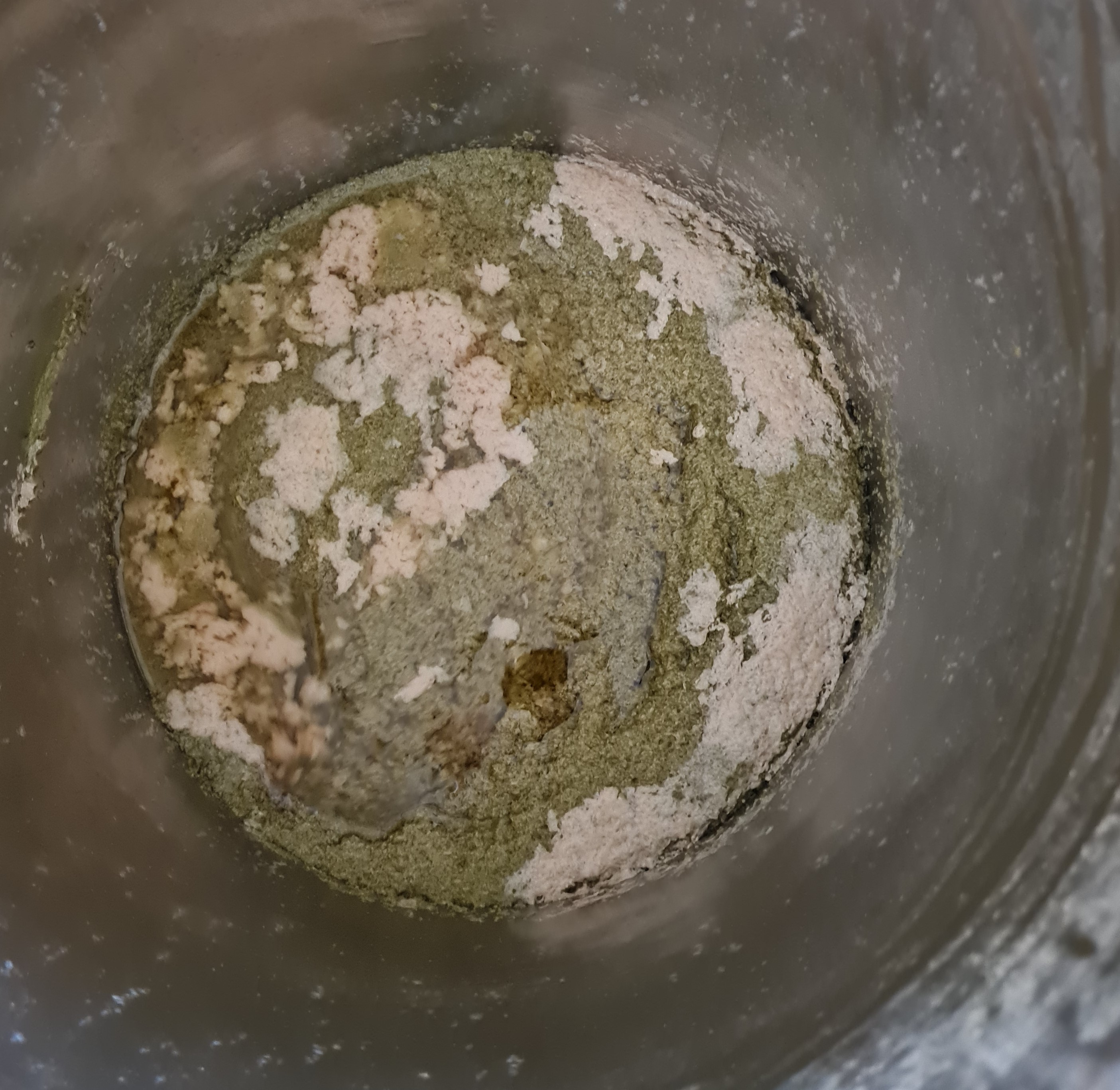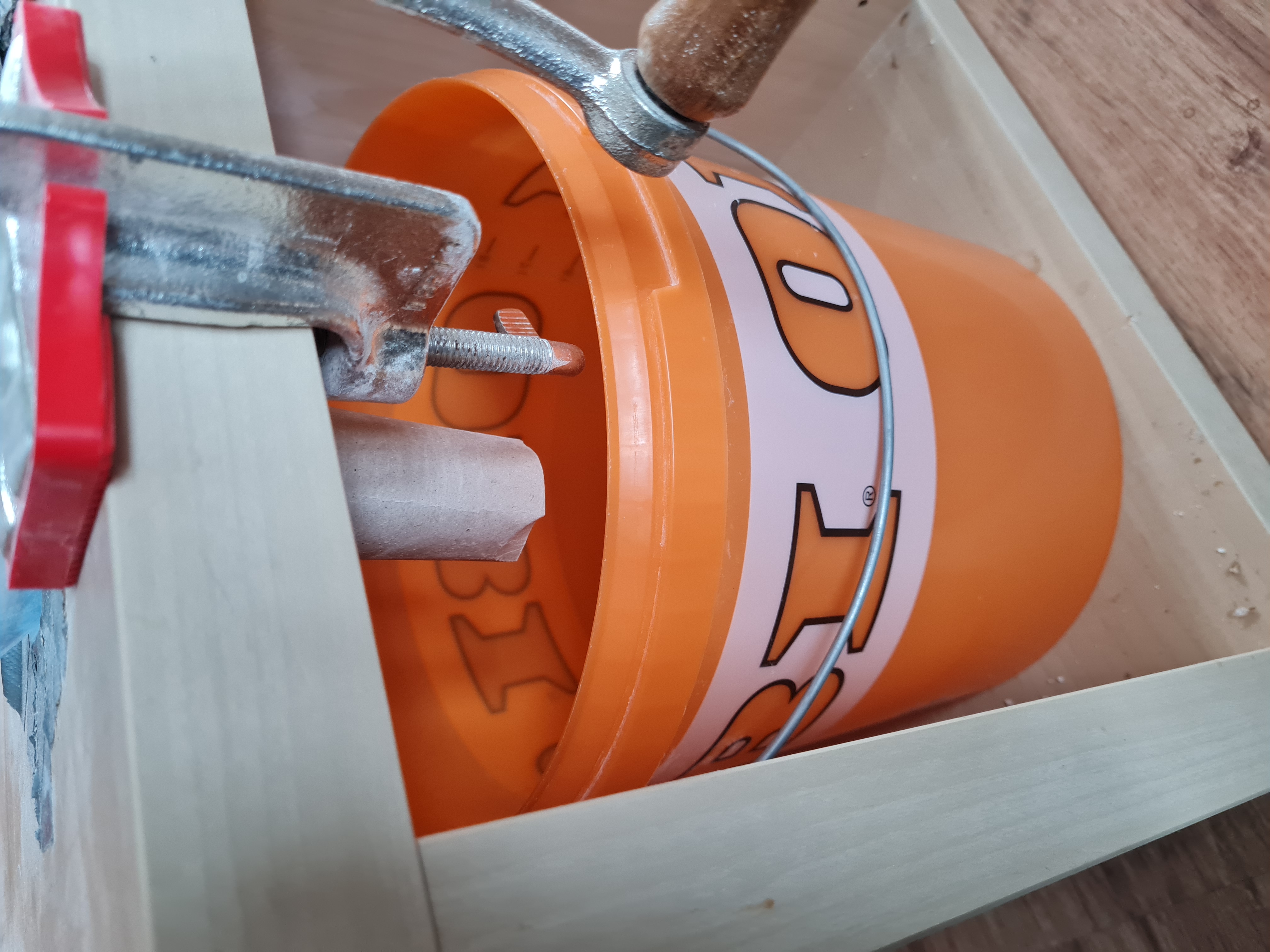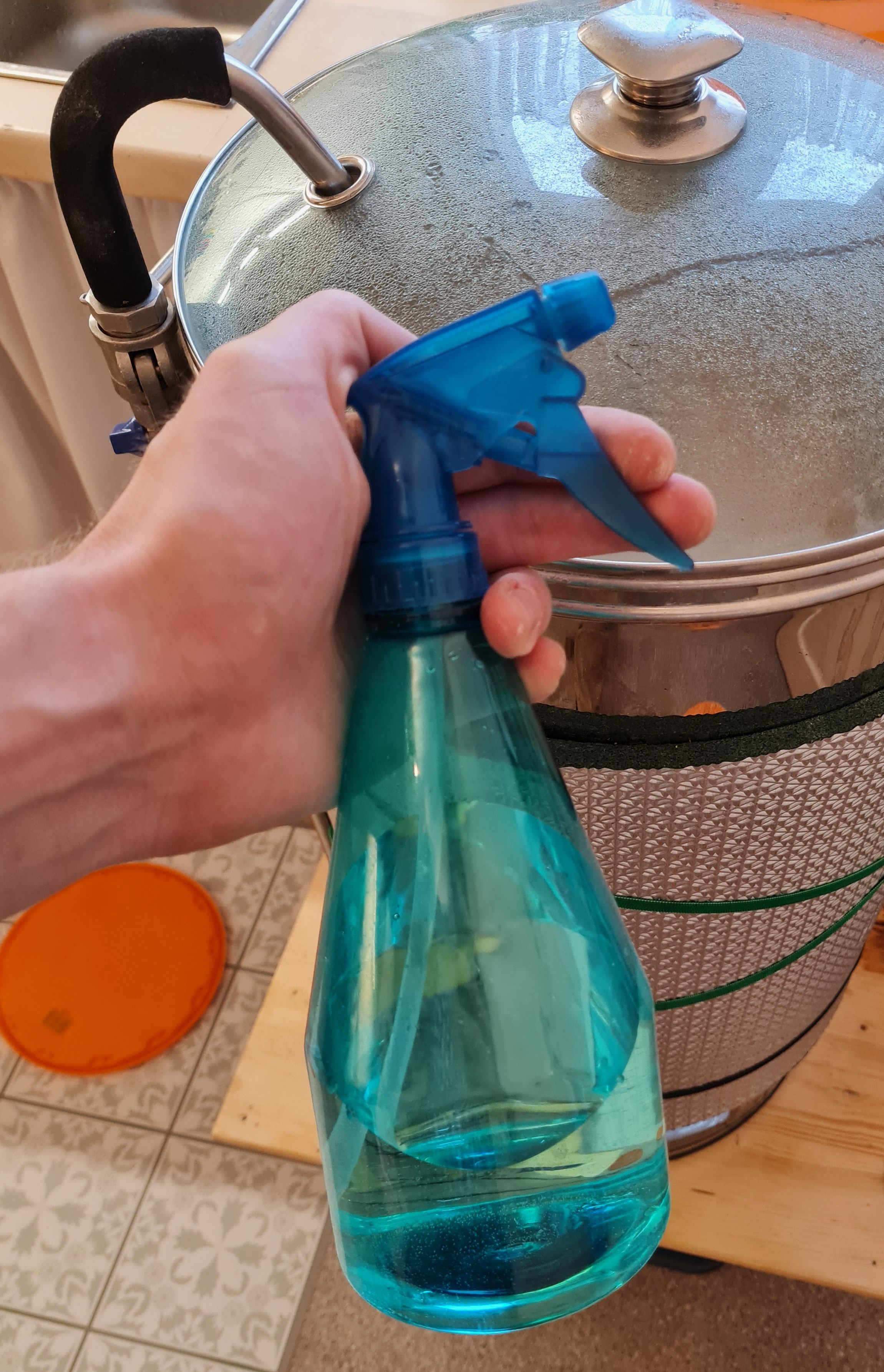 Geschrotet wurde mit der kolumbischen Corona. Der Mahltisch ist ein Ikeateil, in das ich ein Loch gesägt habe (Ich habe beim Basteln nicht schlecht gestaunt: das ist kein Holz sondern funierte Wellpappe! Mir ist die Lochsäge durch das obere „Brett“ gefallen und hat das untere „Brett“ fast vollständig durchschlagen). Praktischerweise passen die Allzweckeimer aus dem Baumarkt gut drunter und lassen sich nach dem Schroten direkt mit dem dazugehörigen Deckel dicht verschließen. Das Stück endlos wiederverwendbare Aluminiumfolie wird um den Mahlkörper gelegt und die Küchenrolle dient als „Absetzer“, damit das gesamte Schrot im Eimer landet. Die Trichterkapazität habe ich mit der PET Flasche vergrößert, damit ich länger durchkurbeln kann. Das Leitungswasser hier hat ganz passable Eigenschaften, deswegen kam es für dieses Bier ohne Aufbereitung direkt aus dem Hahn in den Mundschenk. Dieser stand erhöht, damit die Würze später per Schwerkraft in das Gärfass laufen konnte. Tipp: Direkt vor dem Einmaischen nochmal alle Luftblasen, die sich unter dem Malzkorb gesammelt haben durch einen Ruck am Korb entfernen. Sonst läuft die Flüssigkeit beim Maischen eventuell nicht gut durch das untere Gitter. Eingemaischt wurde direkt bei 67°C mit der Sauerkrautgabel. Ich lege bei diesem Schritt immer eine Filtermaske an und benutze einen Wasserzerstäuber zur Staubniederschlagung. Während des Maischens passte ich den Volumenstrom mehrmals an. Meistens steht der Hebel auf 8 Uhr. Ein Stück Schlauch hat die Würze in eine Drehbewegung versetzt und sollte so die Temperatur besser verteilen. Der Maische-pH lag nicht im Optimalbereich, aber zum Puffern hatte ich auch nichts da. „Wird schon nicht so schlimm sein…“. Zum Vergleich der pH des Leitungswassers. Nach ca. 30 Minuten war die Maische iodnormal. Der Nachguss wurde im kleinen Bruder aufgeheizt, der vom großen Mundschenk eigentlich ersetzt werden sollte. Ich konnte mich bis jetzt aber nicht von ihm trennen, weil zwei ja doch noch praktisch sind. Abgemaischt wurde bei knapp 78 °C und diese Temperatur für 5 Minuten gehalten. Auch wenn man im herkömmlichen Verfahren keine Rast an dieser Stelle braucht, mache ich trotzdem eine, da das System von unten heizt und oben heiß draufgibt. Systembeding braucht die heiße Würze von oben aber noch Zeit, um den ganzen Malzkorb durchdringen zu können. Ohne diese Kleine Rast vermute ich einen Temperaturgradienten im Malzkorb. Ich habe auch bereits mehrmals versucht, ohne abzumaischen direkt zu läutern, was auch gut funktioniert hat. Ich sehe allerdings keinen Nachteil darin, abzumaischen, da ja ohnehin alles bis zum Kochen weiter erhitzt werden muss.