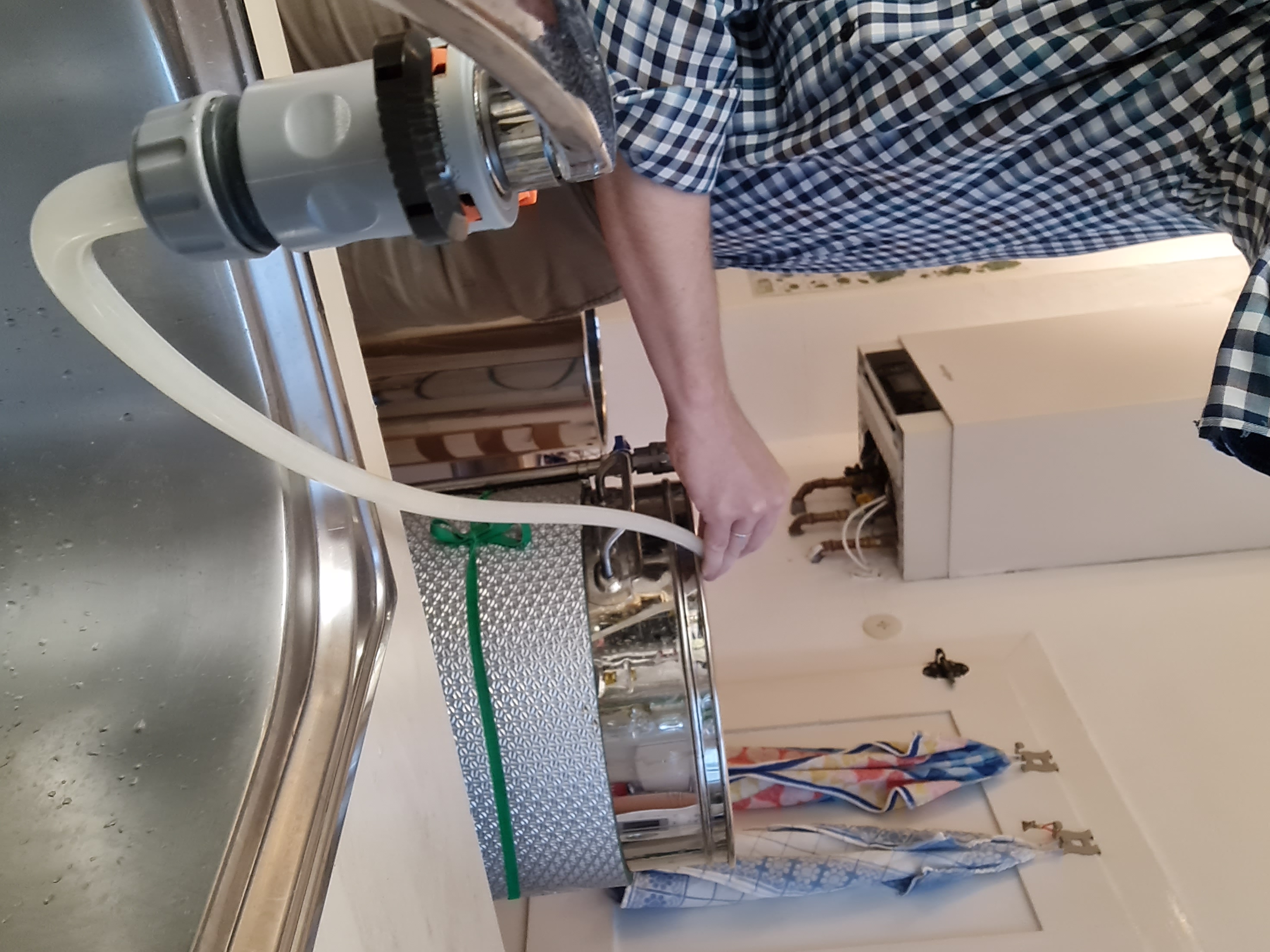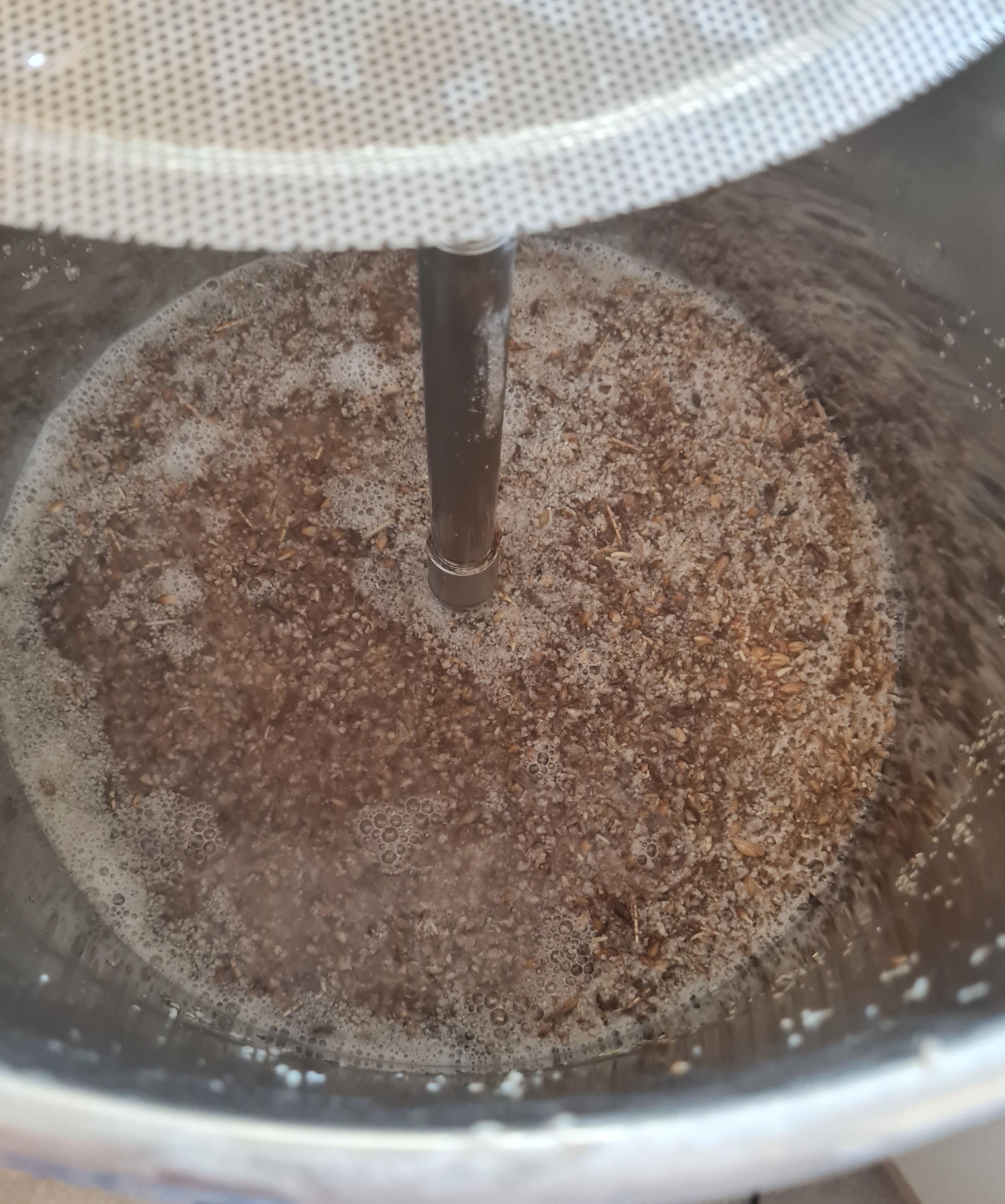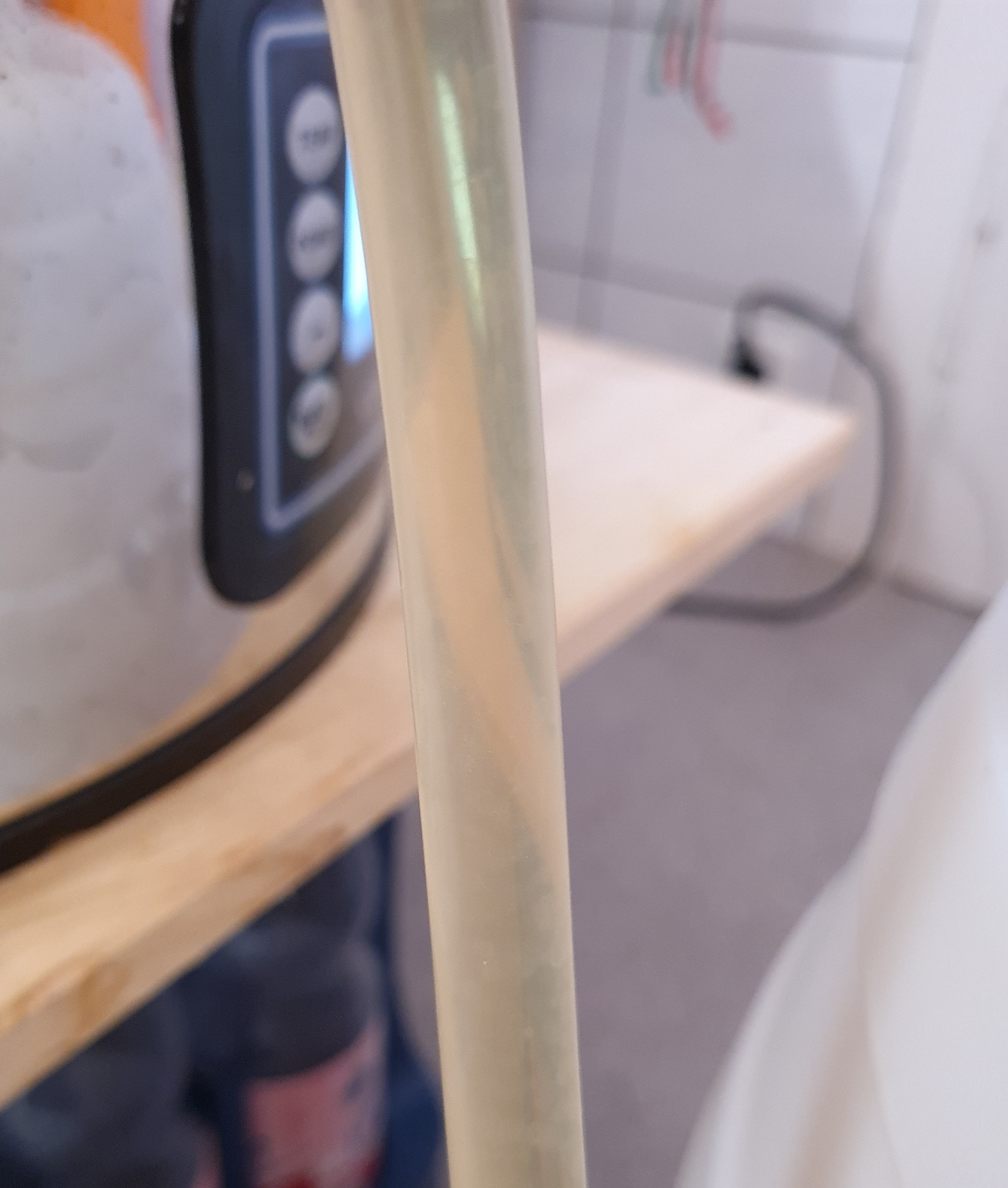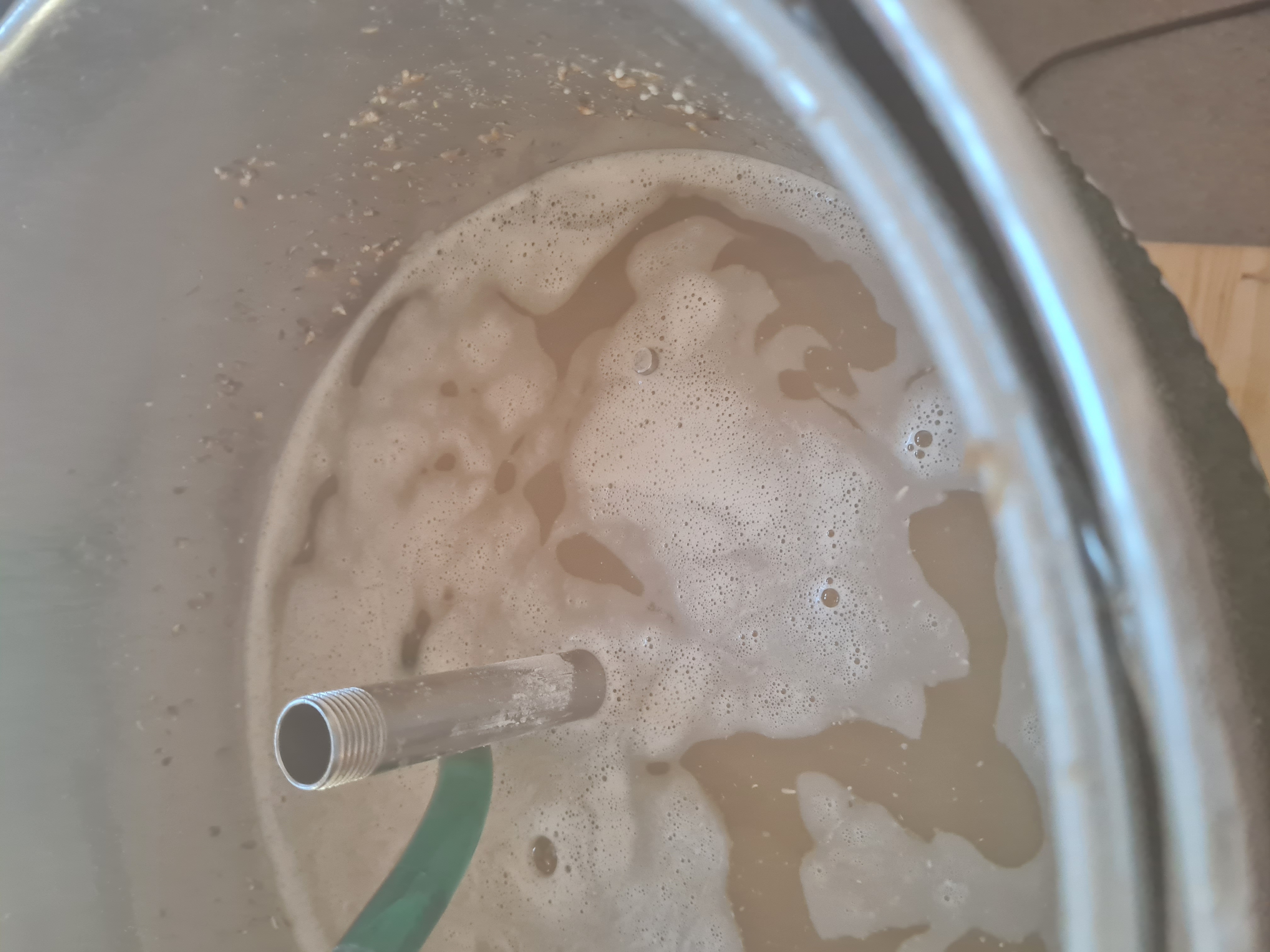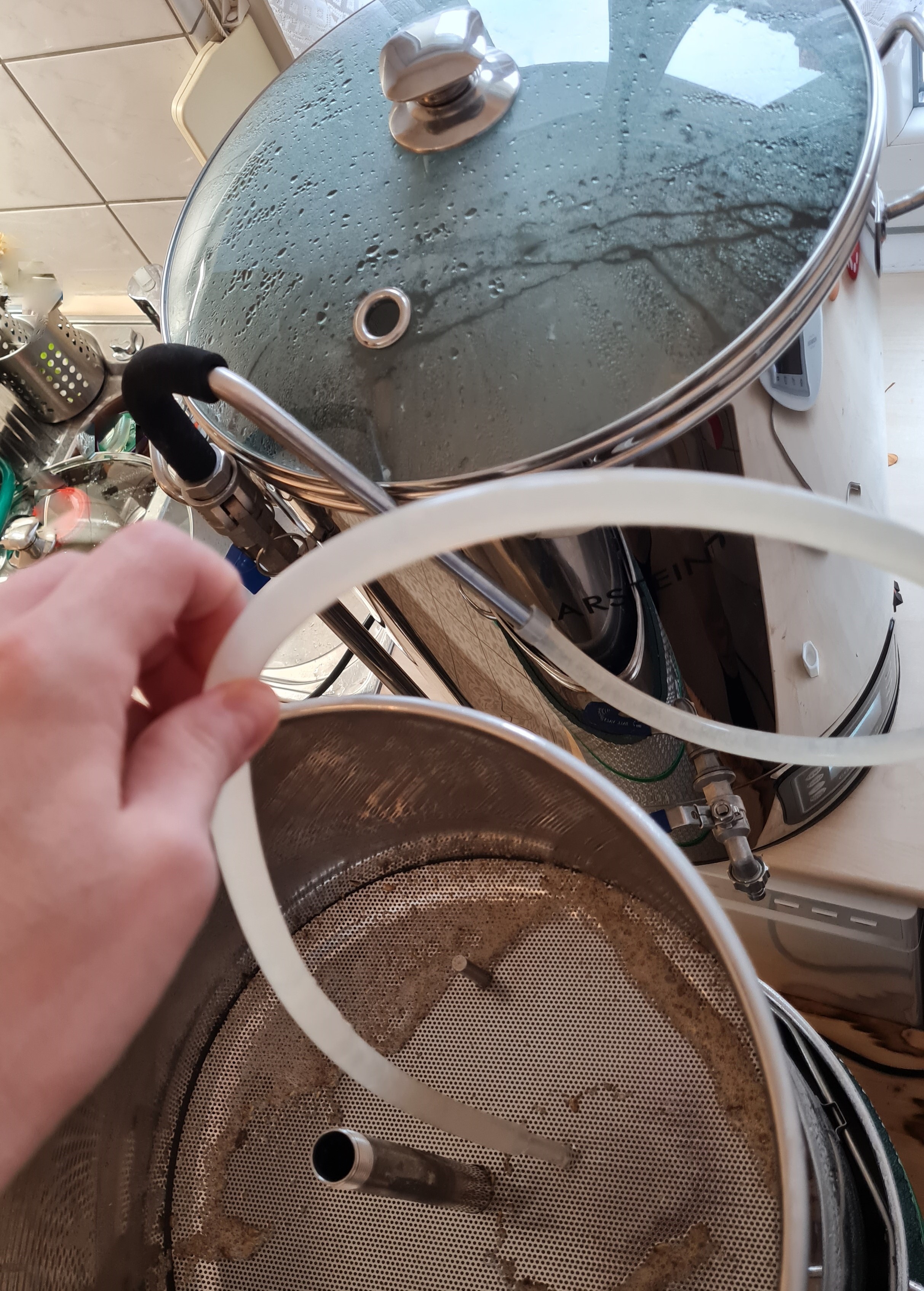 Mit dem zweiten Mundschenk lässt sich der Nachguss sehr bequem rüberpumpen. Meine Faustregel zum Läutern und Nachgießen: Den Malzkorb behutsam hochziehen und die überstehende Würze durchlaufen lassen bis keine Flüssigkeit mehr zu sehen ist. Dann den Nachguss geben, bis der Silikonschlauch zu heiß zum Festhalten wird. So habe ich zwischen 0,5 und 3 cm Wasser über dem Treber stehen und kann das obere Blech als Verteiler drauf lassen. Mit diesen kleinen Nachgüssen bleibt die Durchflussgeschwindigkeit annähernd konstant und die Nachgüssen sind immer richtig temperiert. Zeit für meine Läuterhalbe.