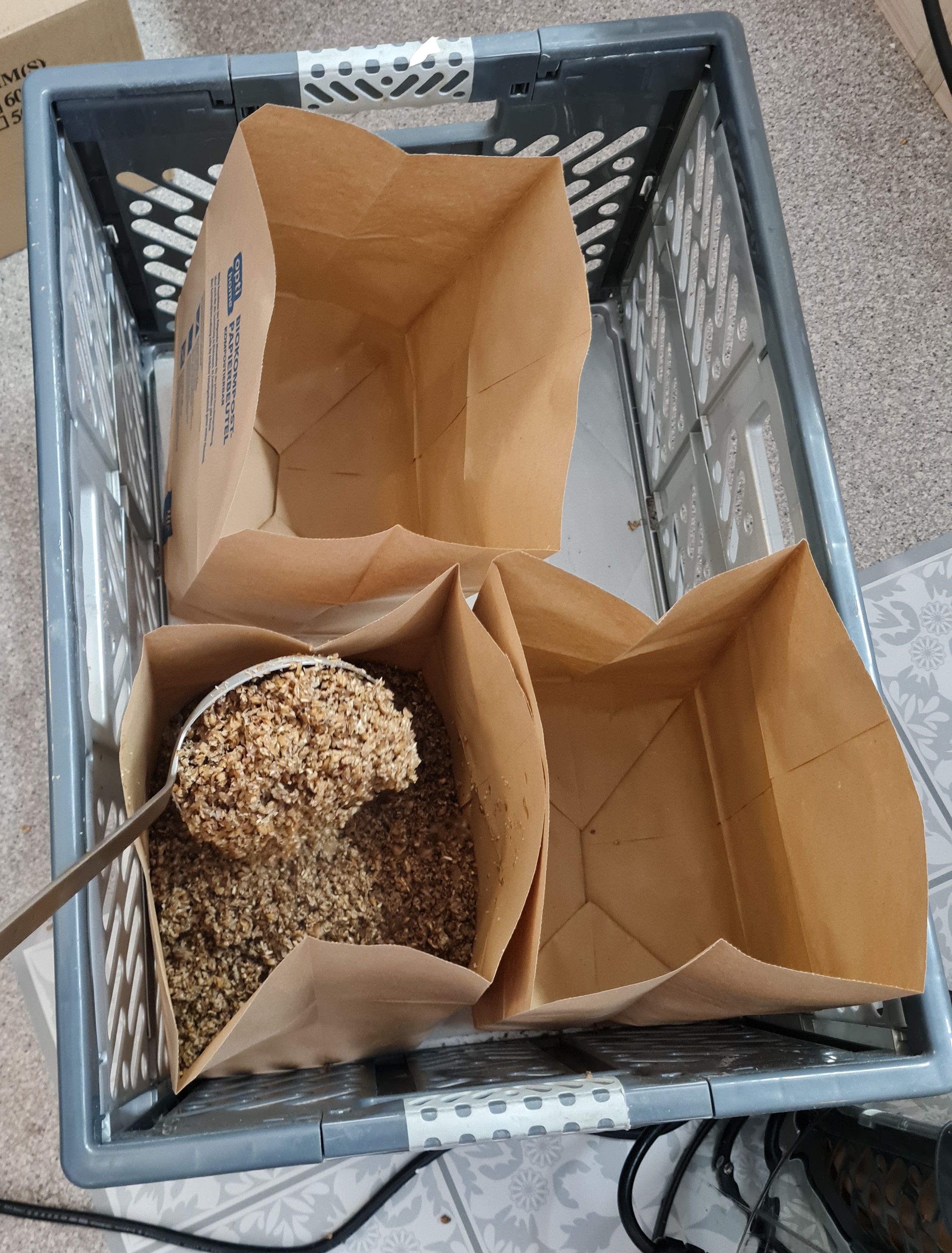 Los geht es mit der Zusammenstellung der Schüttung aus meinem „Malzlager“. Ich habe mich für Golden Promise als Hauptbestandteil entschieden. Ergänzt wurde die Schüttung durch einen Rest deutschen Pale Ale Malzes (eigentlich nicht vorgesehen, aber ich wollte das einfach aufbrauchen) und kleine Gaben CaraHell und CaraMünch II.