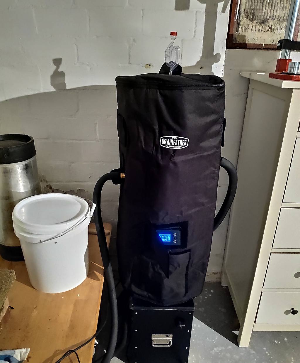Da für einen Kühlschrank kein Platz mehr ist, steht das 30l-Gärfass im 50l-Topf, der mit Wasser aufgefüllt wurde um die Temperaturträgheit zu erhöhen.