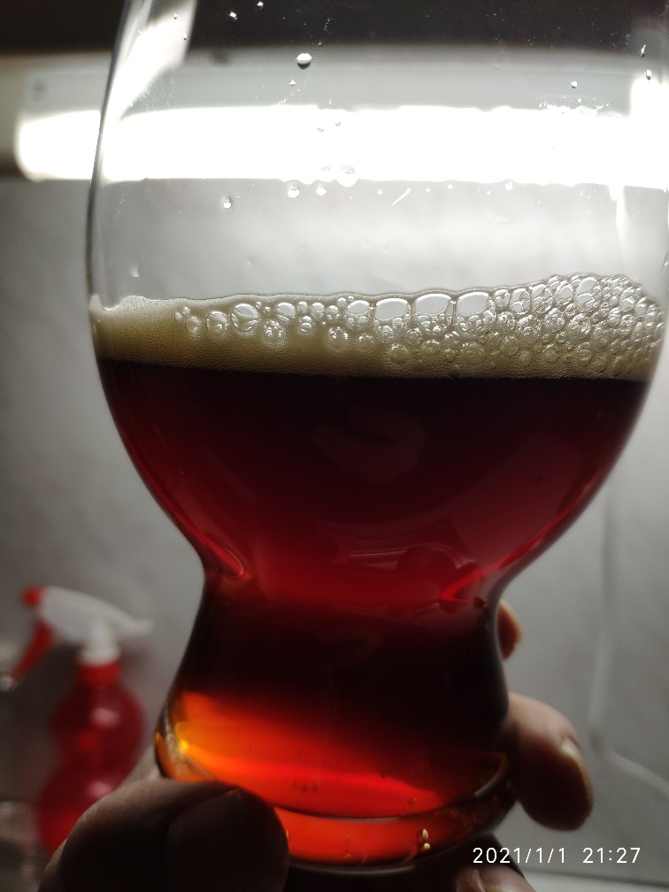 Erneut ein obergäriges Bier mit Comet aus dem eigenen Garten. Beim Einschenken zeigt sich ein mittelporiger Schaum, der Anfangs schön dicht ist, allerdings schnell zerfällt. Es steigen feine Bläschen im Glas auf. Das Bier ist sehr klar (wenn man nicht versehentlich etwas Hefe aufschüttelt) und leuchtet in hellem Gelb. Im Geruch ist es leicht malzig mit schönen Zitrusaromen. Ich habe ein weiches Mundgefühl und der Körper erweist sich als weniger malzig als im Geruch vermutet. Es handelt sich hier um ein eher herbes Bier mit einer angenehmen Spritzigkeit und einer, für meinen Geschmack, etwas harschen Bittere. Im Nachgang bleiben schöne Aromen von Zitrusfrüchten am Gaumen hängen. Dieses Bier hätte ich nicht als obergärig erkannt.