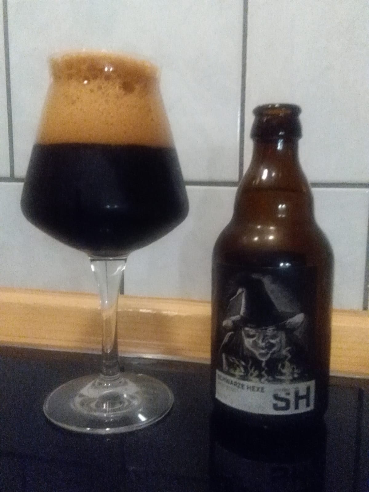 Als viertes Bier hatte ich die "Schwarze Hexe" im Glas, ein Dry Stout. Ein trockenes sehr komplexes Bier, was lecker nach Lakritze und Espresso riecht. Im Abgang fand ich etwas zu bitter, für meinen Geschmack, dass lag bestimmt am Röstmalz. Eventuell lag es auch daran das dieses Bier gut 10 Monate alt war. Als Vergleich habe ich mir anschließend ein ähnliches Kaufbier geöffnet und Stefan's Bier war viel besser. Das unterstreicht wieder den Spruch " gutes Bier ist selbstgemacht". Auch hier hat Stefan ein gutes Bier gebraut.