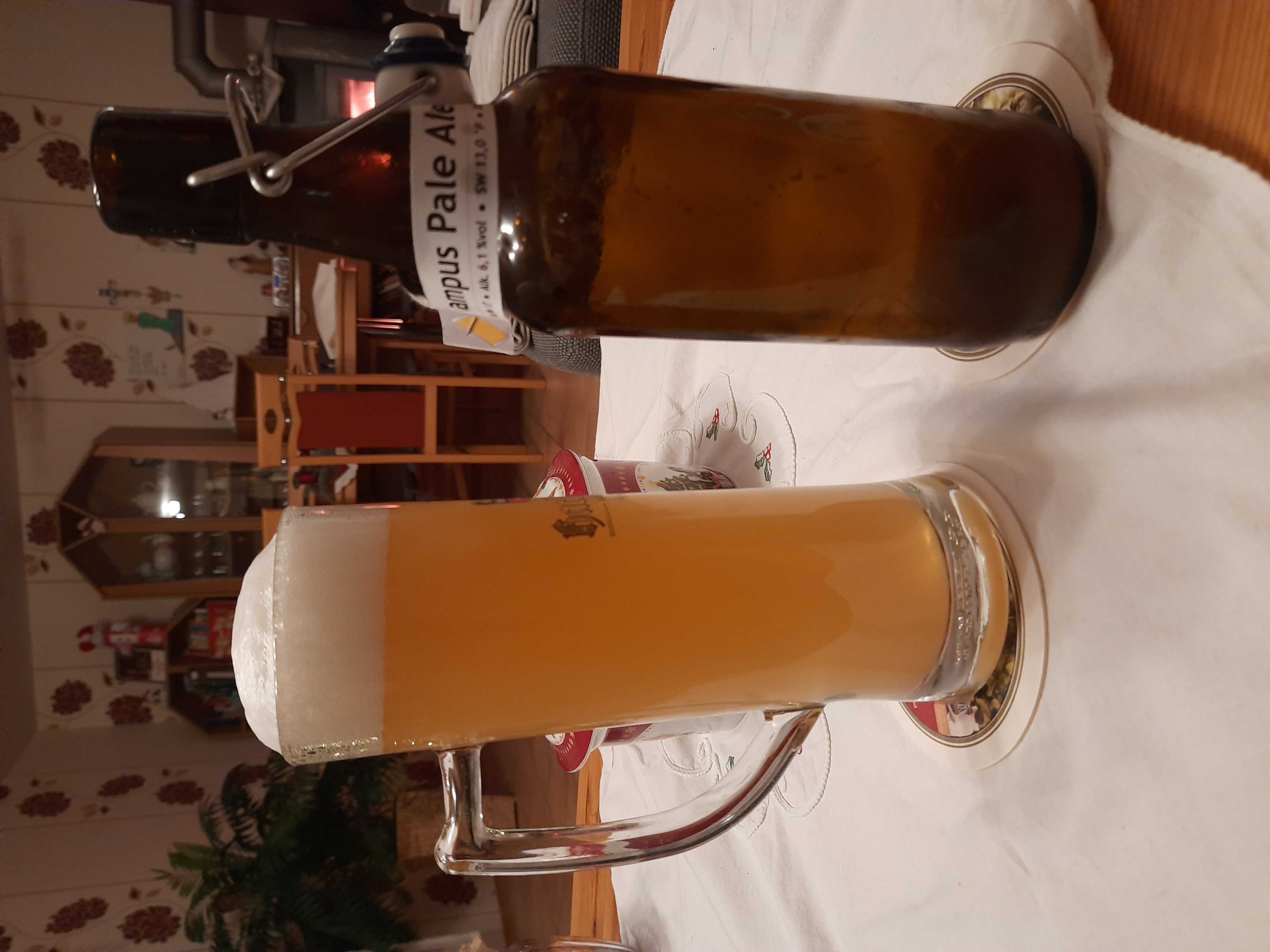 Das letzte Bier war das "Campus Pale Ale". Manfred hat das so genannt, weil das Rezept von einem Online-Braukurs der Campus-Brauerei der Uni Hannover stammt. Dieses Bier war mein absoluter Favorit. Vom Rezept her total einfach, Single-Malt (nur Pale-Ale-Malz), Single-Hop (Hallertauer Cascade) und Kombirast.