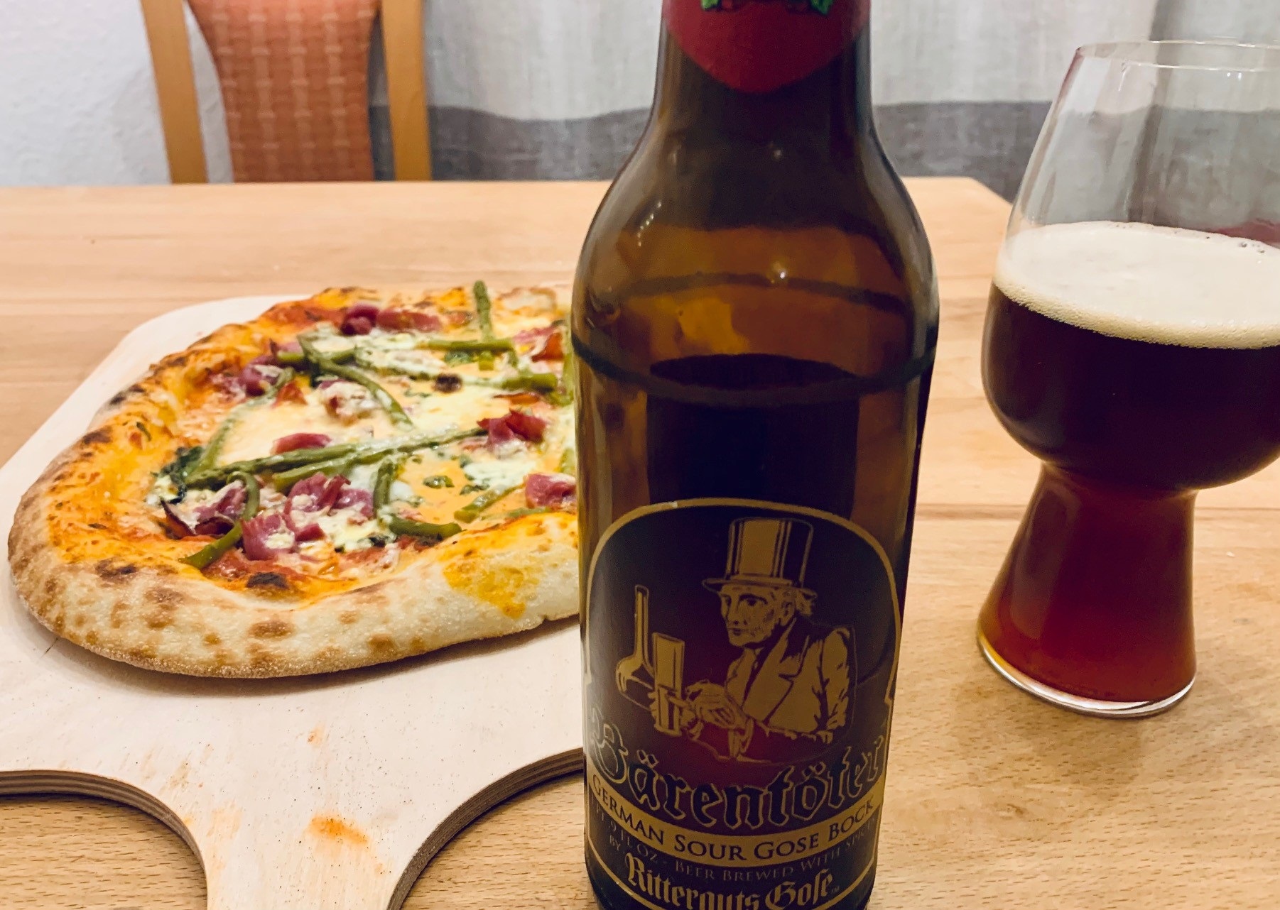 Ich darf Bärentöter Gose :Bigsmile . Die passt unfassbar perfekt zur Pizza mit grünem Spargel, Hollandaise und schön salzigem Katenschinken.