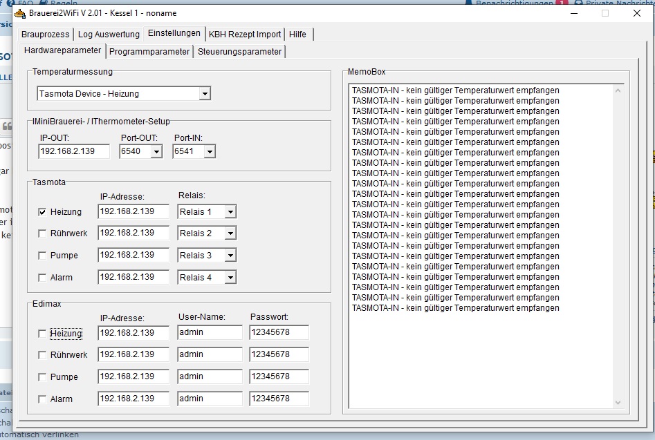 Habe jetzt Tasmota drauf. War das ein Akt, hat zig mal nicht funktioniert obwohl keine Fehlermeldungen. Hab Den TH16 im Webinterface und konfiguriert. Der ist damit logischerweise auch im W-Lan bzw. Netzwerk. Leider bekomme ich keine Verbindung zur Brausoftware bzw. gibt sie "TASMOTA-IN - kein gültiger Temperaturwert empfangen" aus. Die IP vom Tasmota habe ich eingegeben. Die Software schaltet den TH16 auch wenn ich auf Start des Brauvorgangs drücke.emilio hat geschrieben: Dienstag 19. Januar 2021, 20:05 Hallo Micha.