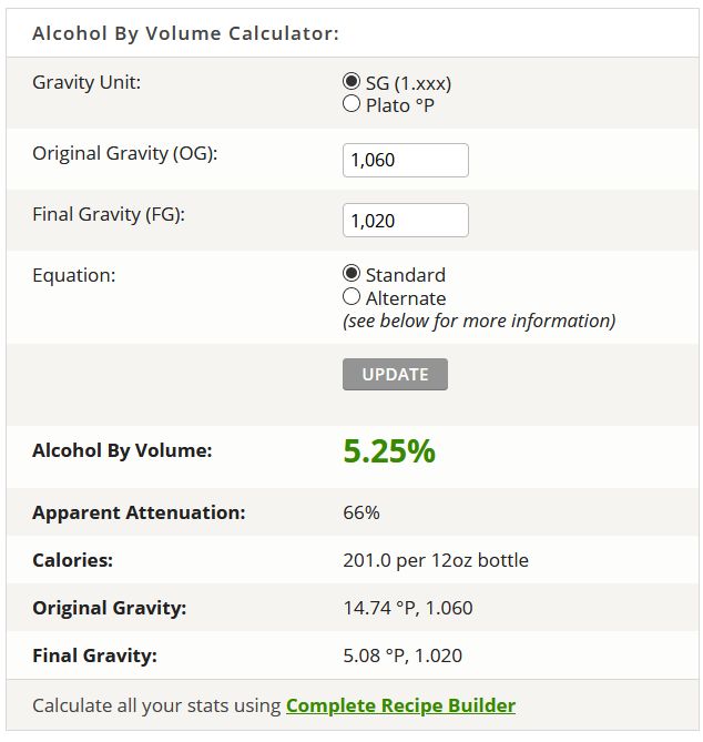 Wenn Du auf deiner Berrechnungs-Seite Deine Daten eingibst kommt folgendes: Im unteren Bereich werden SG 1.060/1.020 und dazu gehörende °P 14,74 / 5,08 angezeigt.