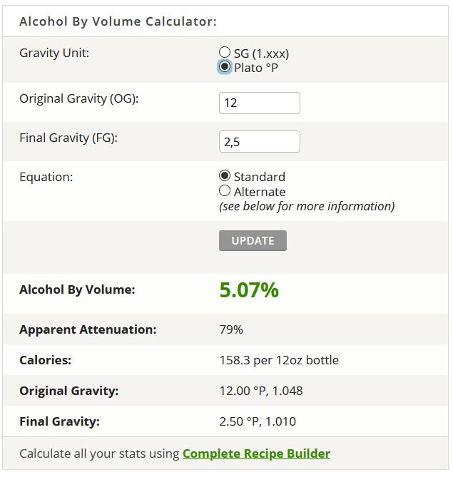Da hat der Rechner dann auf einmal oben OG 12°P und FG 2,5°P angezeigt.