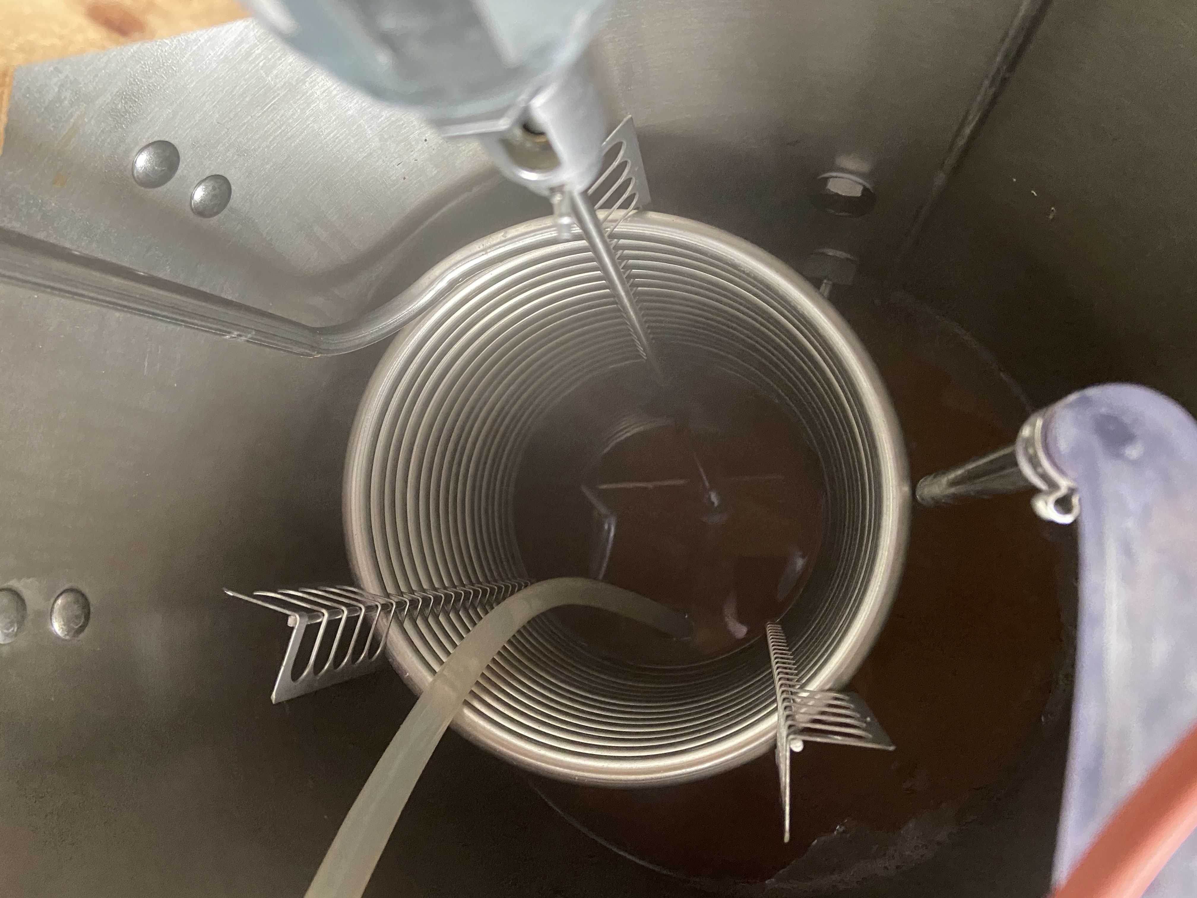 Ich hab die Maische in der Läuterbottich mit der Läuterhexe umgeschöpft. Während der 20 Minuten Läuterpause wurde die Pfanne gereinigt, der Kugelhahn eingebaut, das Rührwerk zum kochen und der Kühler eingesetzt