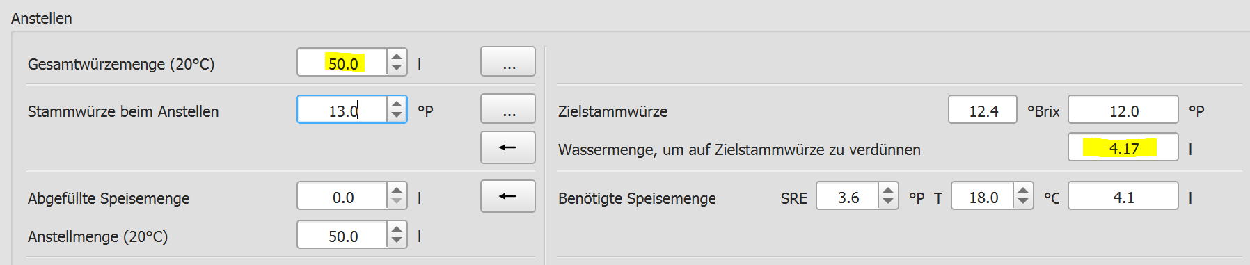 - Gesamtwürzemenge (20°C) eintragen (in diesem Fall kannst du auch die Zahl bei Anstellmenge (20°C) eintragen, da kein Speise)