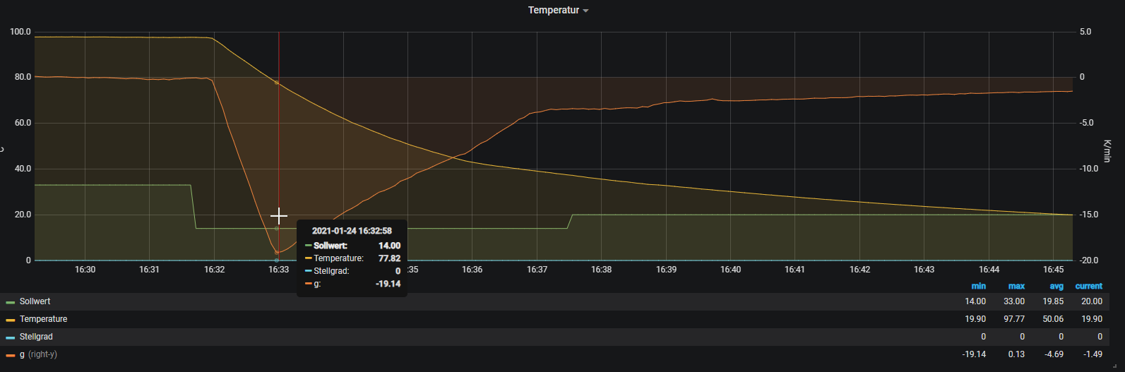 Die Regelung ist auf +/- 0,25 K gelaufen. Vom Stellgrad her wäre ein etwas kleinerer I-Wert sicher noch optimaler, aber es läuft so recht schnell und auch sehr stabil. Der Zyklus für die Berechnung der Zwischenstellgrad beträgt 300s . Damit ist jedes % zwischen den Stufen 15s lang.