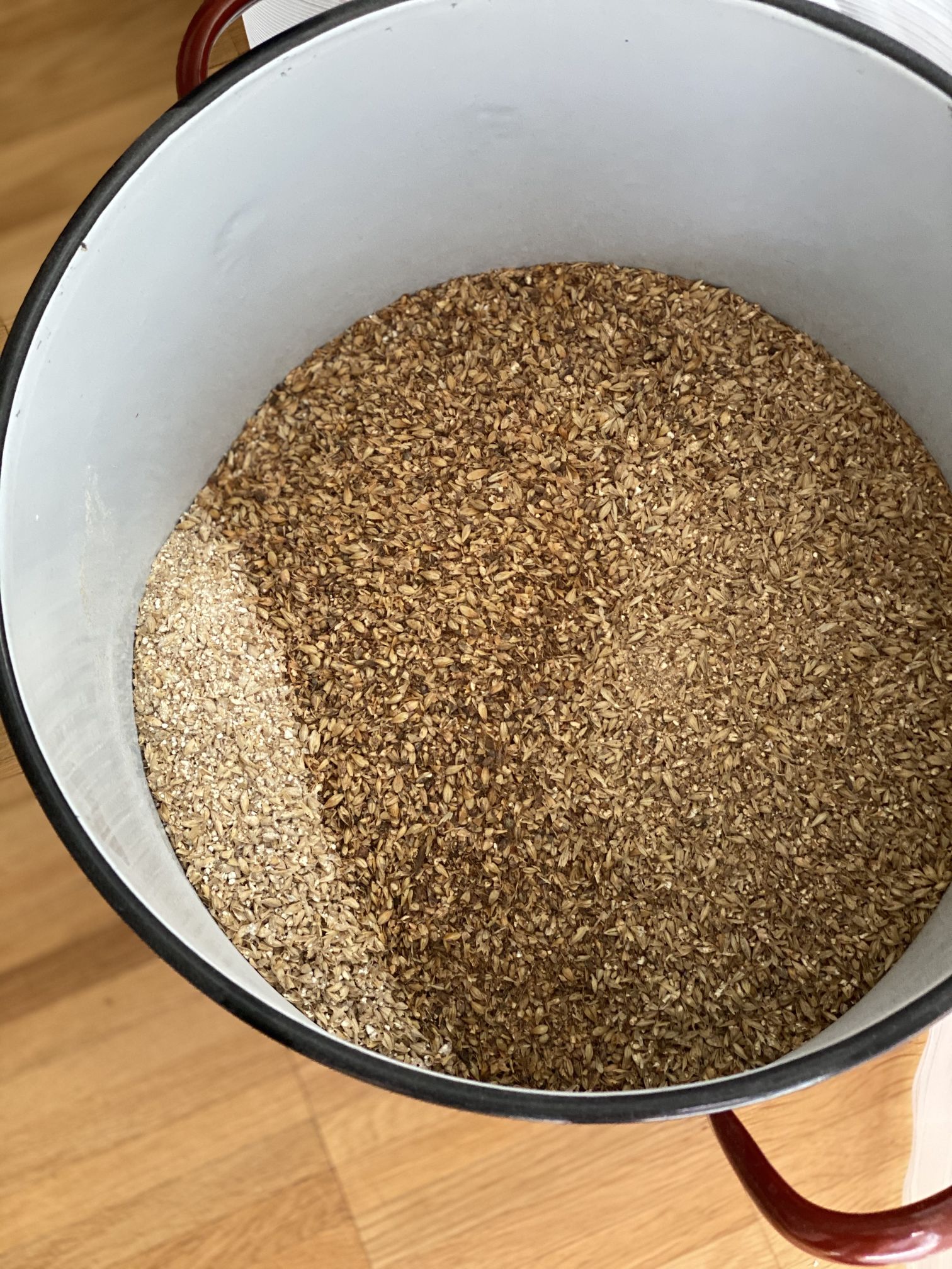 Anschließend wurde sämliches Malz in einem alten Topf gemischt und durfte dann im Mundschenk bei einer Einmaischtemperatur von 54°C baden gehen.