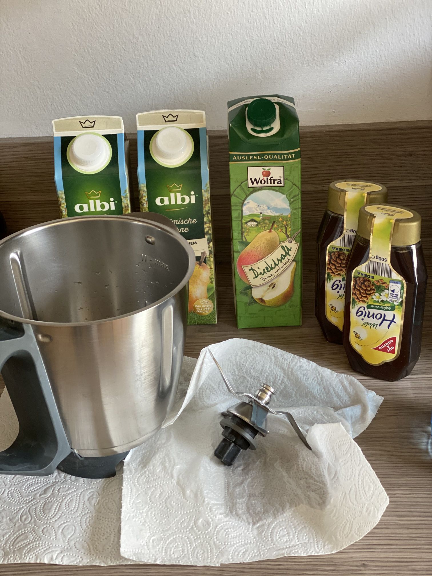 Nach ca. 4 Tagen Hauptgärung kam ein Gemisch aus Honig und Birnensaft mit ca.18°Brix zum Jungbier (nennt man das schon so?) hinzu. Das Ganze wurde bei 37°C im Allzweckrührgerät gemischt.