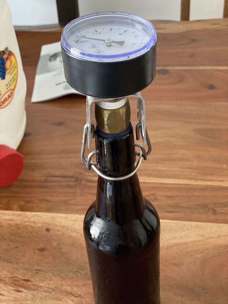 Nachdem die Flaschen befüllt waren, wurden diese noch mit Kronkorken verschlossen. Eine Flasche bekam zwecks Überwachung des Flaschendrucks noch ein Manometer.