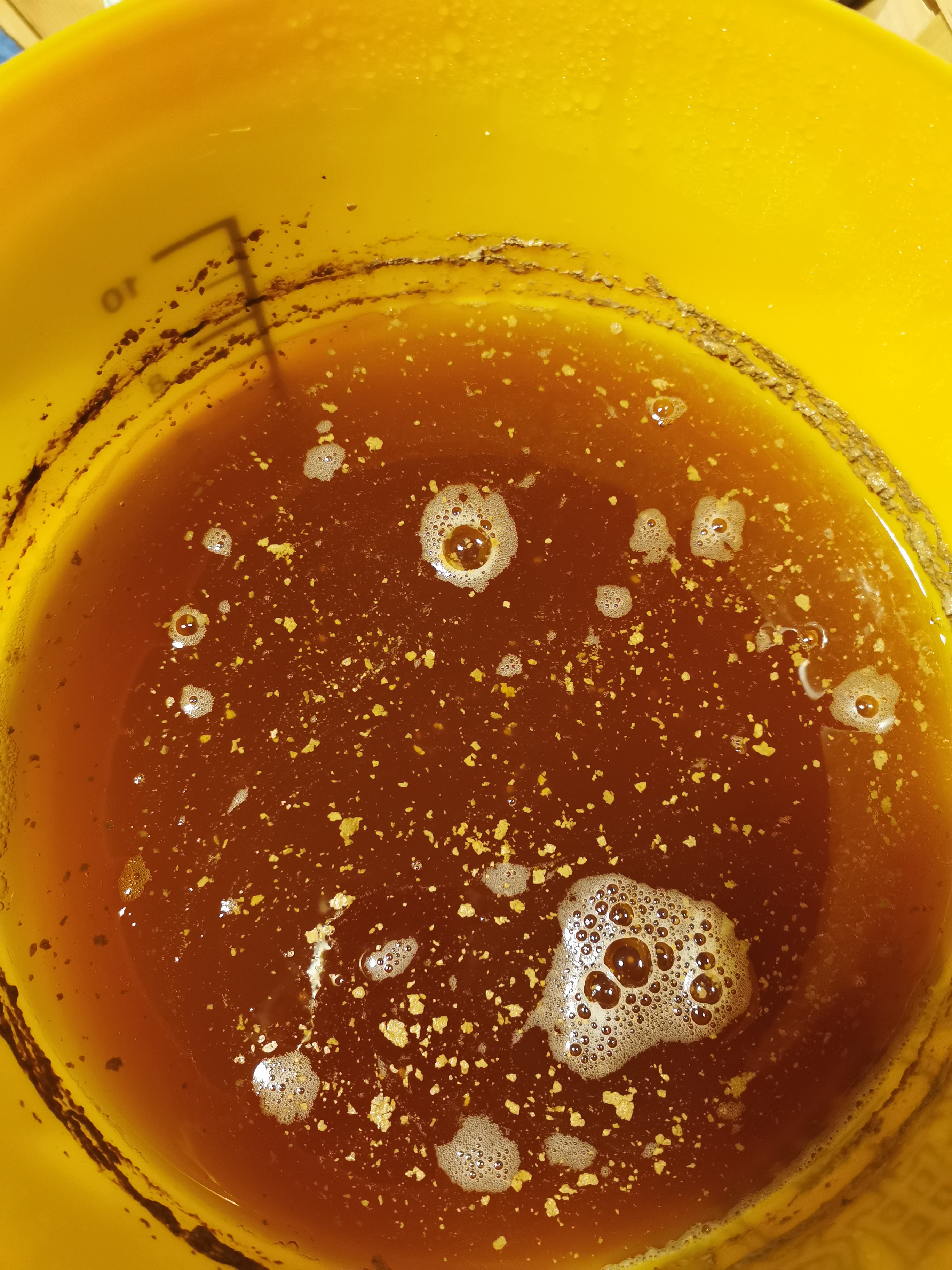 Leider hat es sich nicht weiter verändert, ich hab immer noch diese Krümel nicht nur auf der Oberfläche sondern auch drinne schwimmend. Ich glaub das ist unvergoren Hefe, kann das sein? Kann ich was dagegen tun?
