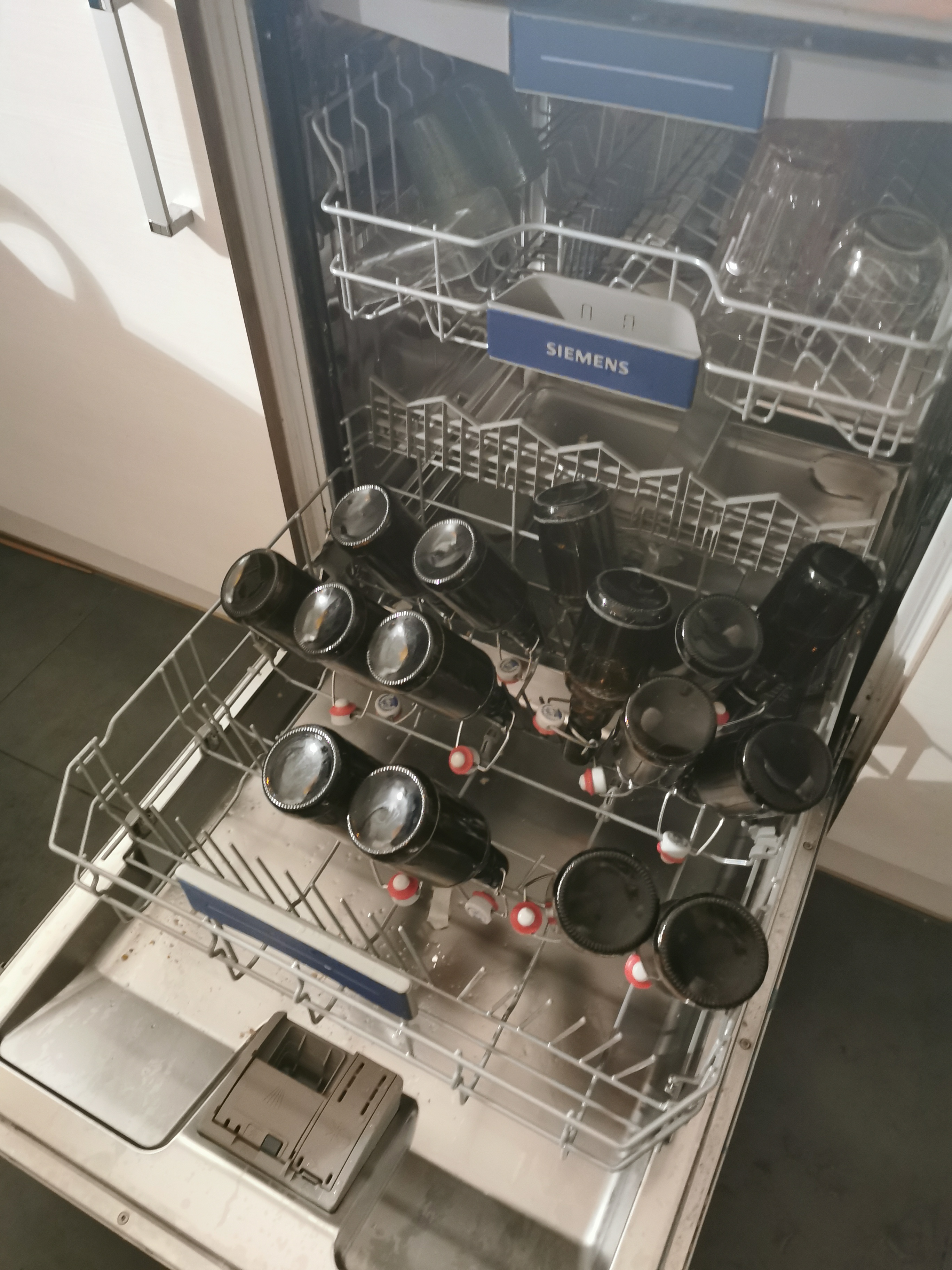 Flaschen und Equipment erstmal sorgfältig im Geschirrspüler und später mit Oxi gereinigt. Die Flaschen mithilfe einer Dosierhilfe mit Zucker befüllt. Und dann endlich kommt das Bier in die Flaschen. So geschafft, jetz werd ich wie Tommi geschrieben hat es im kühlerem Keller stehen lassen.