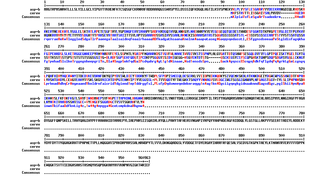 Hier das Ergebnis (multalin alignment): Die Zeile "Consensus" bezeichnet die Übereinstimmung zwischen den beiden Sequenzen. Große rote Buchstaben bedeuten identische Aminosäuren, kleine blaue zeigen eine chemisch verwandte, aber nicht identische Aminosäure an.