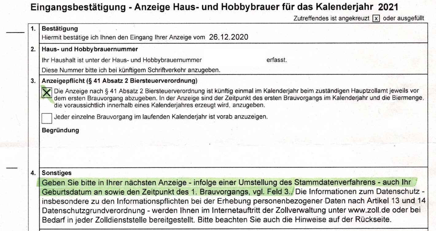 Ich verstehe immer noch nicht, warum das Geburtsdatum zur eindeutigen Idenfikation auf eimal notwendig sein soll, wenn ich a) bereits eine Hobbybrauernummer zur Identifikation habe und b) dieses Datum in den Vorjahren nie erforderlich war. Aber immerhin konnte man schön mit Paragraphen umher werfen.