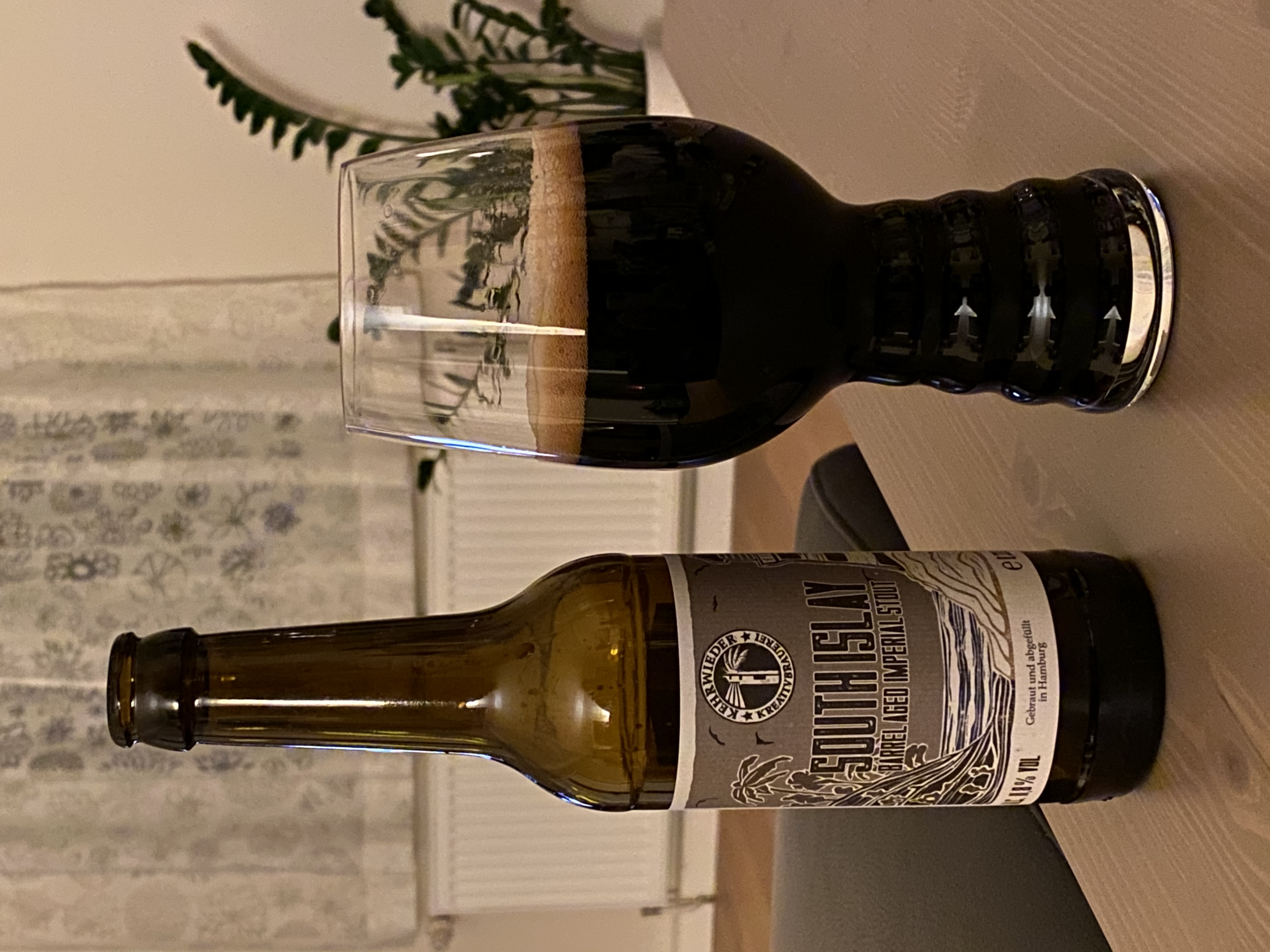 Kehrwieder South Islay: Imperial Stout aus dem Laphroaig Fass. Bahnschwelle in Bier. Muss man mögen. Ich liebe Islay Whisky, insbesondere Laphroaig und Lagavulin. Hier hätte ich mehr Torf erwartet. Mein Favorit der Barrel aged Stouts wird das nicht. Ich schmecke da eher geräucherten Hering in Dunkelbier. Ist jetzt nicht schlecht, aber Kentucky und Moustique sind m. E. besser.