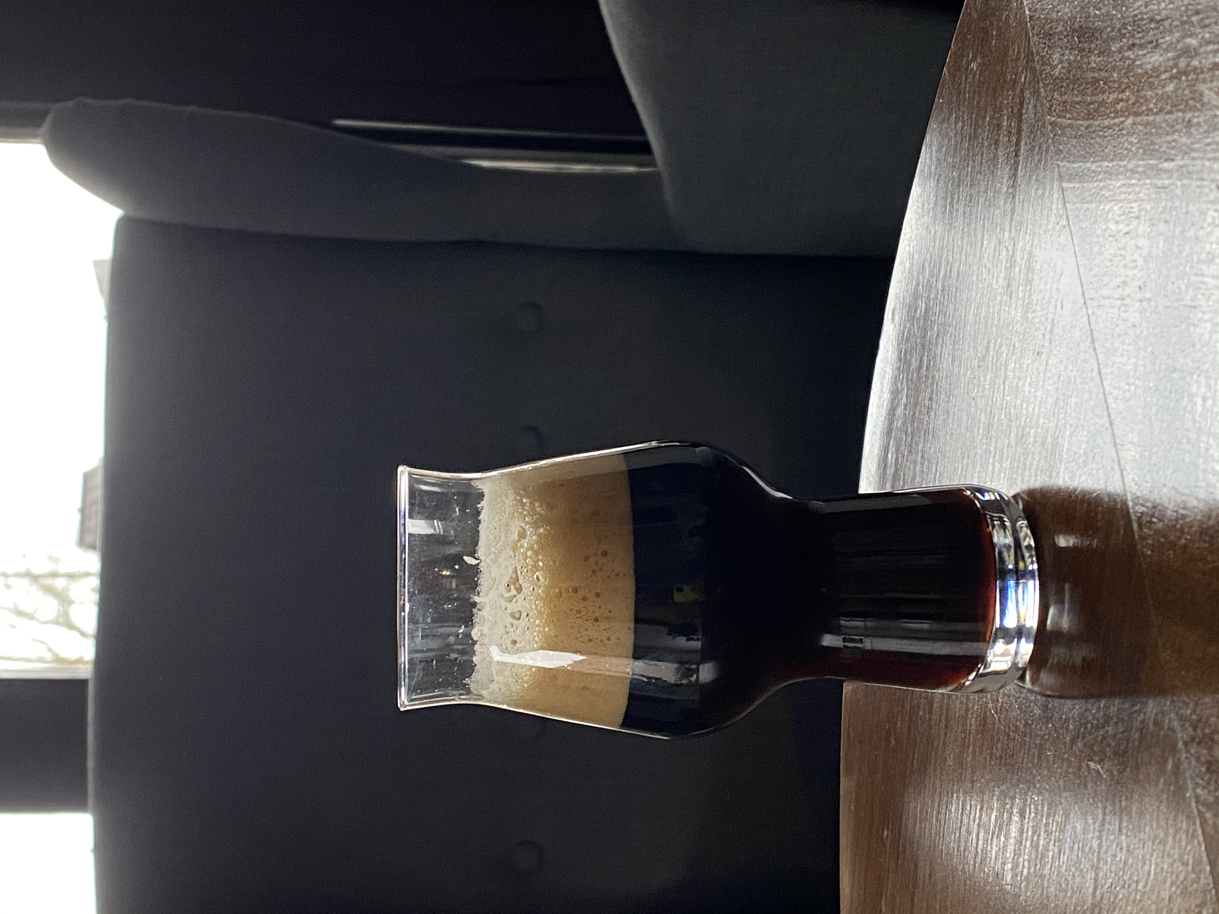 Ich probiere gerade unser Winter Special. Ein Baltic Porter, 19 * Plato, UG mit W 34/70. Hat knapp 8 % Alkohol und liegt jetzt seit sechs Wochen mit Bourboncubes im Keg. Durchaus trinkbar, kann aber noch etwas. Ist auch nur ein Probiergläschen, weil das Keg nur 10 Liter hat.