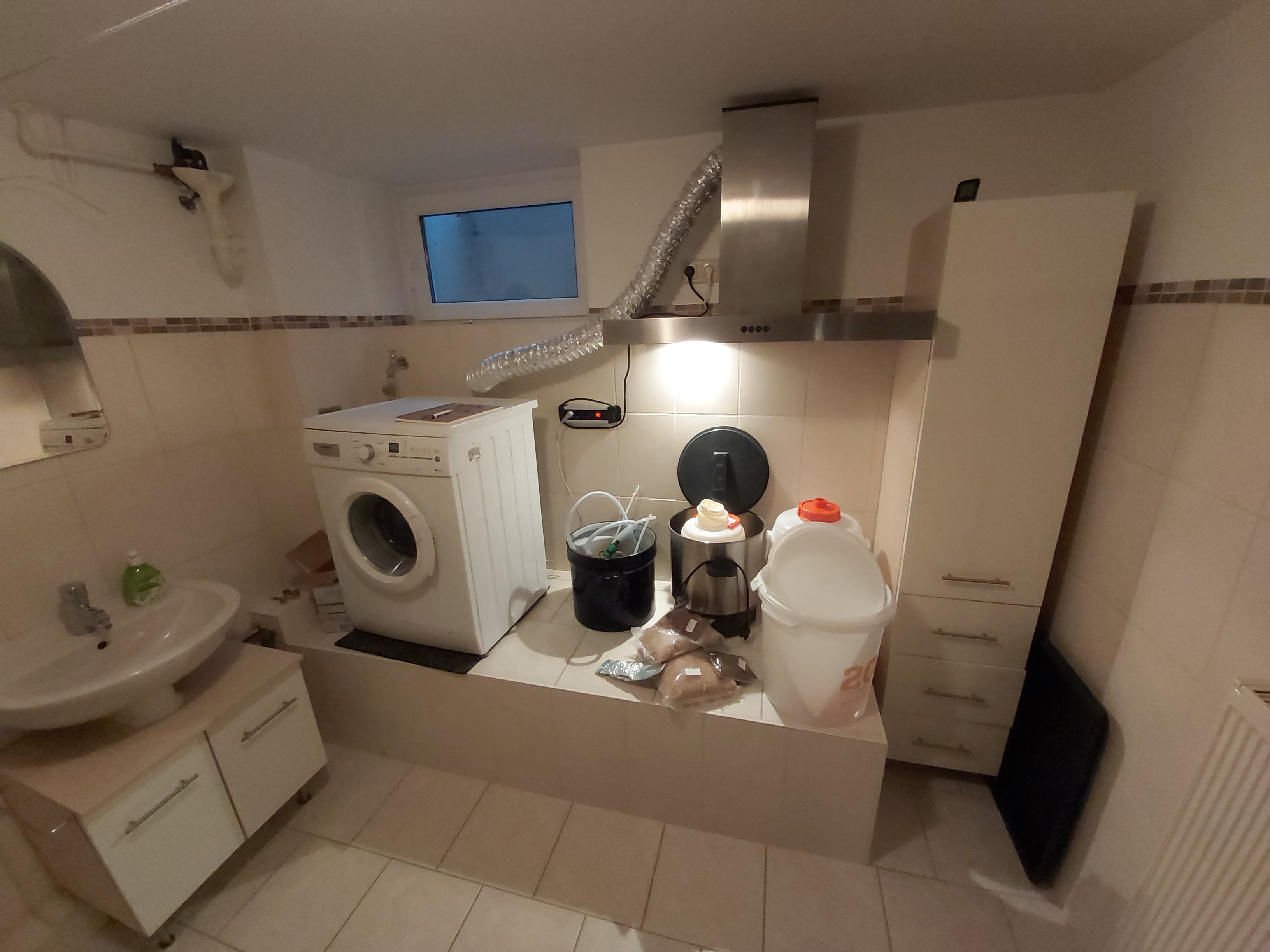 Weiterhin braue ich in unserem Wäschekeller, der neben einem Waschbecken auch eine Dusche hat (was zum reinigen der größeren Teile sehr praktisch ist - mit entsprechender Schutzmatte unten in der Duschwanne^^). Der Raum hat ca. 20 qm und demnach 50kbm Luftvolumen. Der Raum hat ein kleines Fenster (0,3qm) zwei Türen (eine zum Flur im Keller und eine zum Saunaraum, dort ebenfalls ein gleich großes Fenster) und einen 100er Abluftschlauchadapter mit Rückschlagventil für den Trockner (den wir nicht haben).