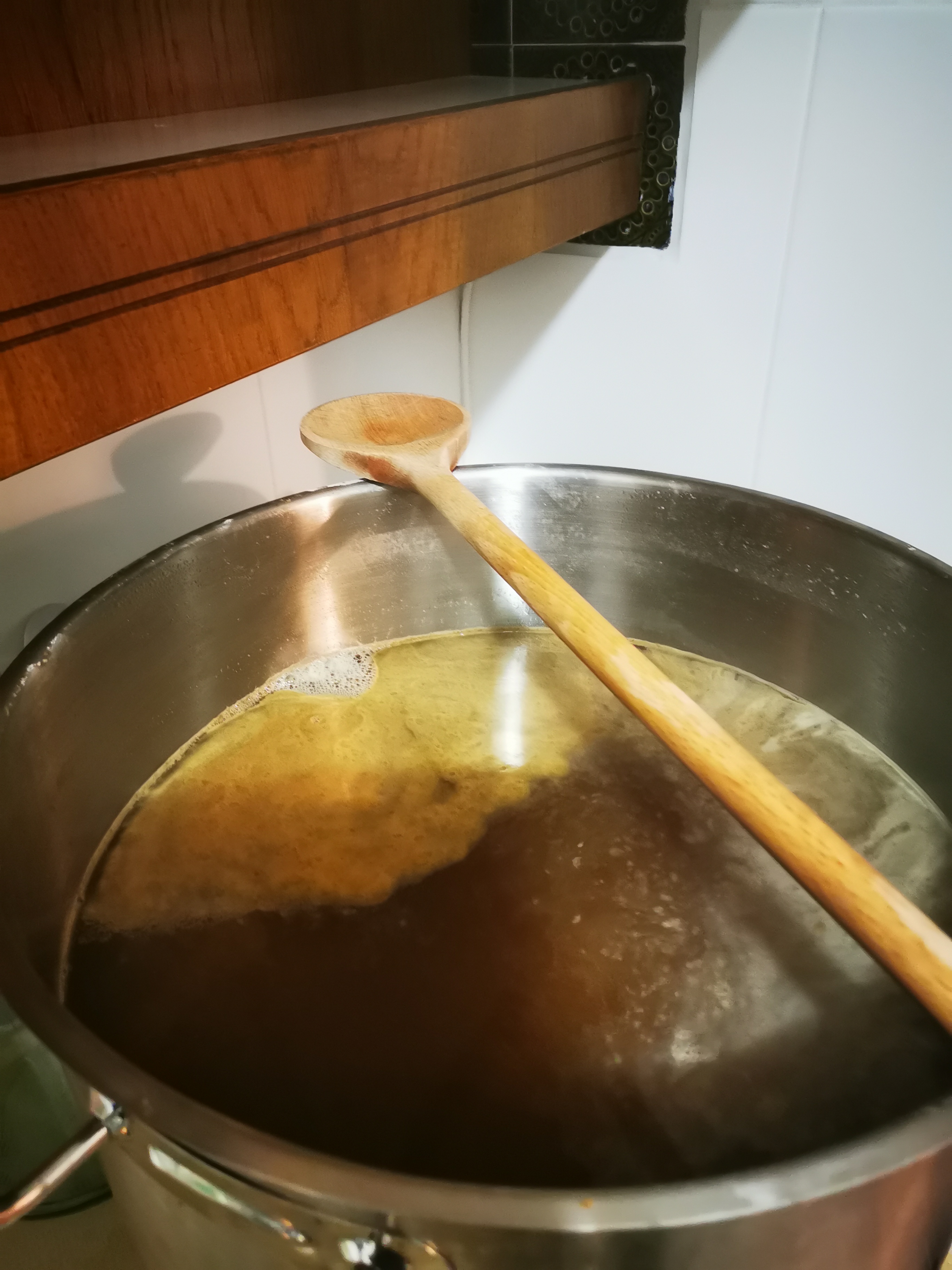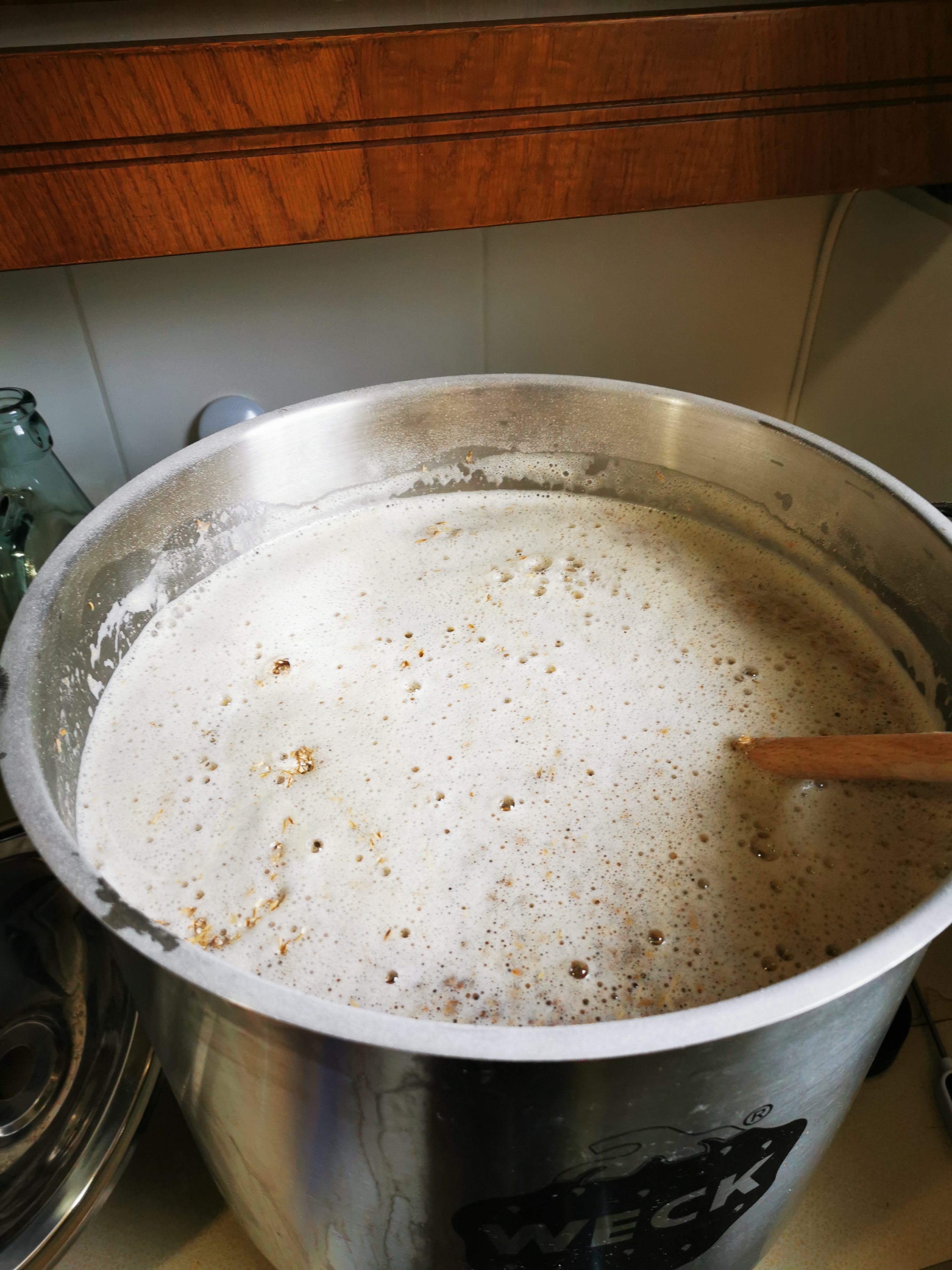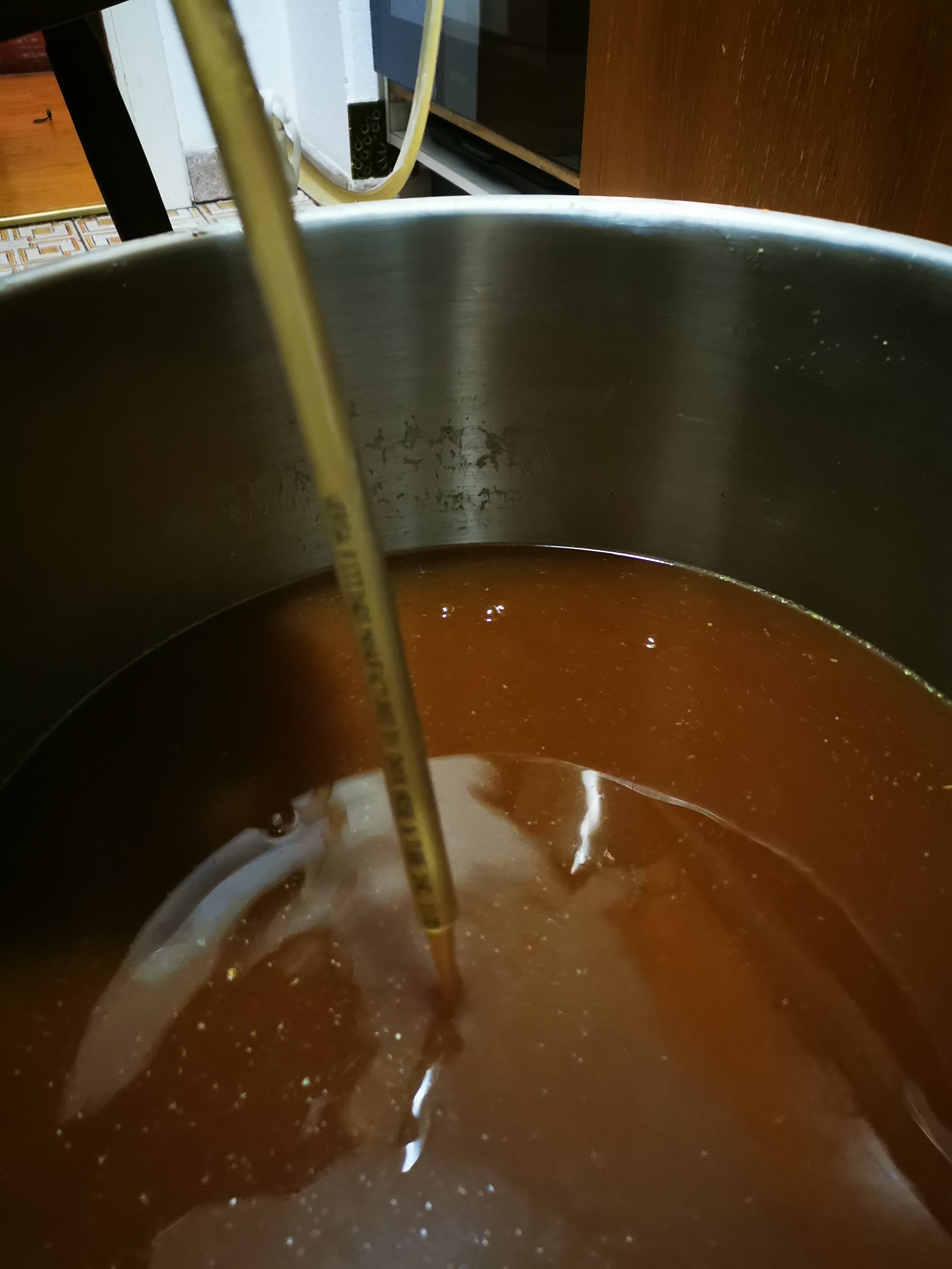Bierwürze befindet sich erst seit einem Tag in der Gärung. Da das ein Honigbock werden soll, kann das aber ziemlich lange dauern. Die erste Honiggabe von 500 ml(bei ca 20l würze) erfolgte nach dem Hopfen kochen. Die 2. Honiggabe, wieder 500ml, nach Ende der stürmischen Phase der hauptgärung.