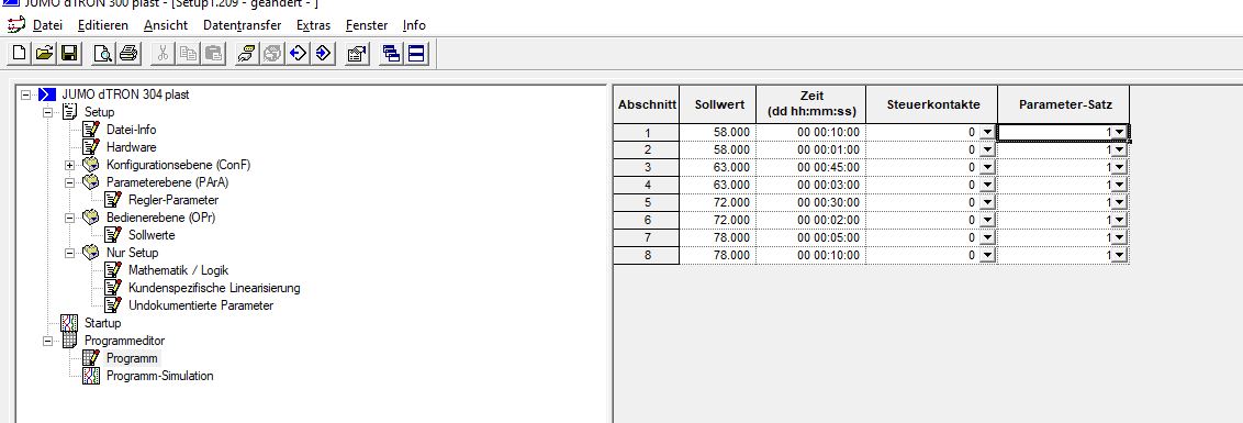 Das Programm für die Parametrisierung/Simulation ist kostenlos aber auf 30 Tage Laufzeit begrenzt. Für die Übertragung der Parameter in den Regler braucht man ein spezielles USB Kabel. Bei Jumo kostet es 140,- was viel Geld ist. Man kann die Programmparameter aber auch direkt am Regler eingeben. Das ist recht übersichtlich gemacht und m.E. ausreichend. Da ich zumeist mit ähnlichen Rasten braue ist das kein Problem. Für das erste