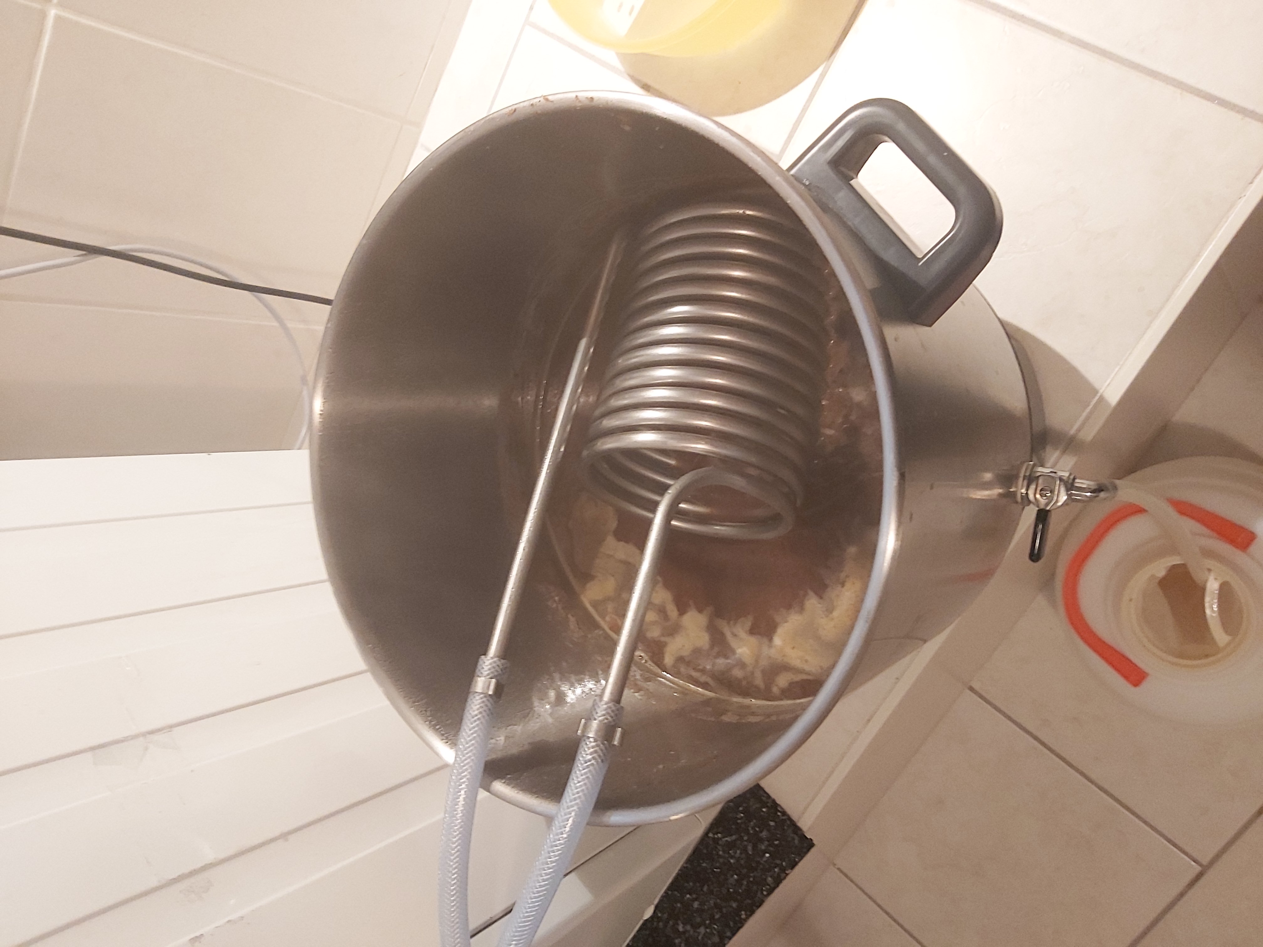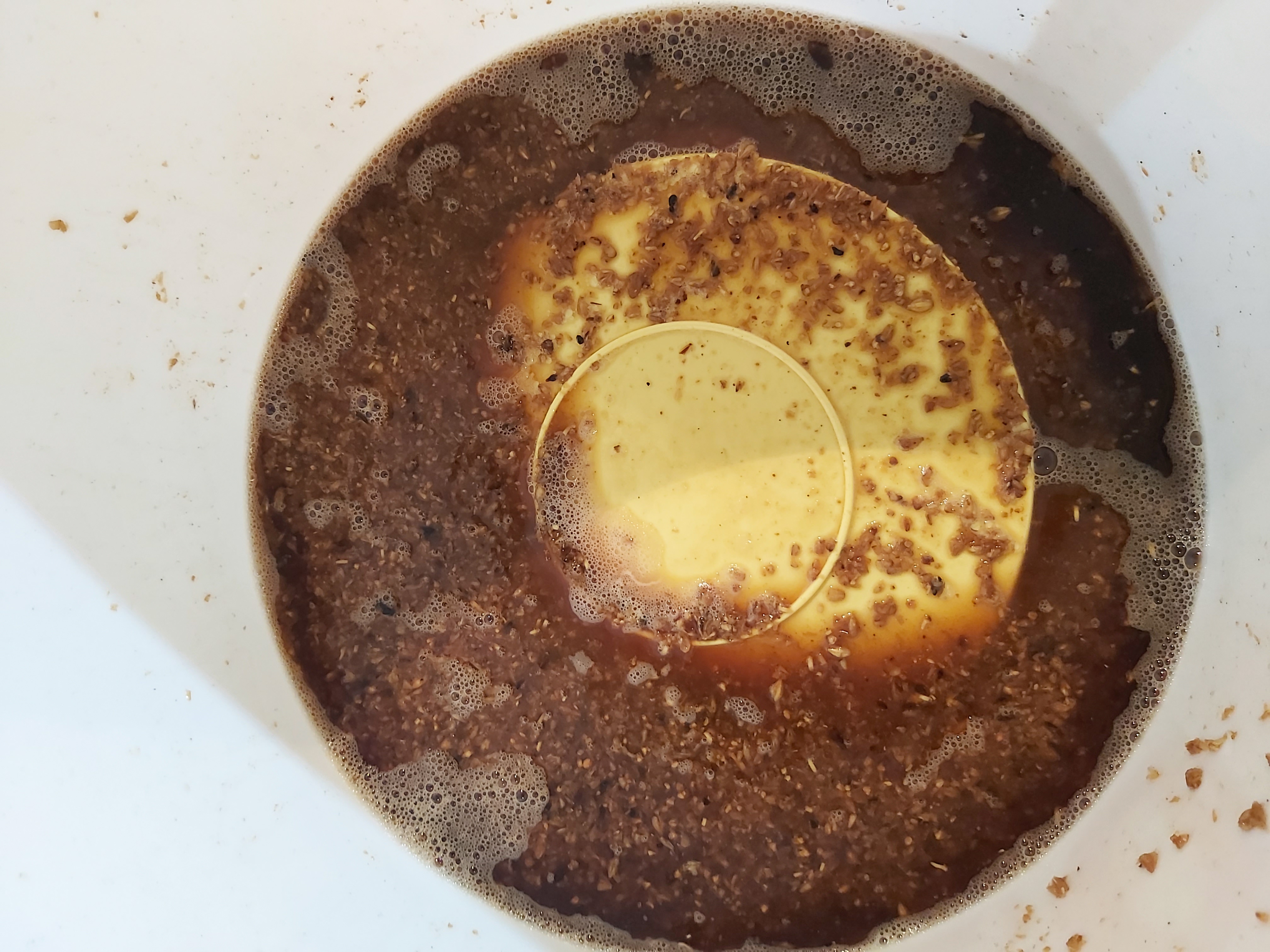 Und dann ging das Theater los: Die Kühlspirale ist für diese kleinen Mengen nicht wirklich gut geeignet, mit 20l-Suden geht das erheblich besser. So war irgendwann bei 35°C Schluss und ich habe in den Gärbehälter abgefüllt. Da hat sich dann zum Schluss mal wieder wunderbar der Hopfenfilter zugesetzt (wie ich das doch liebe), so dass nochmal gut 1 Liter Flüssigkeit verloren gegangen ist. Dort waren wir dann bei 24% Brix und ca. 5,5 Liter, so dass ich nochmal gut 1l Wasser nachgefüllt habe und wir bei 21% Brix gelandet sind. Spindel sagt 21°C Plato (alle Werte ein bisschen gerundet und fertig) und dann hab ich auch gleich bei 31°C die Hefe zugegeben (nachdem die auch bei 30°C rehydriert wurde). Soll laut Anleitungen und einigen Forenberichten kein großes Thema sein und ich vermute, durch die angegebene Geschmacksneutralität der Hefe und den röstigen Aromen sollte da was brauchbares rauskommen.
