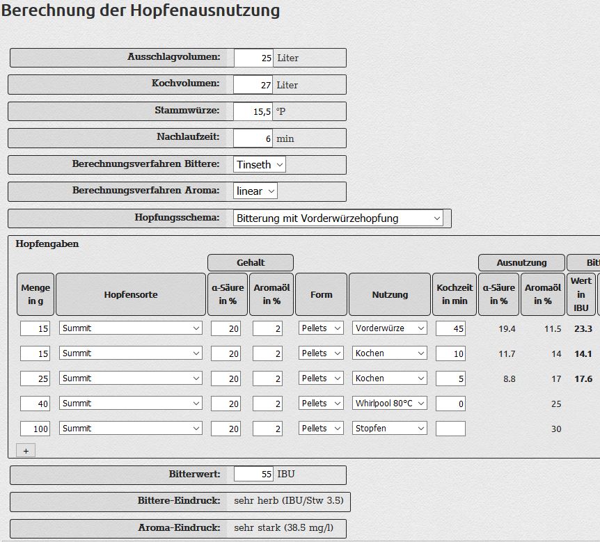 Ich hab 2018 mal ein single hop mit Summit gemacht. Es war ein 15,5P-IPA mit 55IBUs. 2 g/l im WP, 4 g/l gestopft.