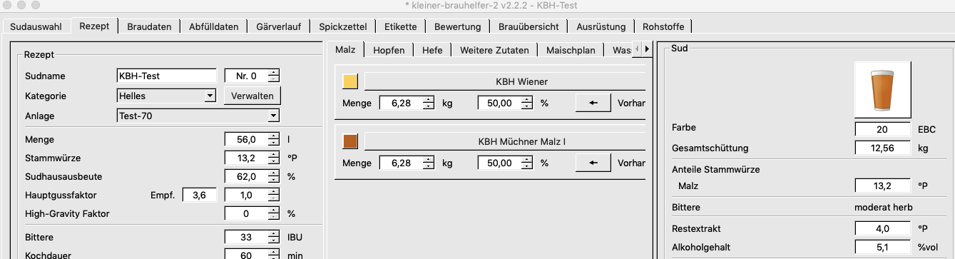1. Bei Malz kann der Hobbybrauer diese Unterschiede negieren. Wichtig ist den Mittelwert EBC des Malzes richtig im Tab Rohstoffe einzugeben.