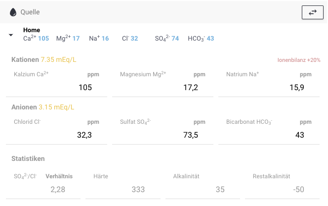 Osmosewasser ist nicht voll entsalzt. Mit irgendeiner Formel habe ich mal mein Osmosewasser anhand meines Leitwertes neu berechnet. Leider finde ich die Formel nicht mehr. Da das aber wohl Korinthenkackerei ist: Allgemein kann man bei den üblichen Drei-Wege-Osmoseanlagen, wie sie bei Aquarianern üblich sind, von diesen Werten ausgehen, die auch in Brew'n Water hinterlegt sind:
