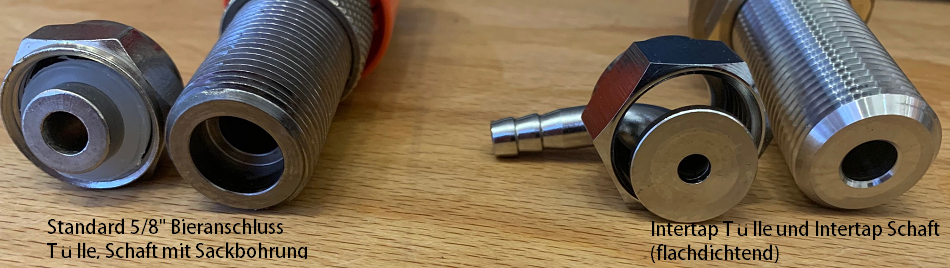 Das Schaftgewinde ist 5/8". Allerdings ohne rückseitige Mulde, so dass man an die Intertaphinterteile keine normalen 5/8" Bierschläuche anschrauben kann. Hier braucht man eine flachdichtende Alternative oder muss versuchen, mit den 6mm Tüllen zurechtzukommen.