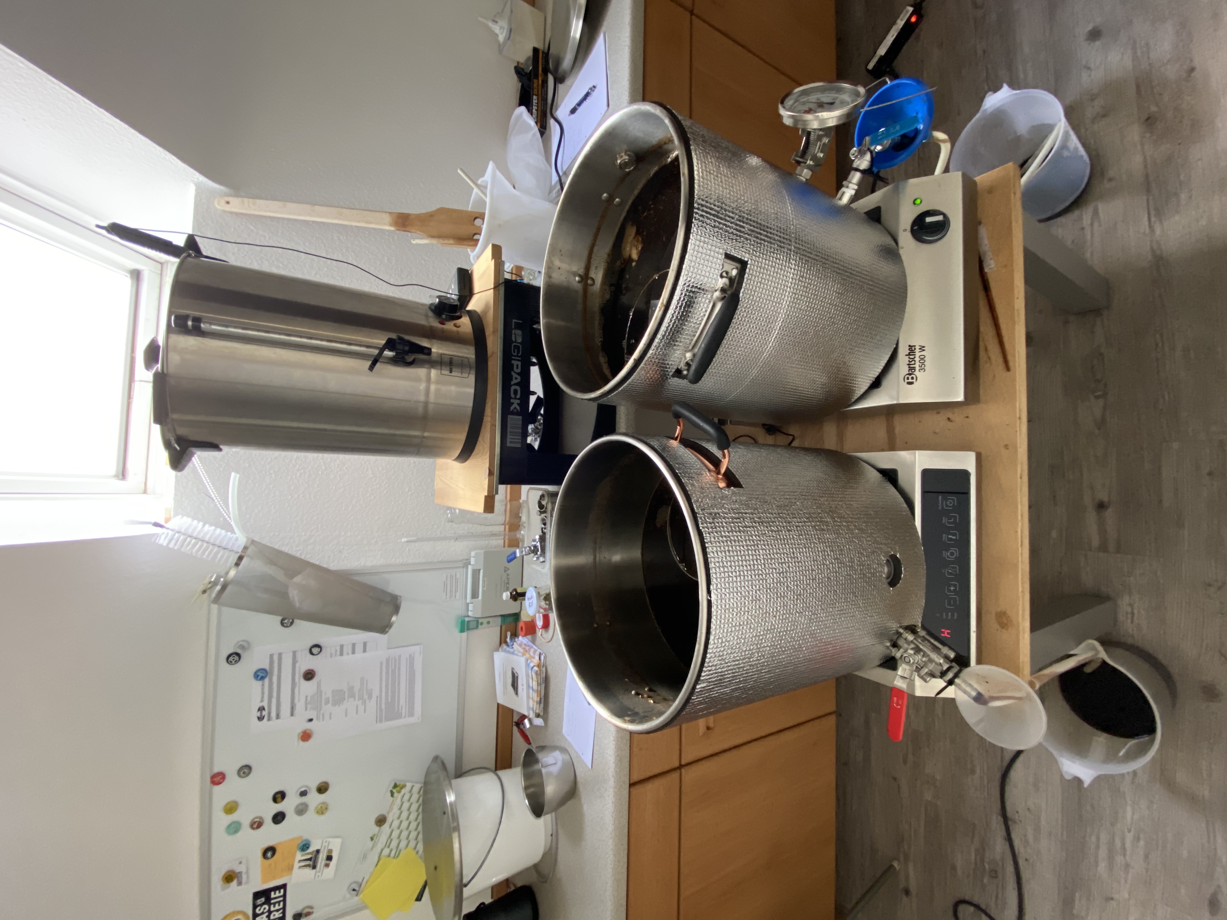 Bei den benötigten 40 Litern, ca. 21 °P und 60 % SHA komme ich auf etwa 15 kg Schüttung (meist liegen wir bei ca. 64 %, der Rest ist Sicherheit). Wir haben zwei 38 Liter Töpfe und zwei Induktionsplatten und würden parallel in zwei Töpfen maischen. Einmal mit Rührwerk und einmal handgequirlt. Zum Kochen wird die Würze dann in einen geborgten 70 Liter Topf gegeben, der mit unserem Gasbrenner gefeuert wird. Bei der angegebenen Kochzeit von 180 Minuten können wir ja mit 10 - 20 Litern anfangen und dann immer was dazugeben. DMS sollte da ja kein Thema sein. Wir kochen dann solange, bis die Stammwürze passt.