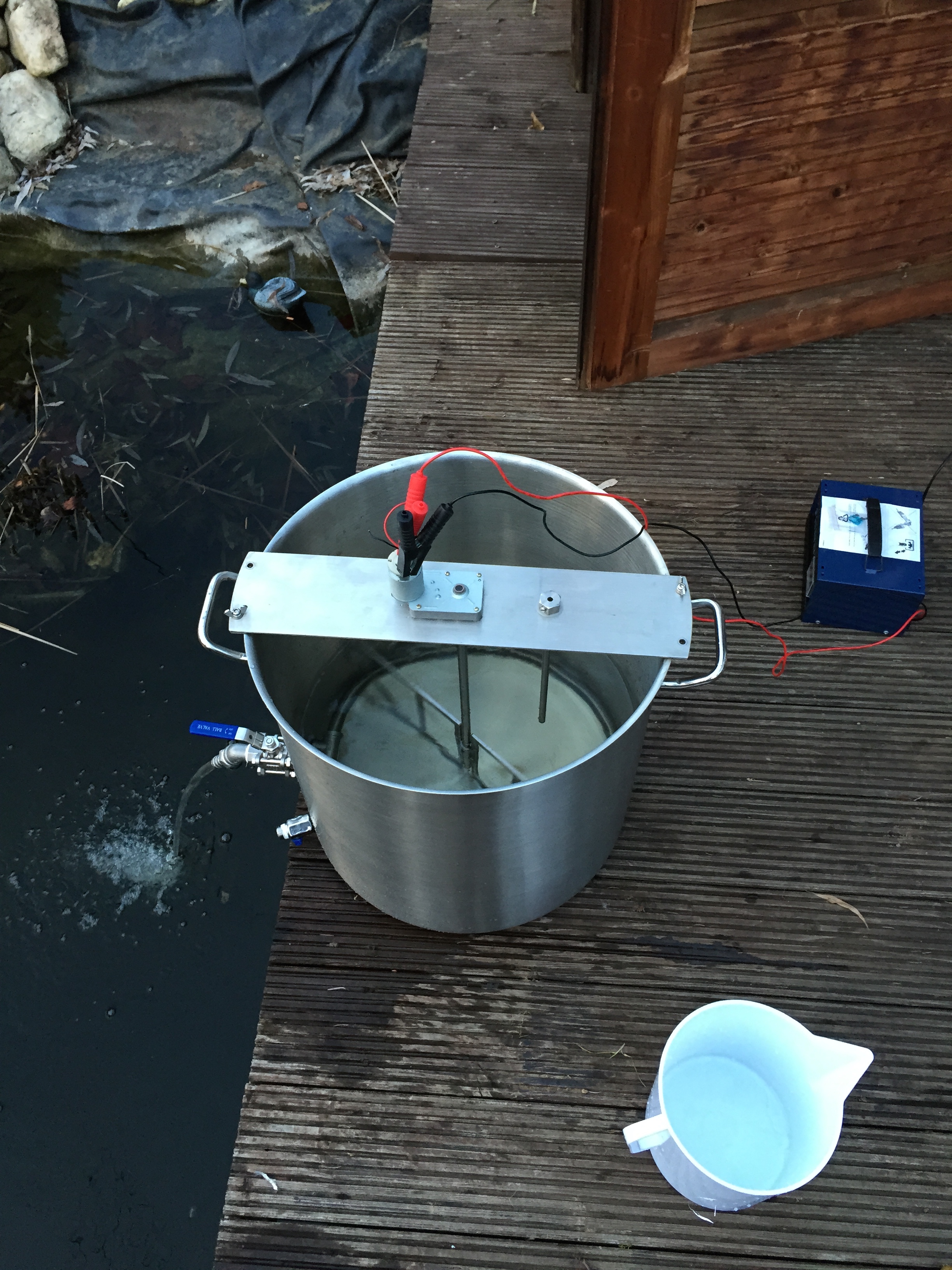 Potenzialausgleich heißt das Zauberwort. Dabei ist es wichtig alle Elktrisch leitfähigen Teile auf ein Potenzial zu legen. In der Praxis heißt das alles sicher zu verbinden. Rein Theoretisch kann ich die Rührwerksprobleme darauf zurückschließen dass die Rührwerke verpolt wurden um die Drehrichtung zu ändern. Da Herstellerseitig die Wellen der Scheibenwischermotore auf den Minus gebrückt sind. Durch die Verpolung wurde dabei der Plus auf das Rührwerk/Welle gelegt. Da der Topf auf der Gerdplatte steht ist dieser geerdet. Im Netzgerät könnte der Minus ebenfalls auf Erde gelegt sein. Nun habe ich durch die Verpolung + auf dem Rührwerk und - auf dem Topf, fertig ist das Galvanisationsbad. Die säurehaltige Maische ist der Träger. Dann kommen unterschiedliche Metalle zum Einsatz. Dadurch wandern Elektronen ab und verändern die Oberfläche des Anderen Metalls.