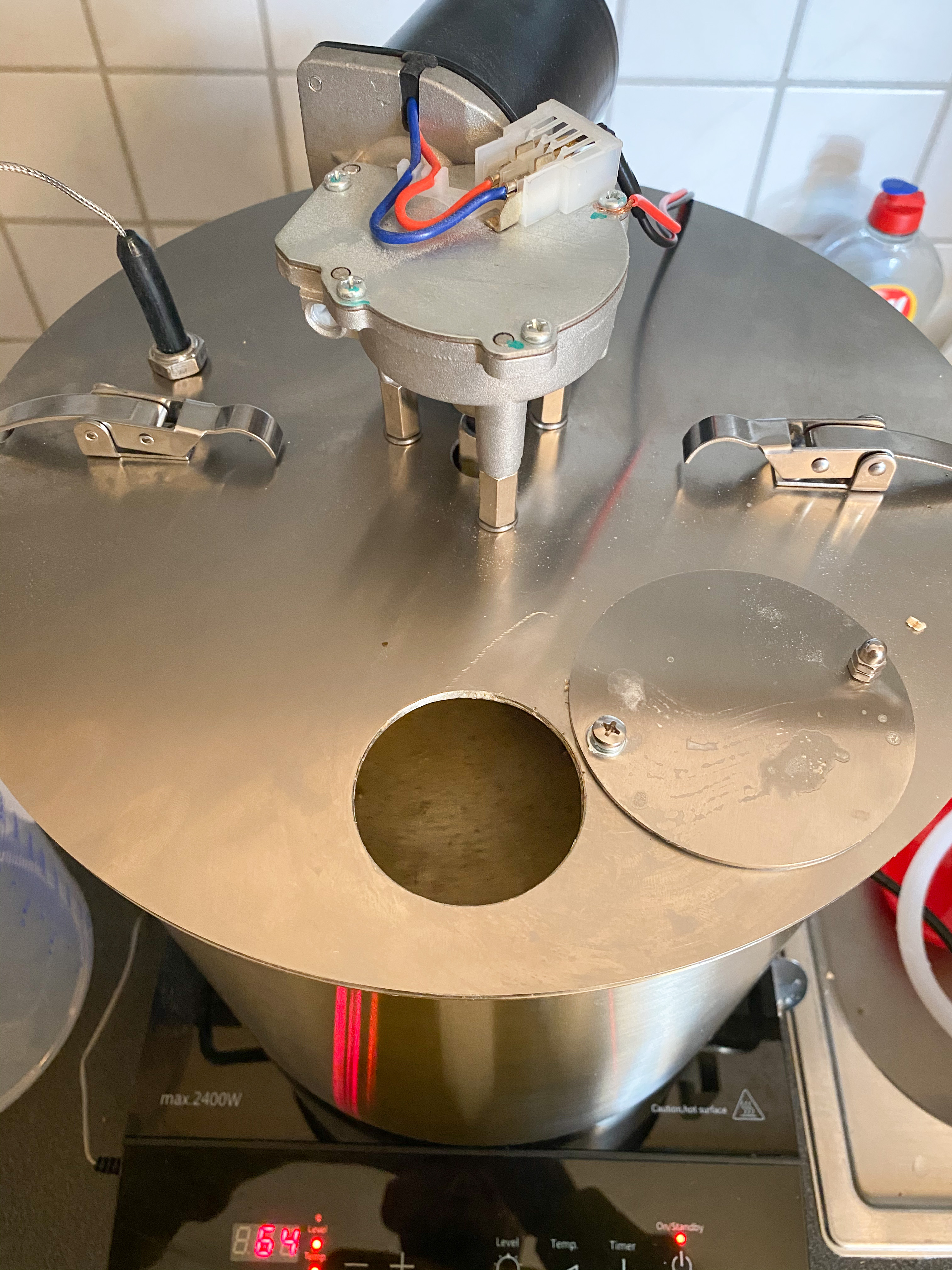 Zum Heizen verwende ich eine Caso TC2400. (B-Ware neu 65€) Diese hat eine Sous Vide Funktion mit externem Temperaturfühler, den ich durch das Rührwerk direkt in die Maische führe. Die Temperatur und Kochzeit (Rastzeit) lässt sich vor der jeweiligen Rast auf Grad C und Minute genau einstellen. Für das Rührwerk habe ich den allseits bekannten Scheibenwischer Motor auf eine Edelstahlronde (Stückpreis 14€) montiert, welcher über eine weitere Gewindestange das Rührwerk antreibt. Insgesamt ähnelt dies den bestehenden Vatianten der bekannten Hersteller, nur eben komplett selbst gebaut. Das Malz wird beim Einmaischen über einen breiten Trichter in die verschließbare 50mm Öffnung eingefüllt.