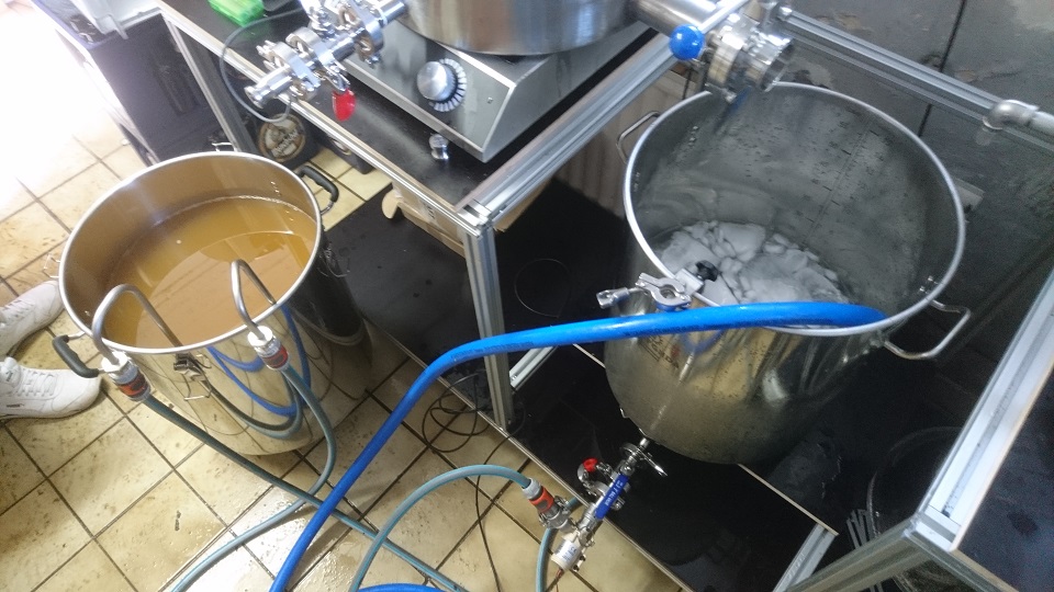 Nach dem Wirlpool durch Monofilament in Gärbottich. Erst kühlung mit Leitungswasser, dann mit Eiswasser auf 11°C.