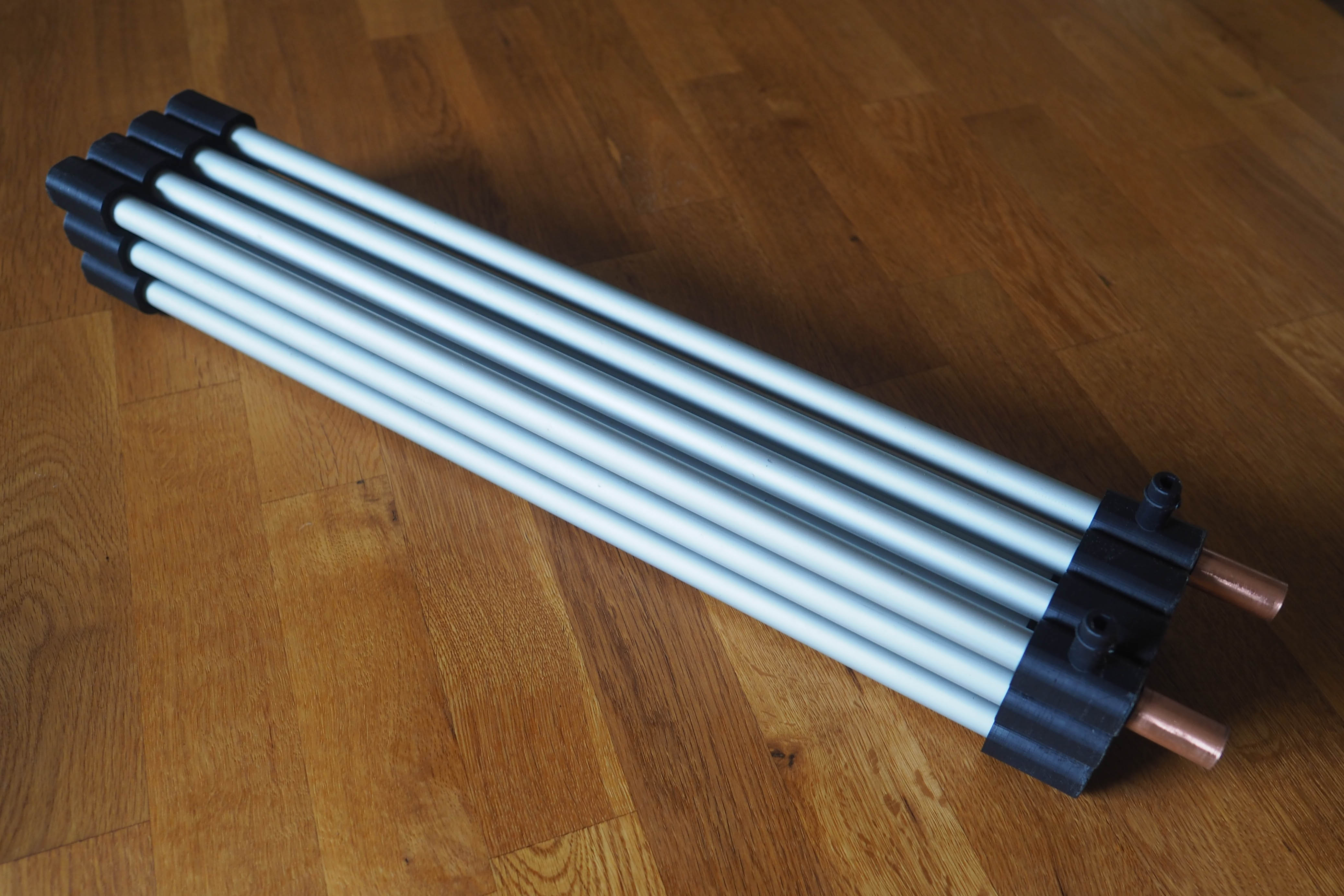 Ich habe mir gerade einen Gegenstromkühler gebaut. Er besteht aus 10x1mm Kupferrohr, 15x1 Al Rohr und gedruckten Endplatten. Das ganze ist mit O Ringen abgedichtet. Gedruckte Teile halten 120° aus. Habe 6m Kühllänge. Aufbau siehe Bilder. Finde den Kühler sehr Kompakt.