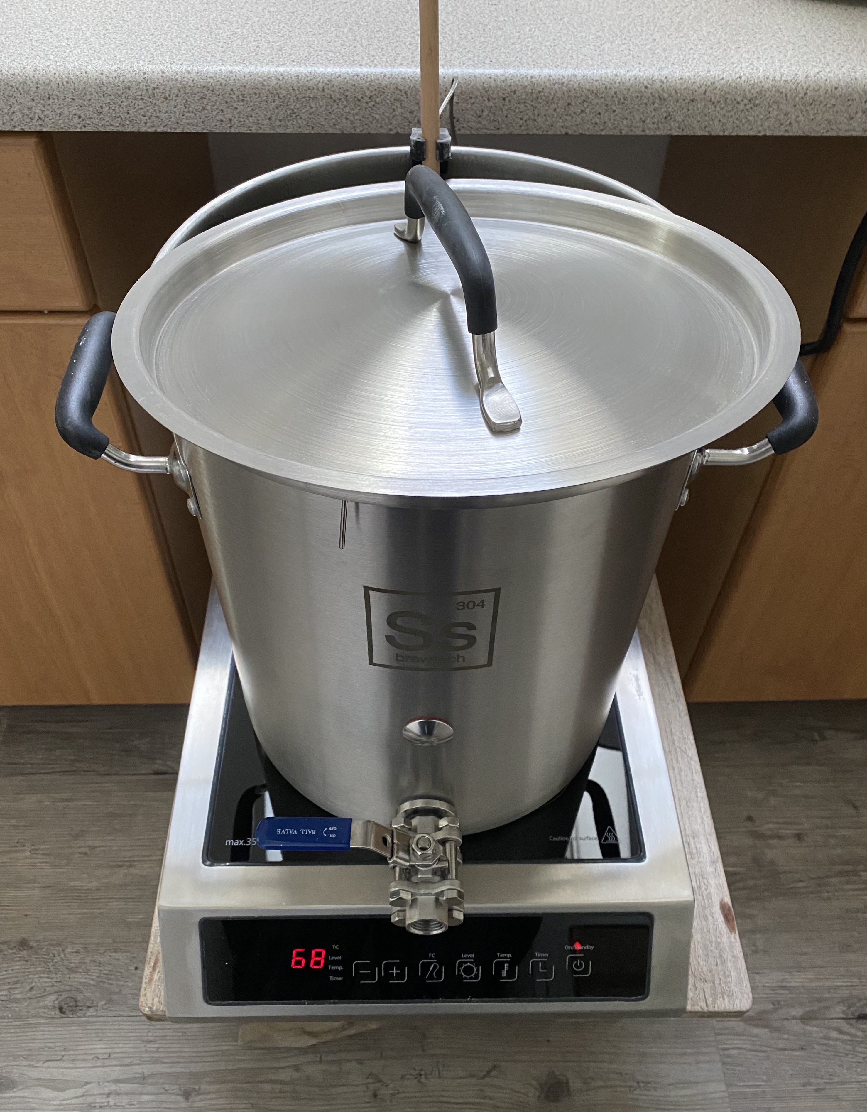 Das Problem war, dass wir für ein 40-Liter Fass mit 43 Litern Ausschlagvolumen kalkuliert haben (bei 60 % SHA, normalerweise schaffen wir etwas mehr). Unsere "Anlage" ist auf 20 - 25 Liter ausgelegt. Also haben wir die Würzepfanne zum Maischkessel umgebaut (zweite Läuterhexe besorgt) und uns einen großen Topf besorgt, um die Würze zu kochen. Der sollte 70 Liter haben, hatte dann aber 150 oder mehr. Die "Zweizylinderanlage" funktionierte aber nicht schlecht. Eine Induktionsplatte mit Temperaturregelung und Rührwerk, die zweite handgesteuert und handgerührt.