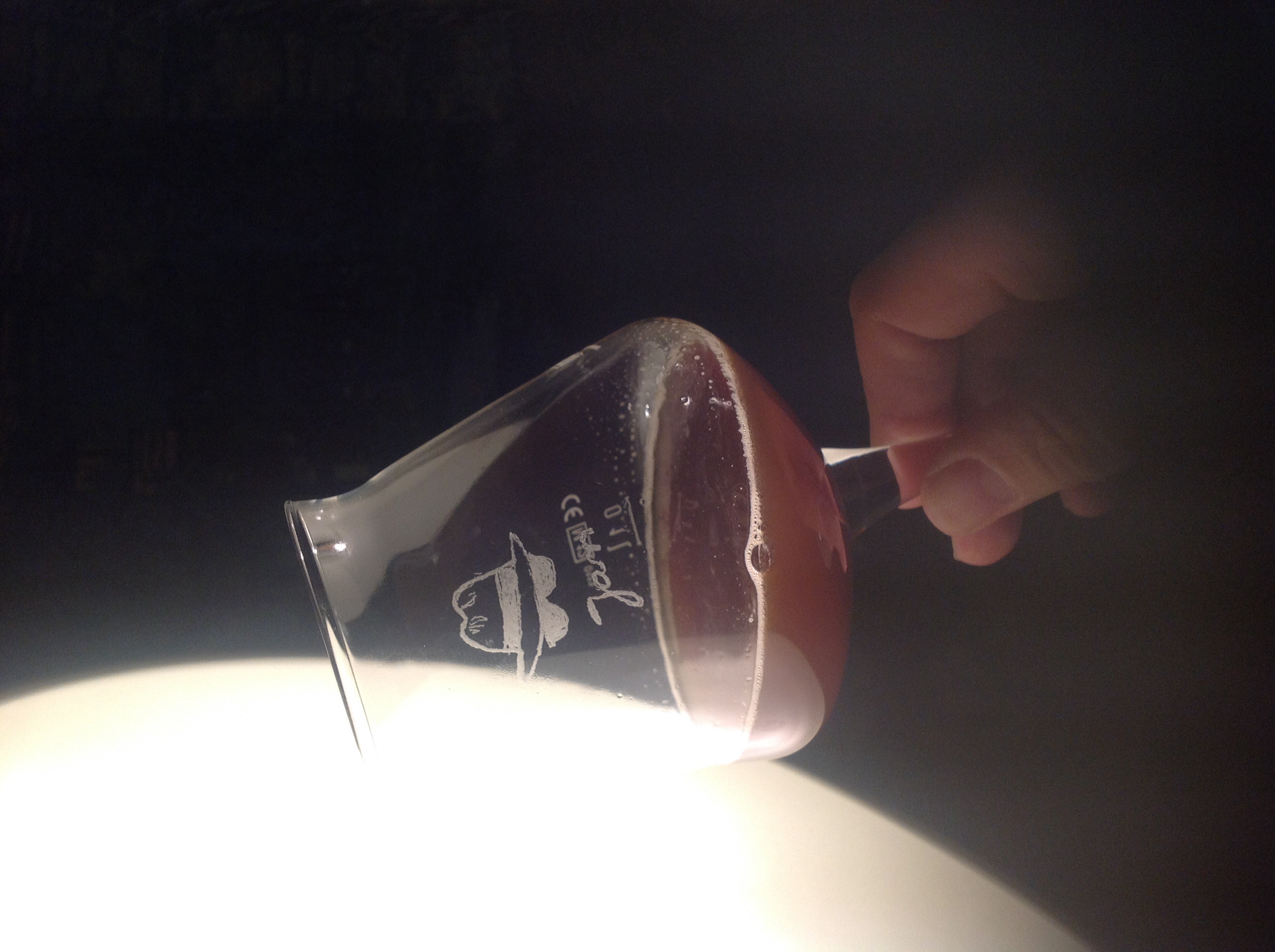 Die Farbe passt schon mal. Der Geschmack entwickelt sich auch gut, obwohl natürlich noch die Menge an Hopfen mächtig Platz macht. Ist ja aber auch noch nicht fertig