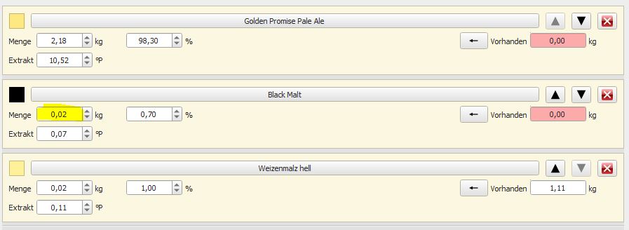 Wirklich eingeschränkt hat mich, dass ich beim "Black Malt" mit 1300 EBC, was im Rezept für die Bierfarbe zuständig ist, nur in 10g Schritten eingeben kann. Die Schüttung (bzw in diesem Fall wohl eher Prise) vom Black Malt müsste hier in der Mitte bei 16g liegen. Gehe ich auf 10g wird das Bier ne ganze ecke heller, bei 20g ne ganze Ecke dunkler. Bei einem 11,5 L Sud und solch einem Farbmalz macht das ordentlich was aus.