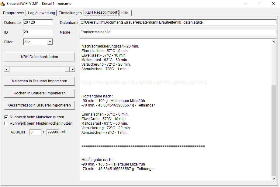 kannst du mal bitte prüfen, ob du Hopfengaben bei neu angelegten Suden im KBH (Version 2.3.0) mit der Datenbankversion 2006 in deine Brausoftware übertragen kannst? Bei mir klappt das nur mit Vorderwürzehopfengaben. Hopfengaben bei Kochbeginn, Kochen, Kochende und Ausschlagen werden nicht übertragen. Bei bestehenden Suden im KBH hingegen ist die Übertragung in Ordnung.